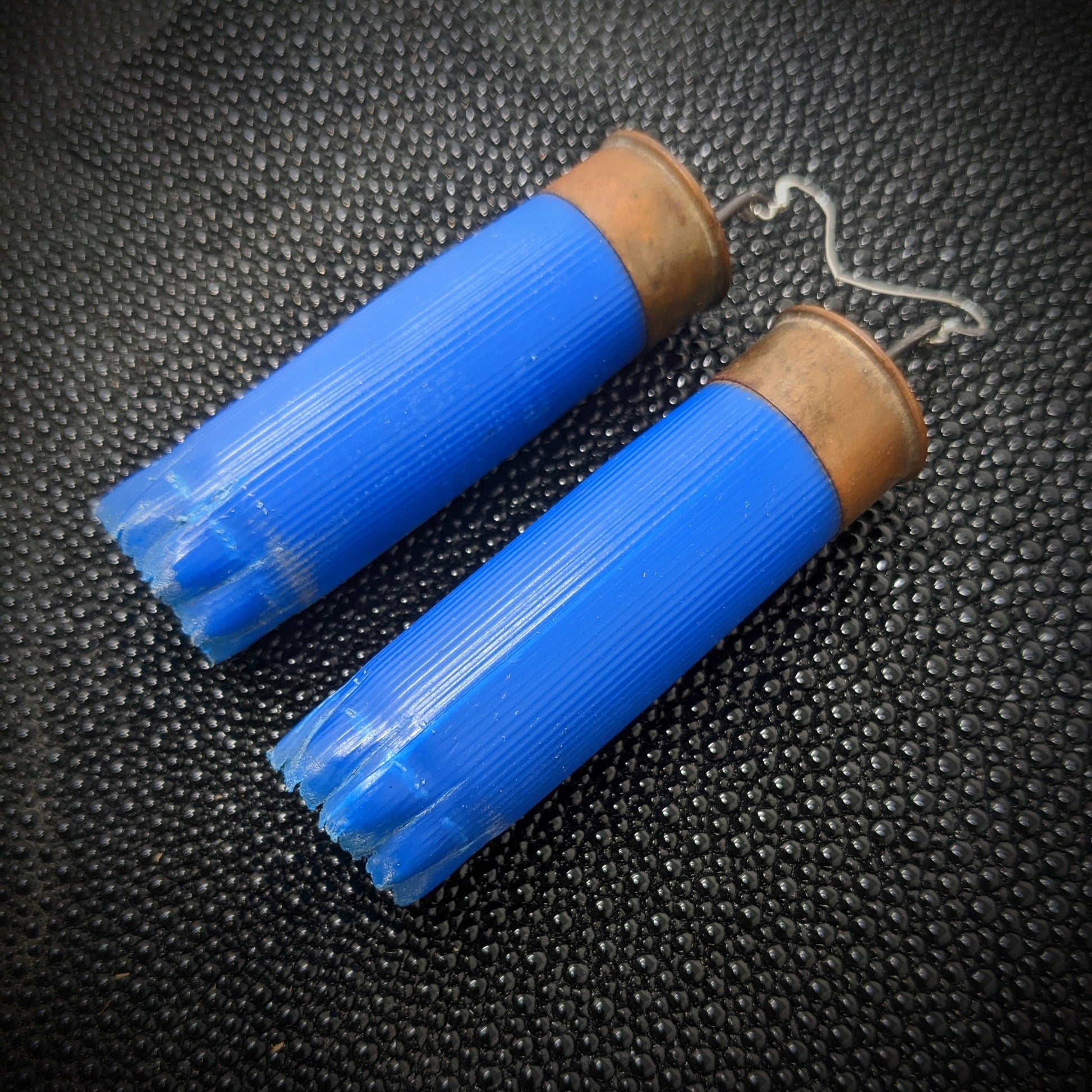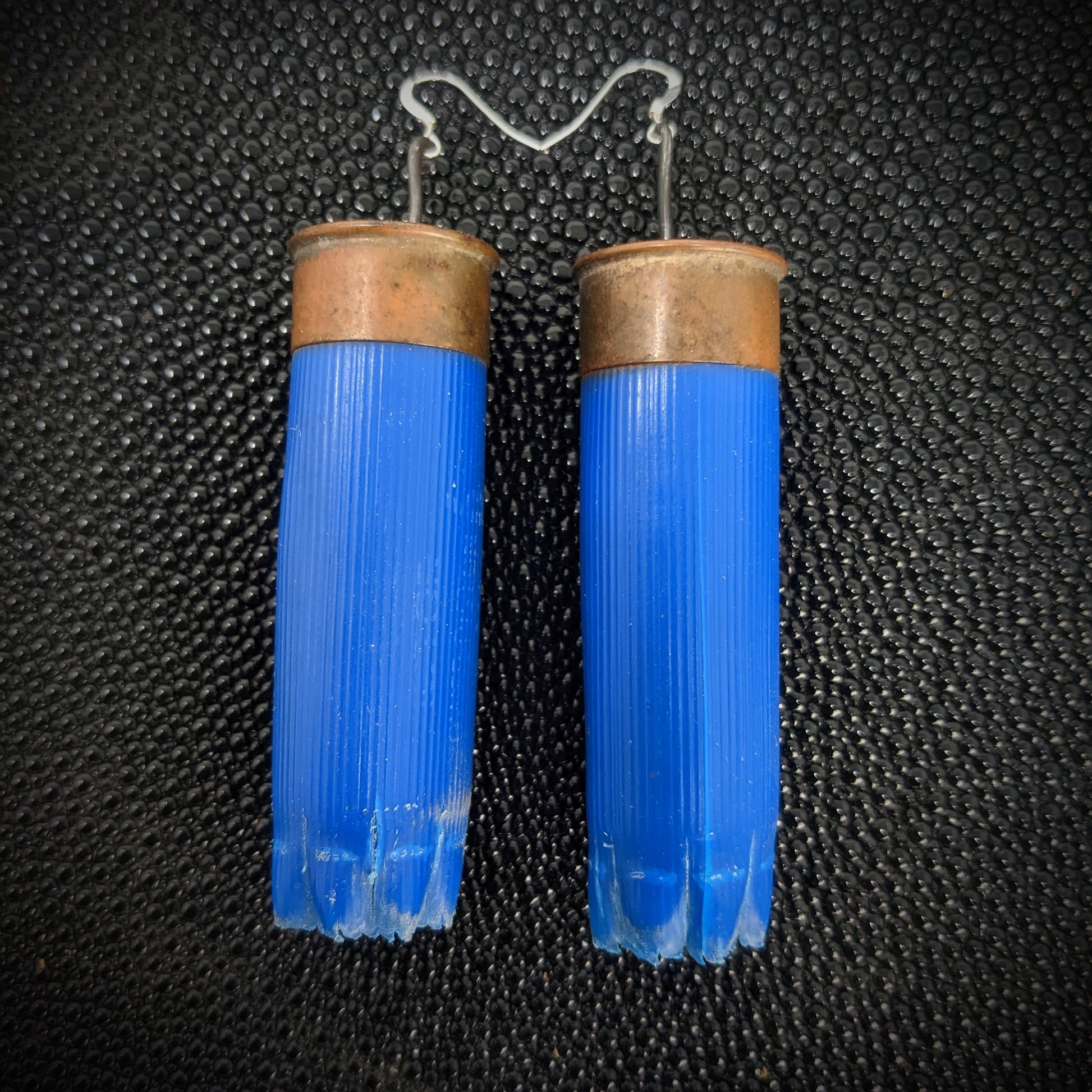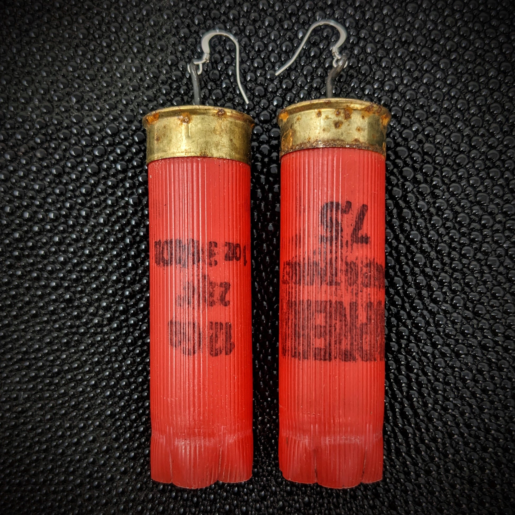 I make these recycled earrings out of found 12 gauge shotgun shells. These deceivingly lightweight earrings are an awesome, big and colorful statement or costume piece. They are the largest and lightest of my bullet earrings.