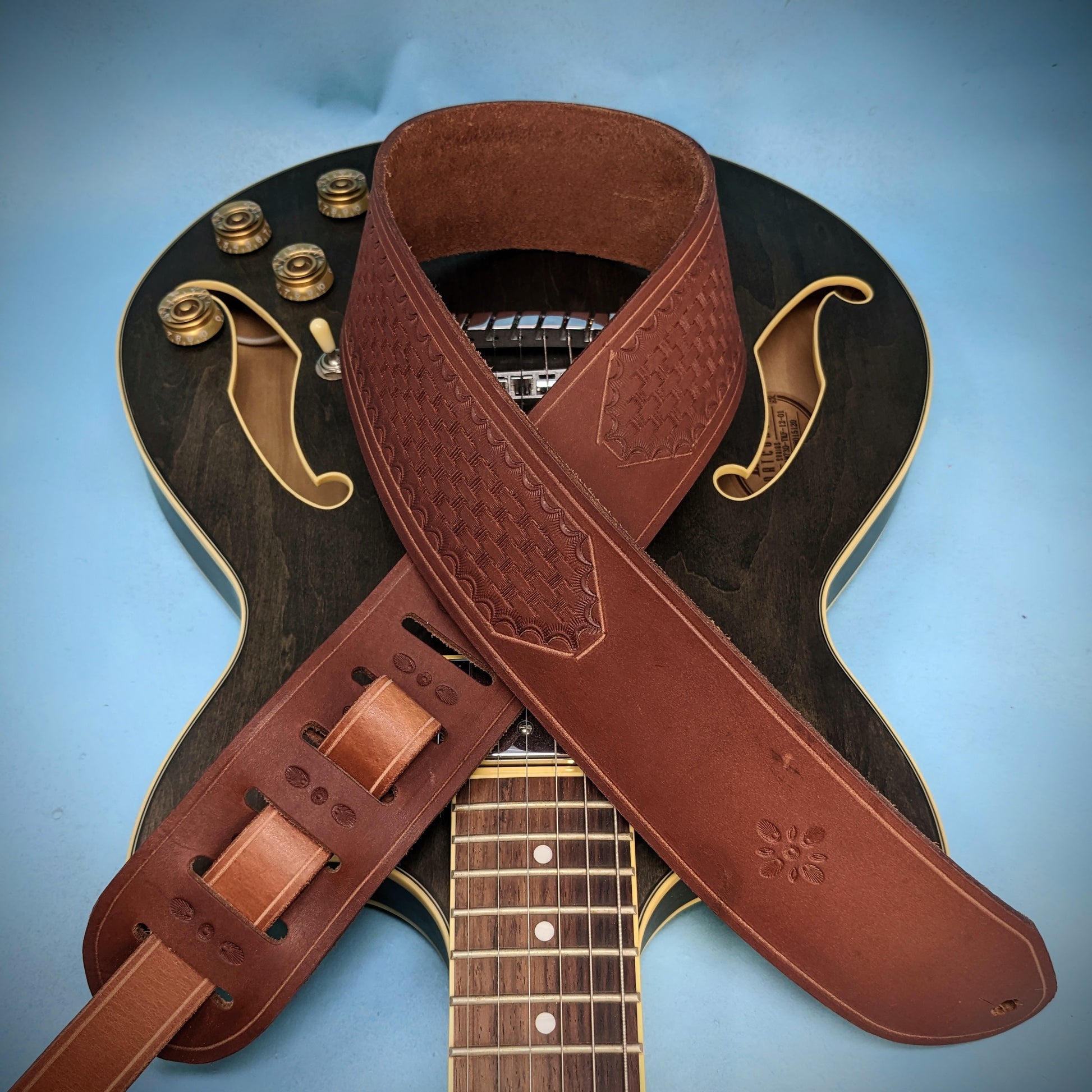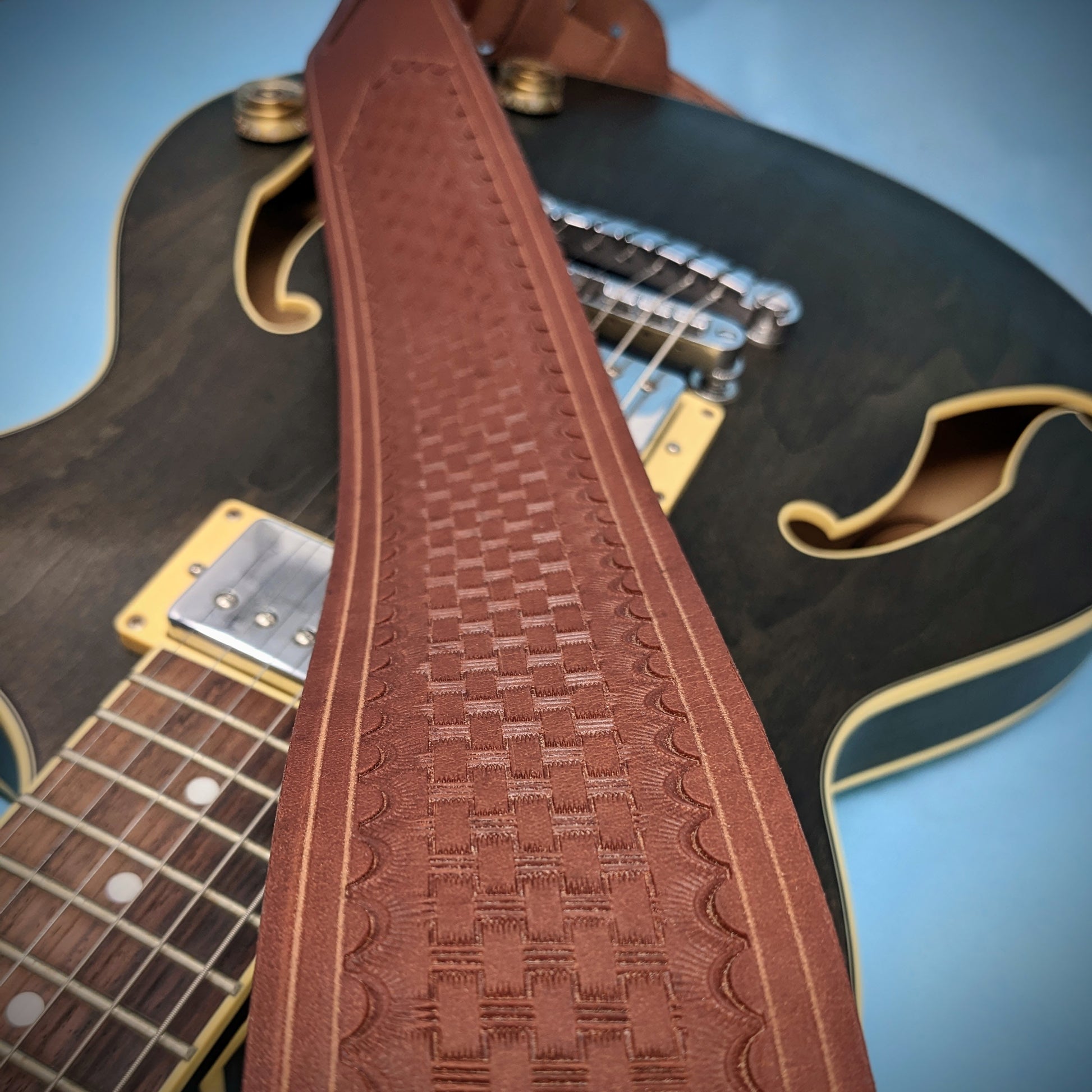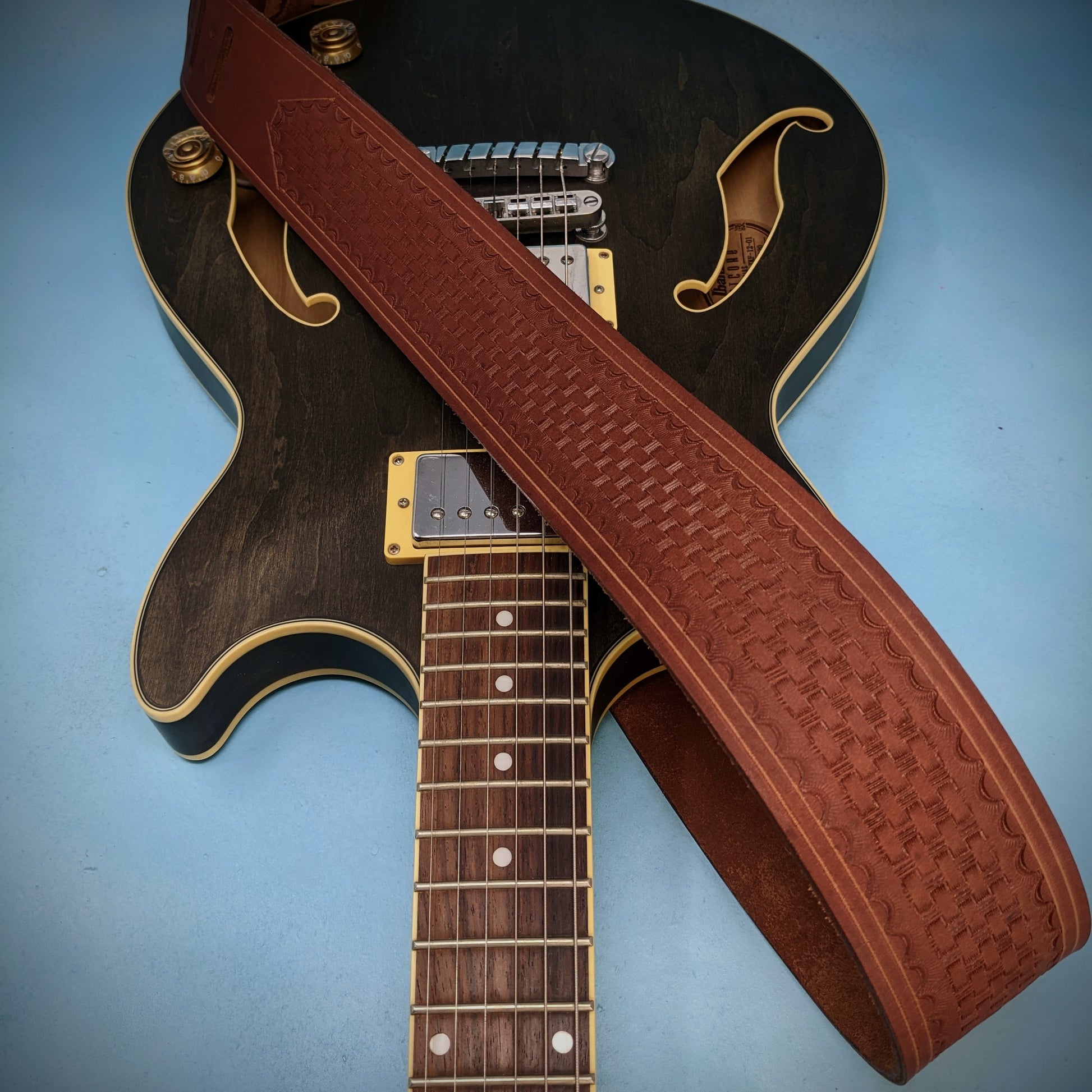 Hand made, one of a kind leather guitar strap. This high quality guitar strap features a basket weave pattern on soft, sturdy, veg tan leather and is finished with natural oil. This strap is perfect for both electric and acoustic guitars.