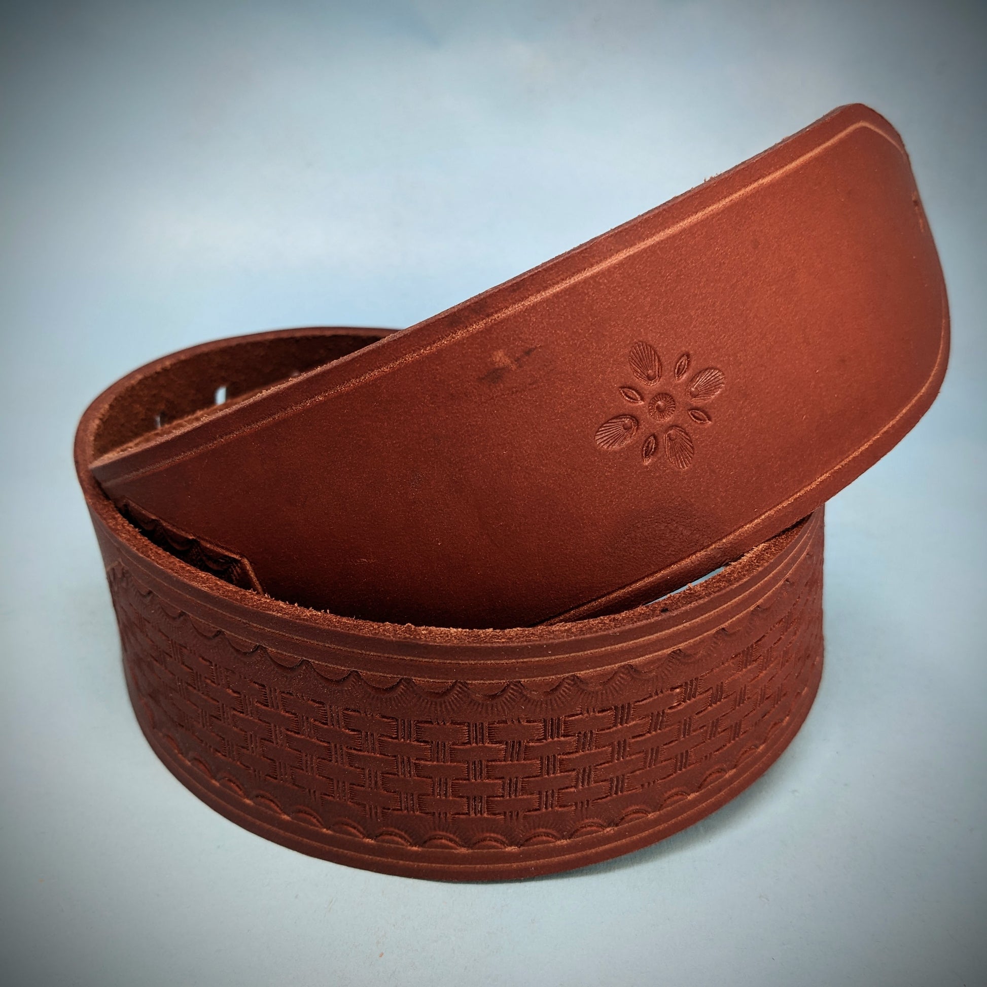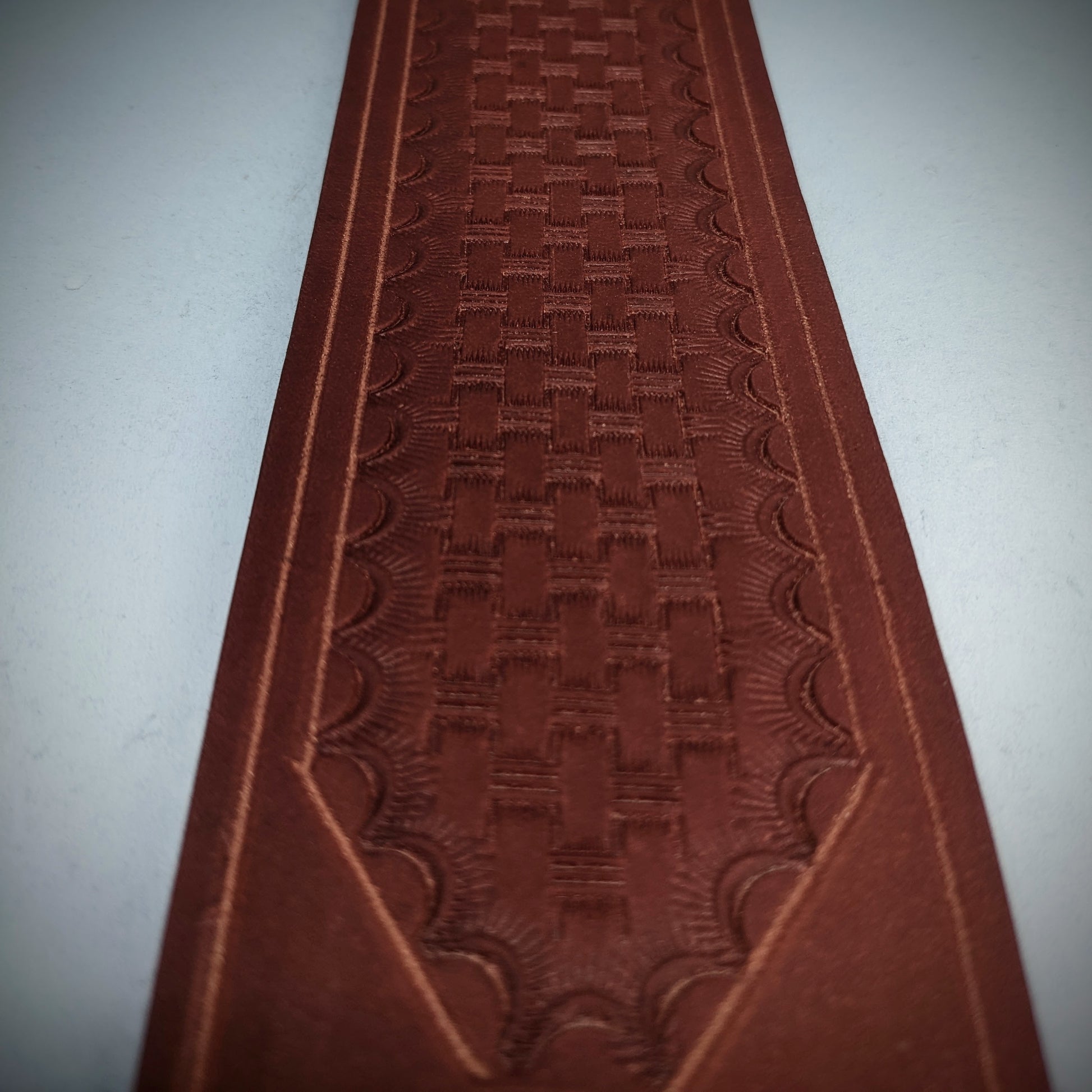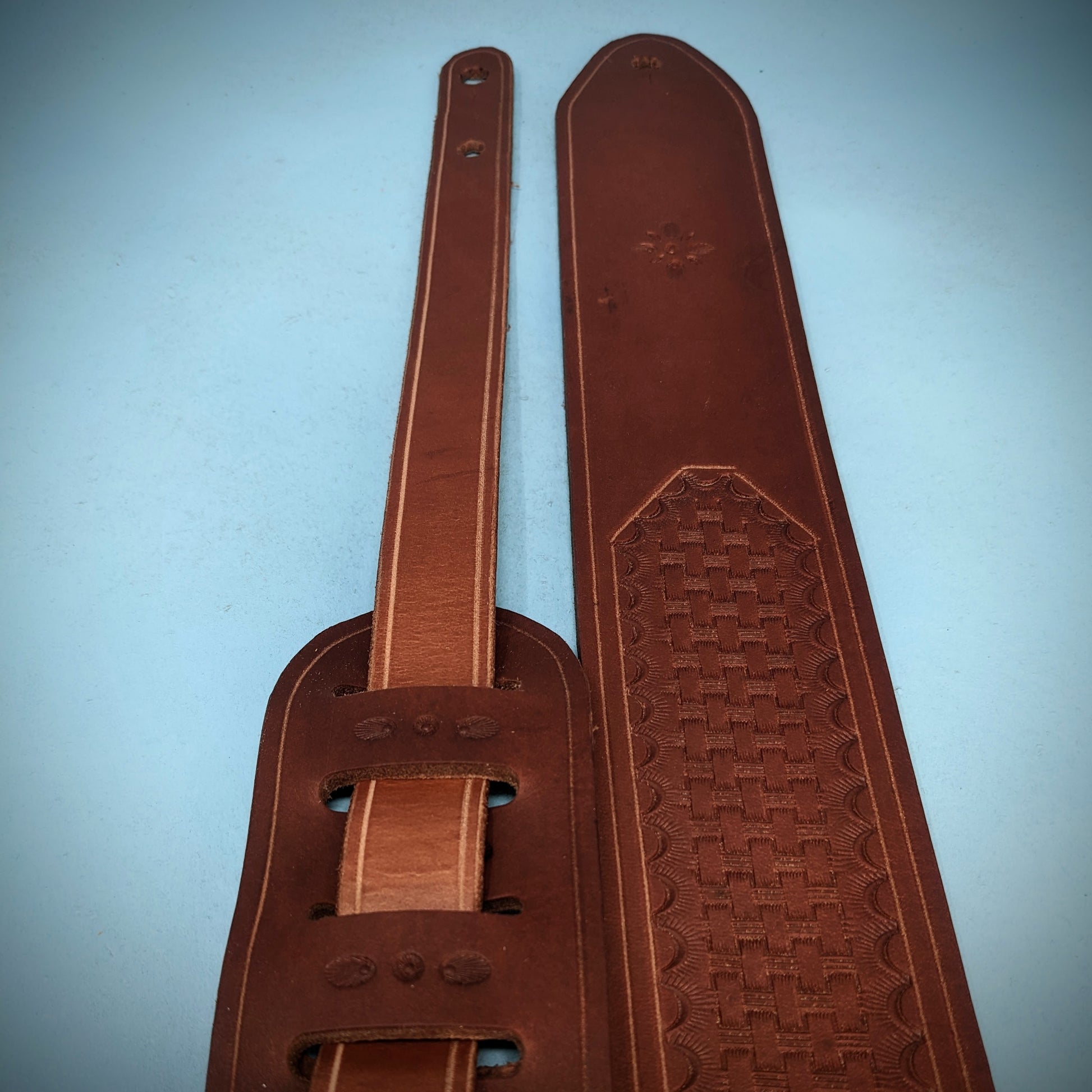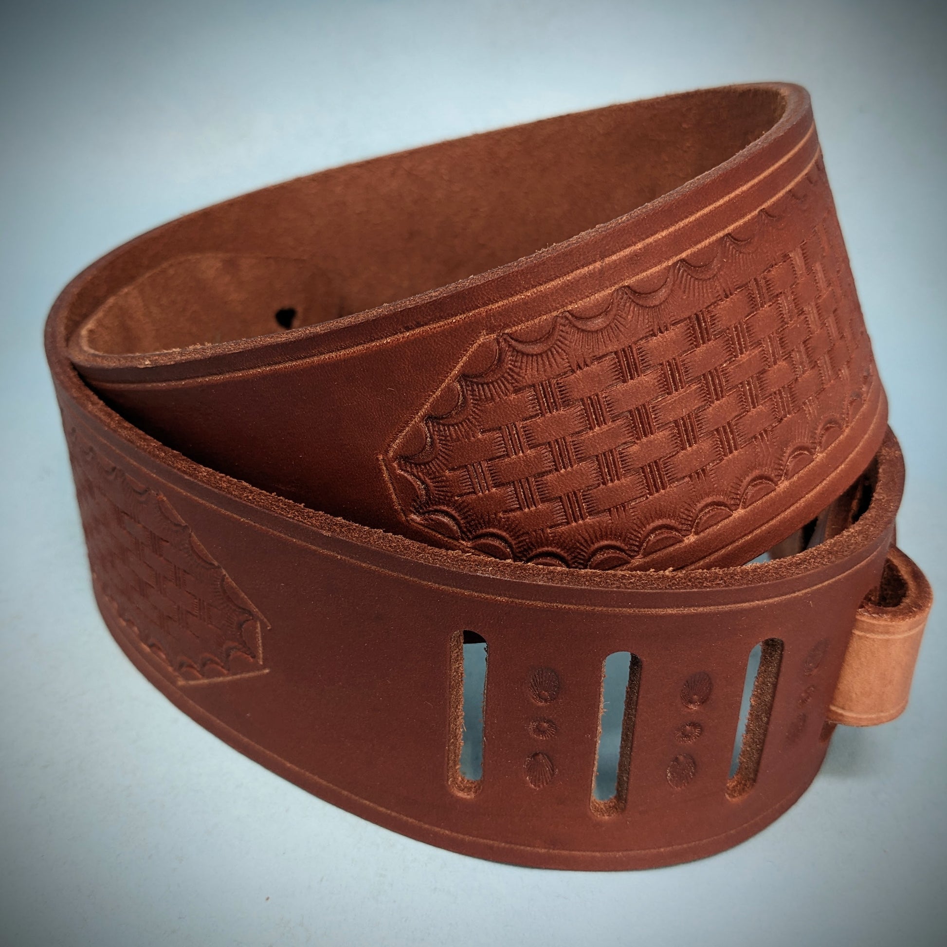 Hand made, one of a kind leather guitar strap. This high quality guitar strap features a basket weave pattern on soft, sturdy, veg tan leather and is finished with natural oil. This strap is perfect for both electric and acoustic guitars.