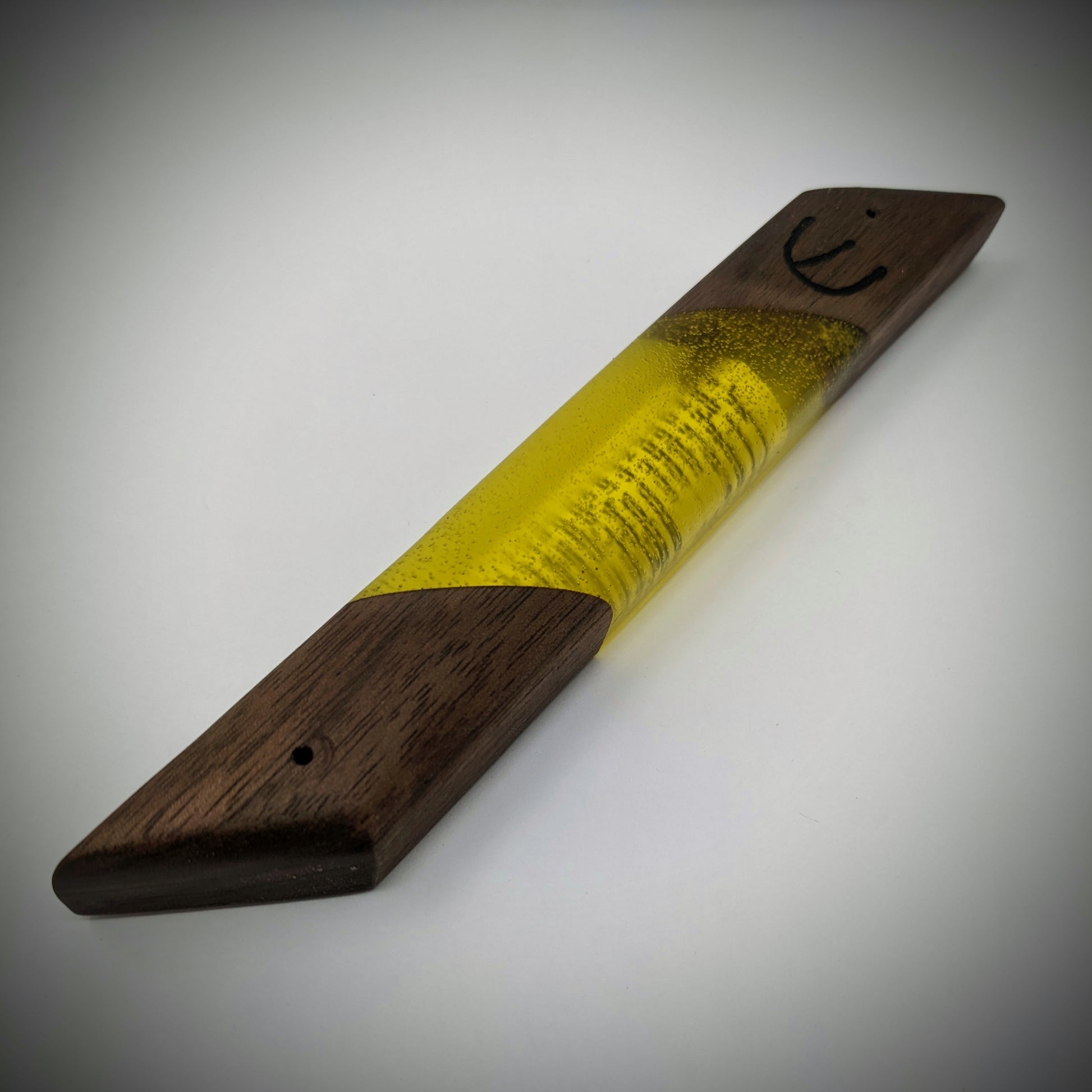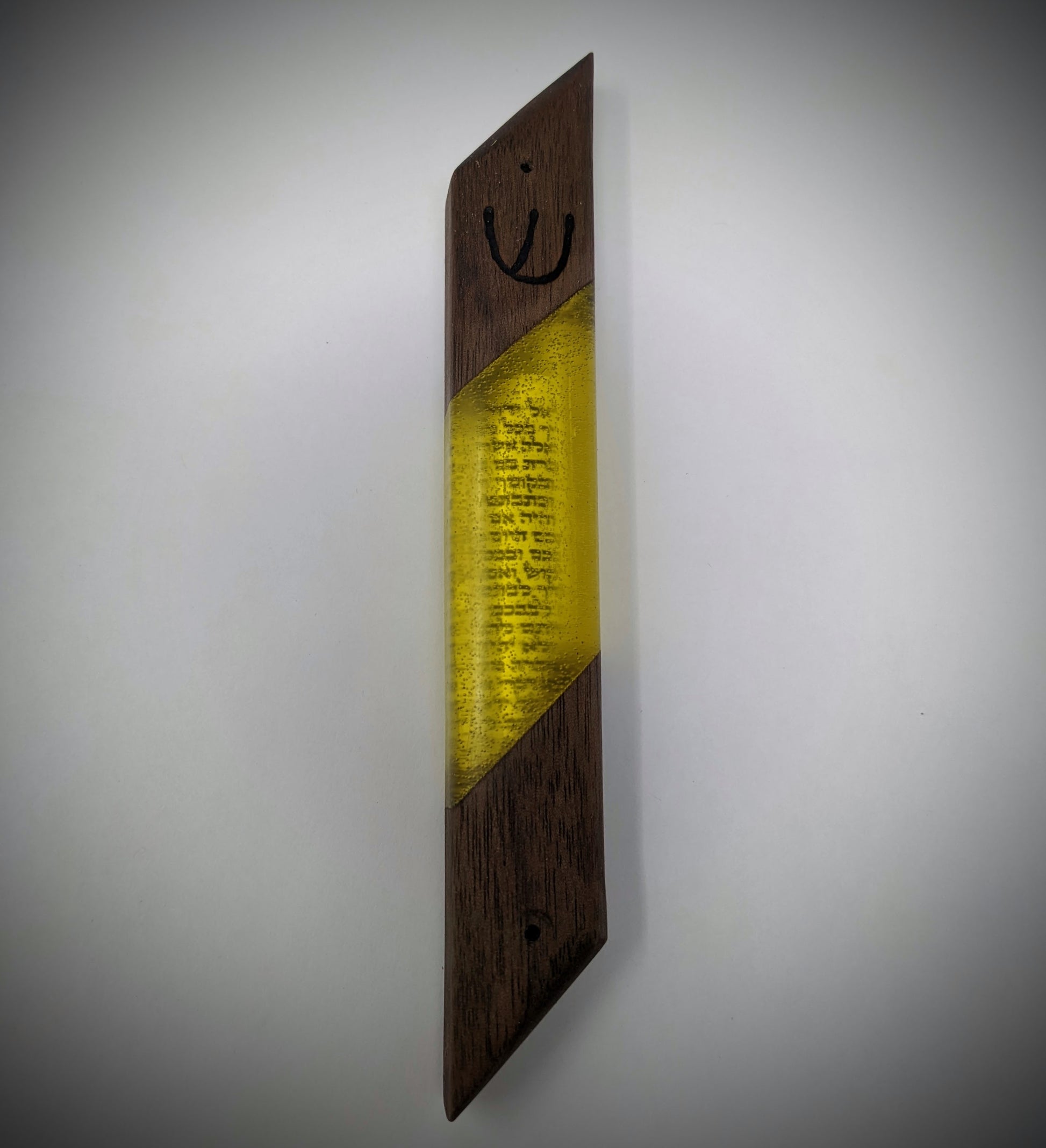 My signature hardwood and resin "window" mezuzah case is a perfect addition to any Jewish household. This one-of-a-kind mezuzah is made from walnut wood and vibrant, bright yellow resin. The clear resin allows you to see the scroll inside! A perfect gift for Bar/ Bat Mitzvah's, holidays, weddings or any other occasion. My mezuzot are all finished with natural beeswax and citrus oil.