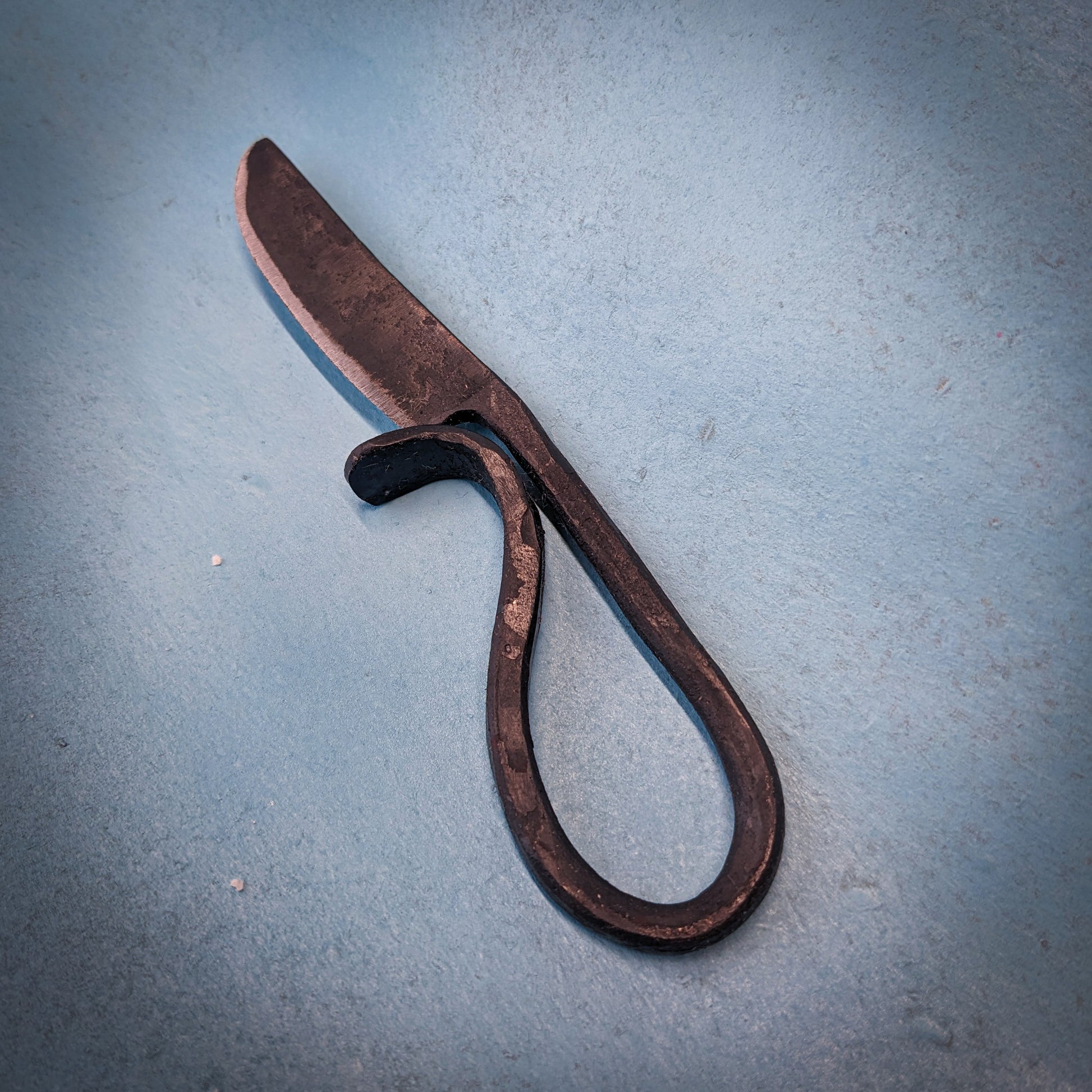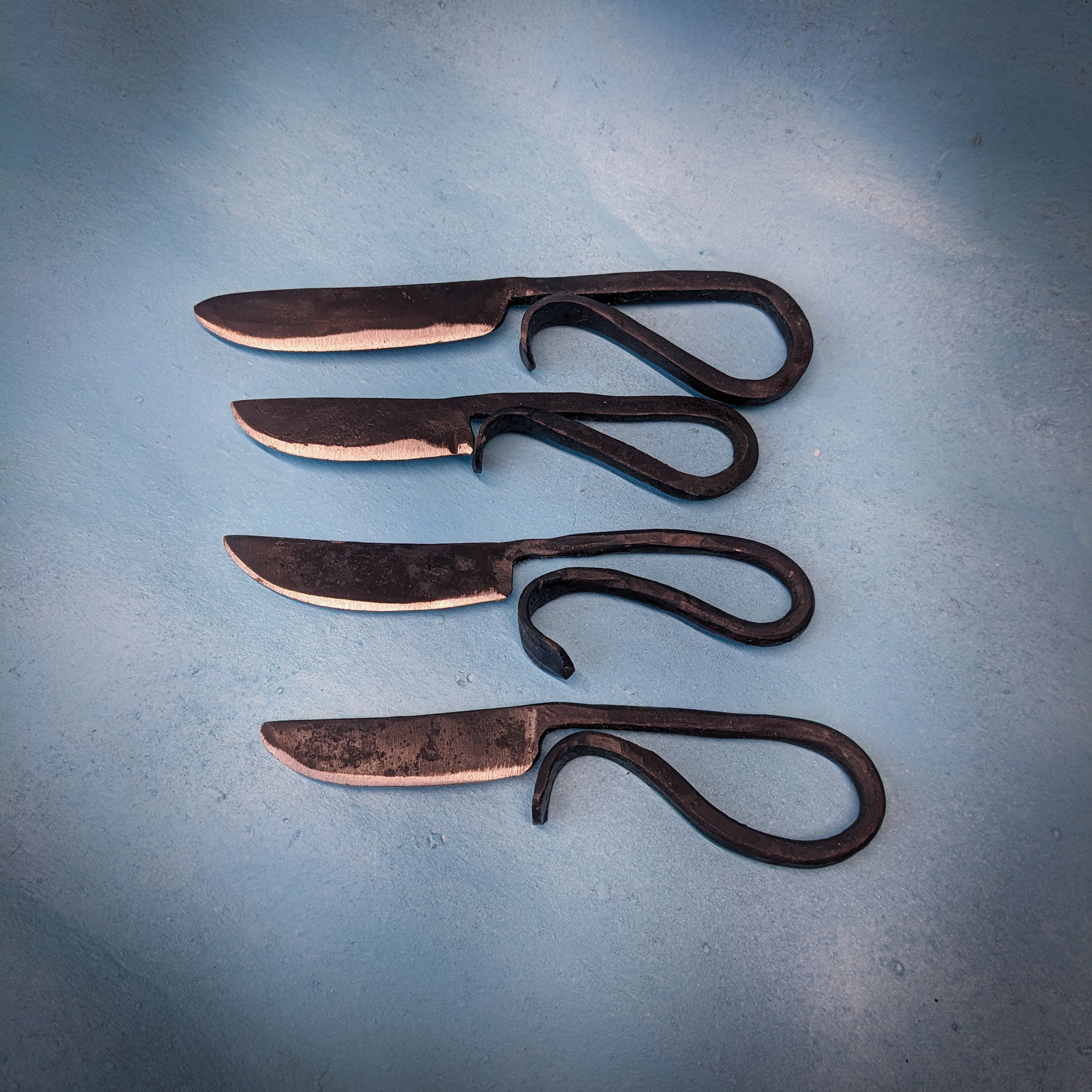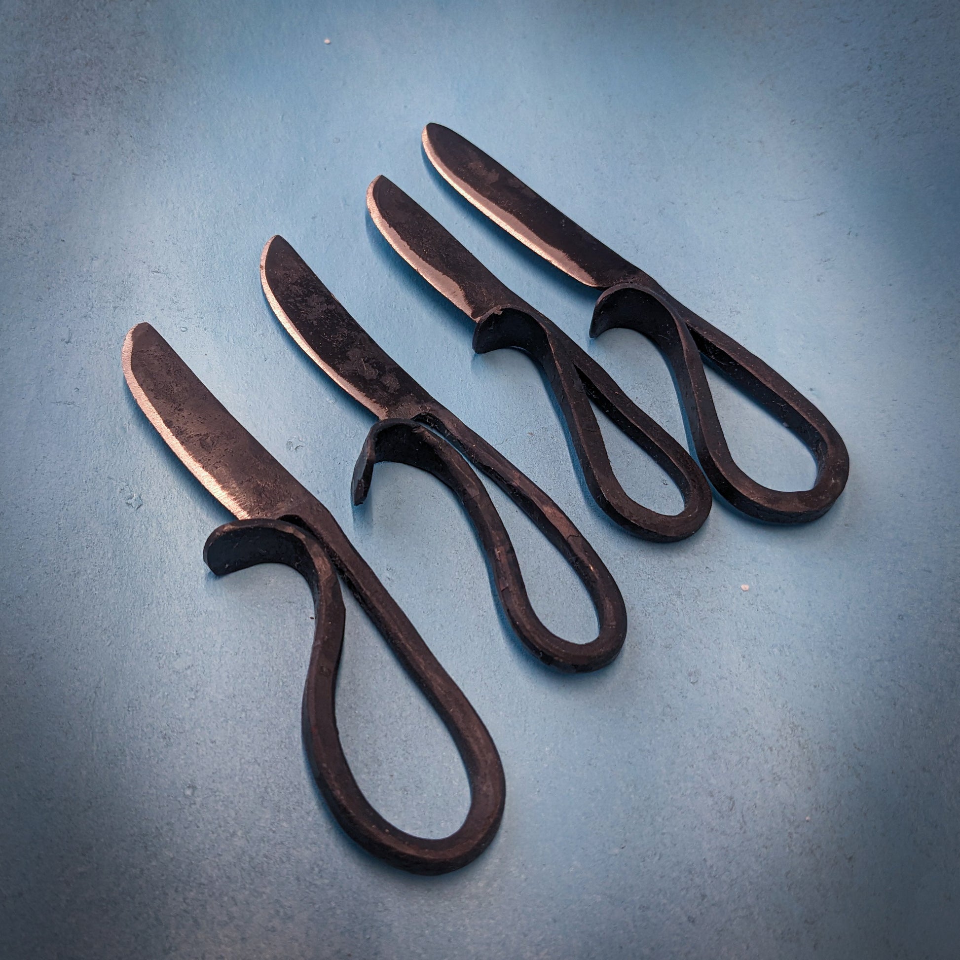 These blacksmith's cheese knives are a fantastic addition to any serving tray. They are sharp, sturdy, unique and add a traditional and rustic flare to your charcuterie board or afternoon snack. I forge them completely by hand and finish them with a food safe oil to prevent rust. They are approximately 5" in length over all.