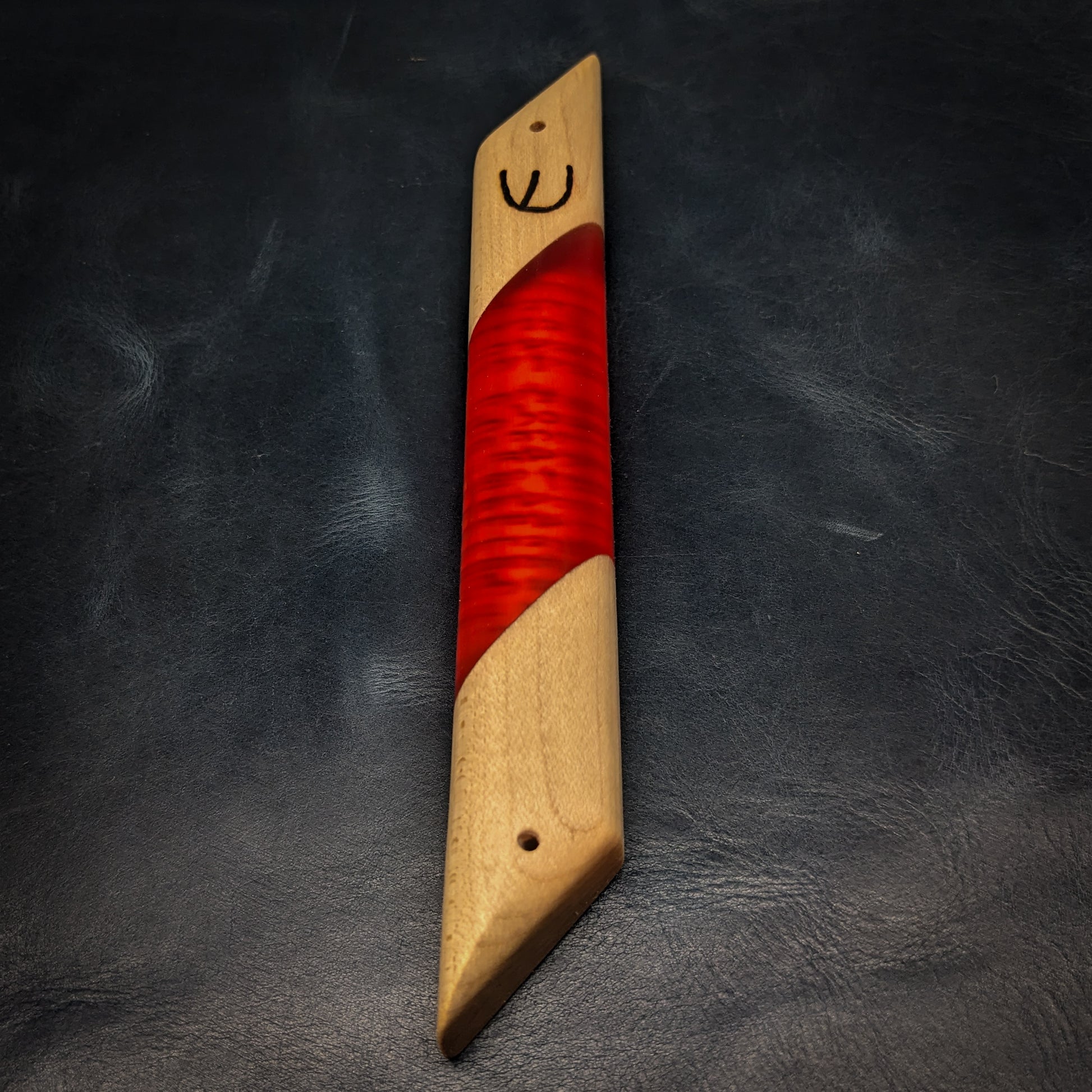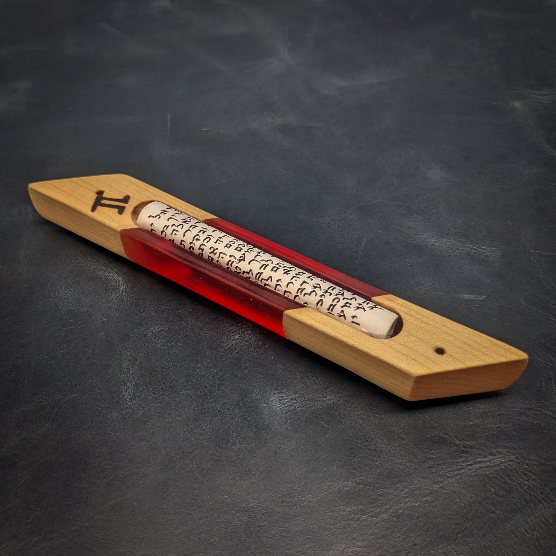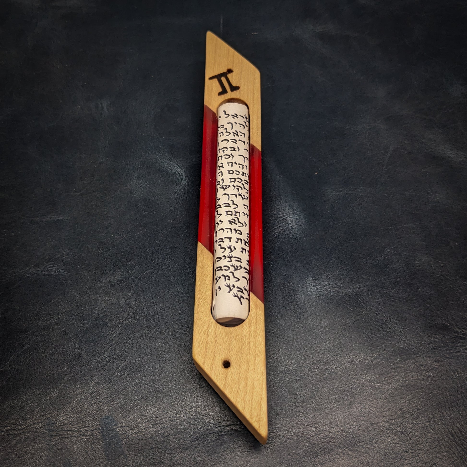 My signature hardwood and resin "window" mezuzah case is a perfect addition to any Jewish household. This one-of-a-kind mezuzah is made from hard maple and and red resin. The clear resin allows you to see the scroll inside! A perfect gift for Bar/Bat Mitzvah's, holidays, weddings or any other occasion. My mezuzot are all finished with natural beeswax and citrus oil.