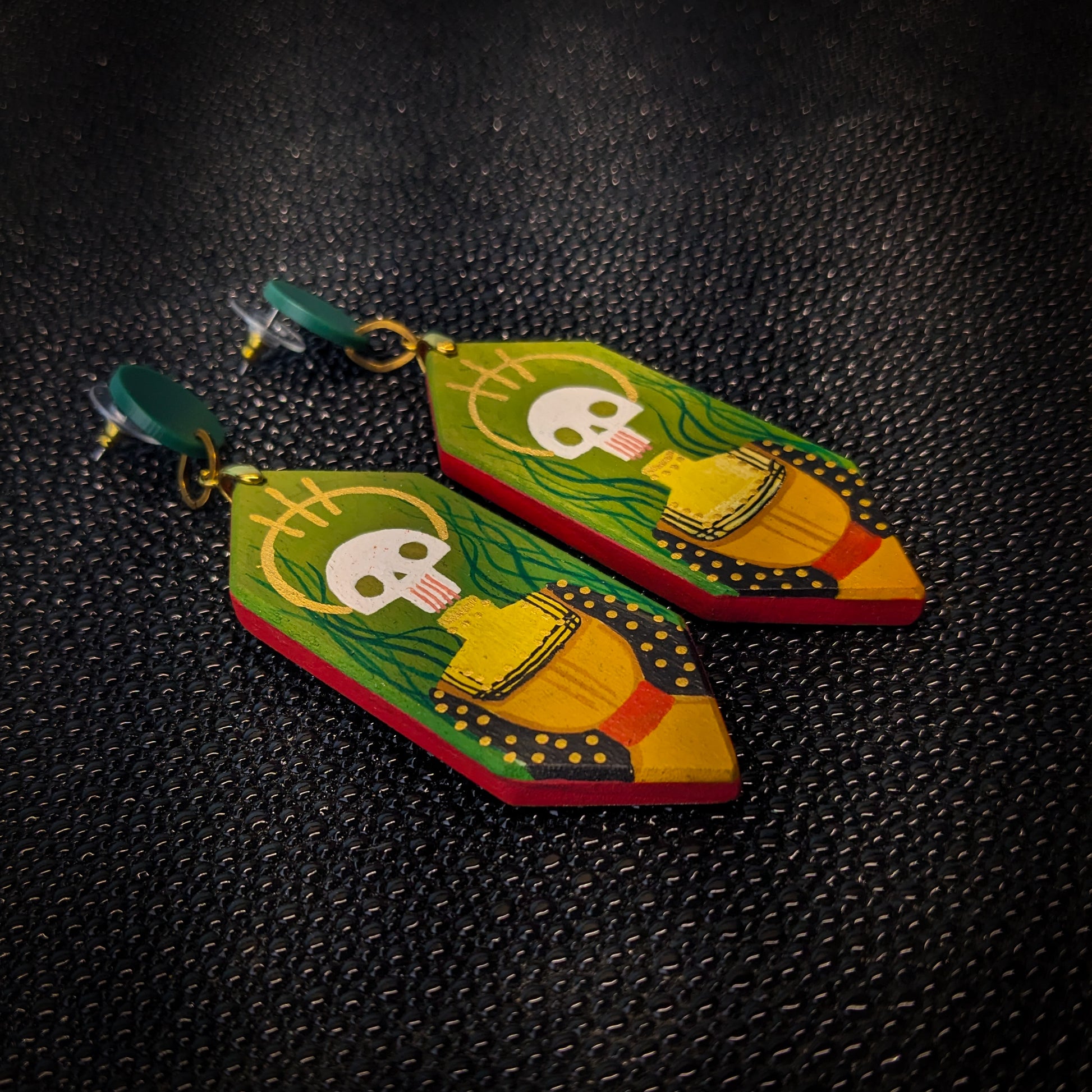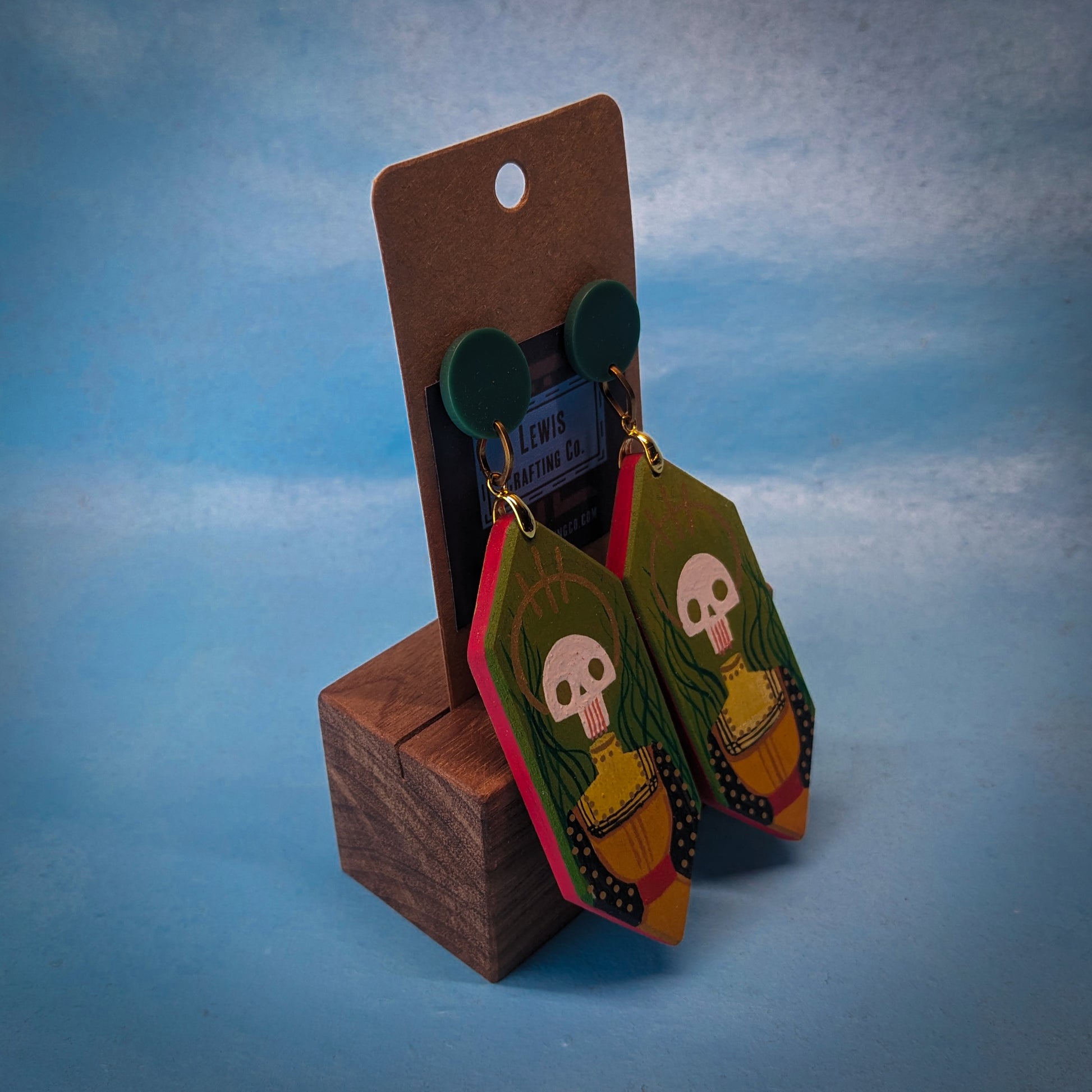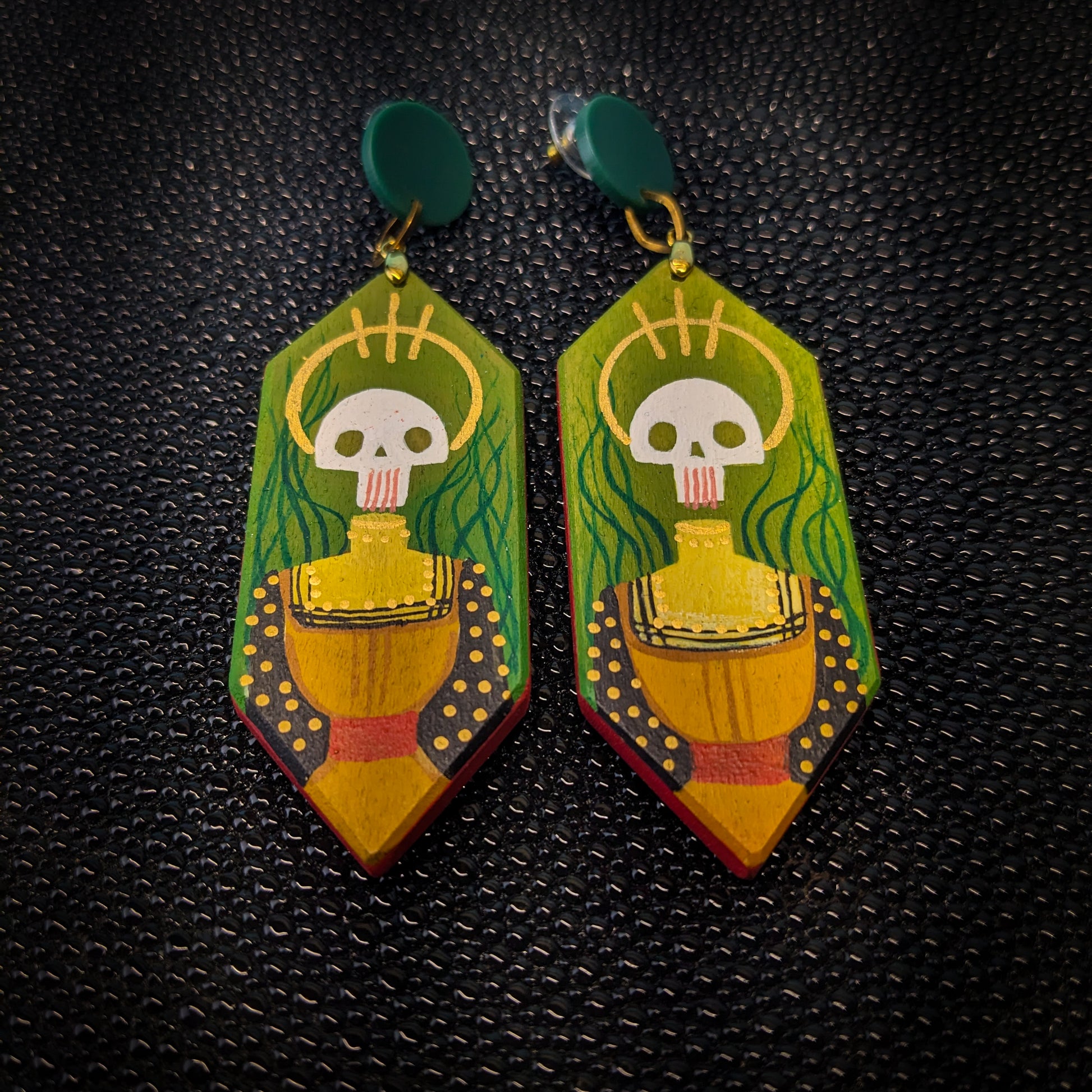 Handmade, lightweight, one of a kind, painted hardwood dangle earrings! I hand cut these earrings from poplar wood, sanded them and then handed them over to Kate (@fearsomebeast) for painting. Kate is most known for her embroidery work which often features these guardians. These earrings have an incredible amount of detail and are a truly unique accessory.