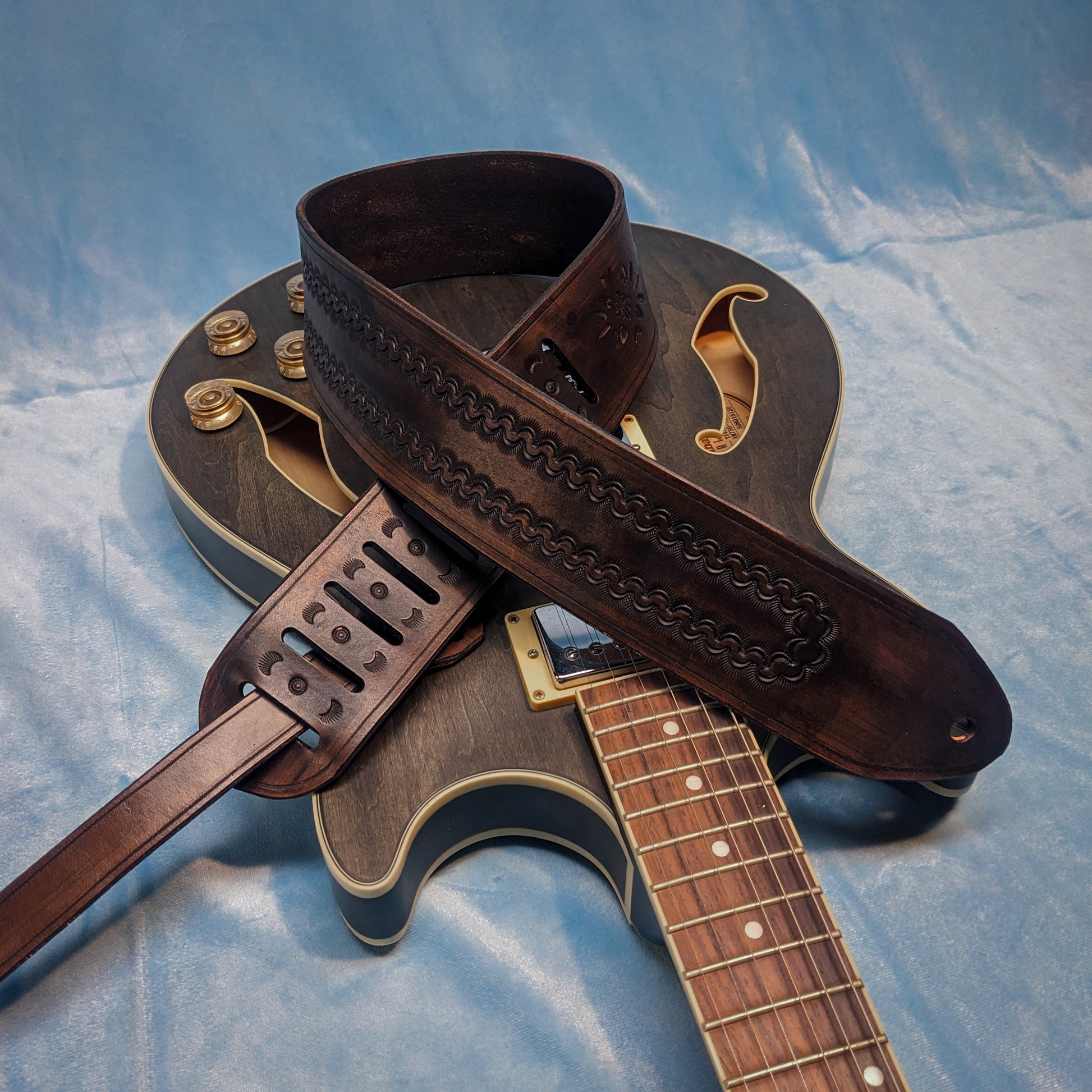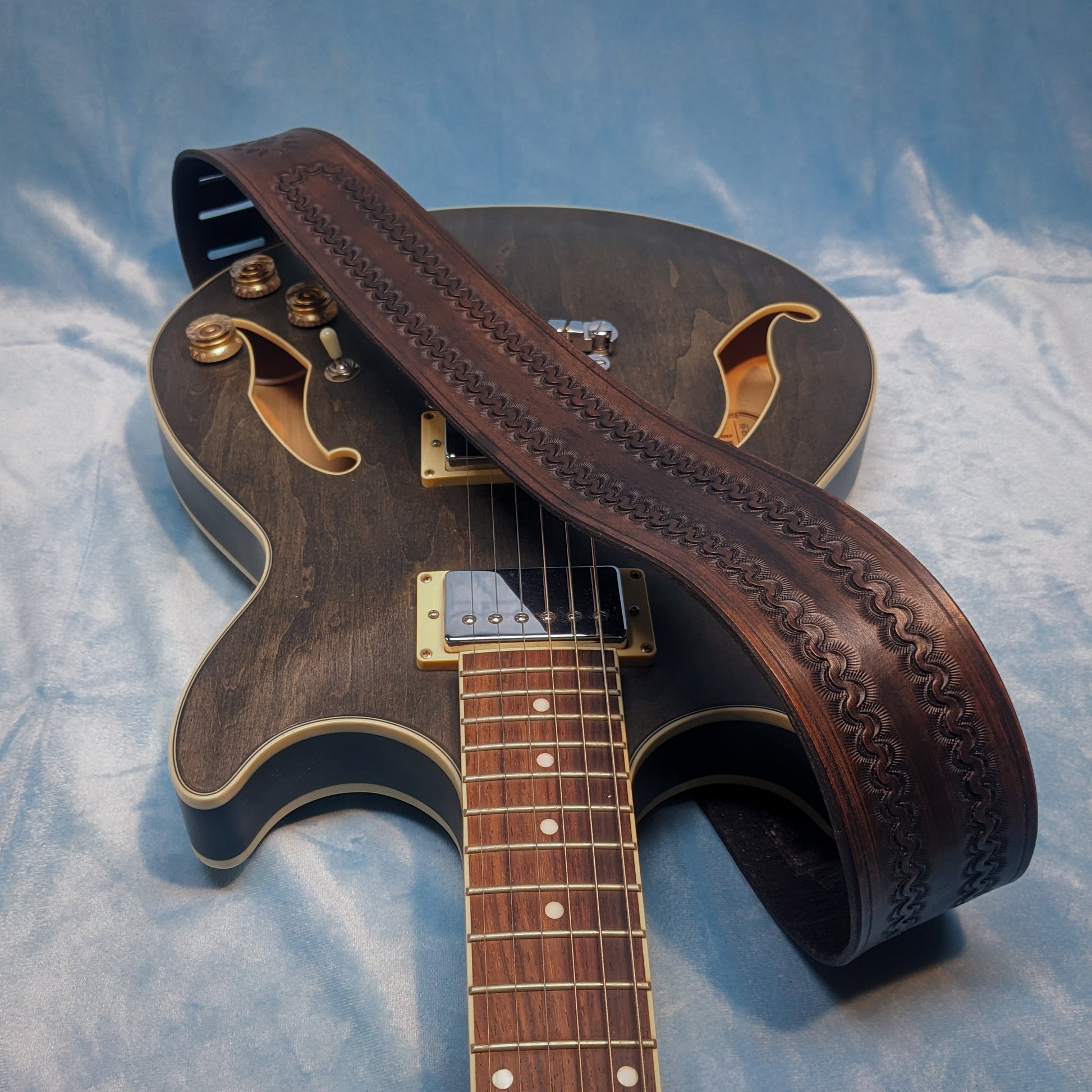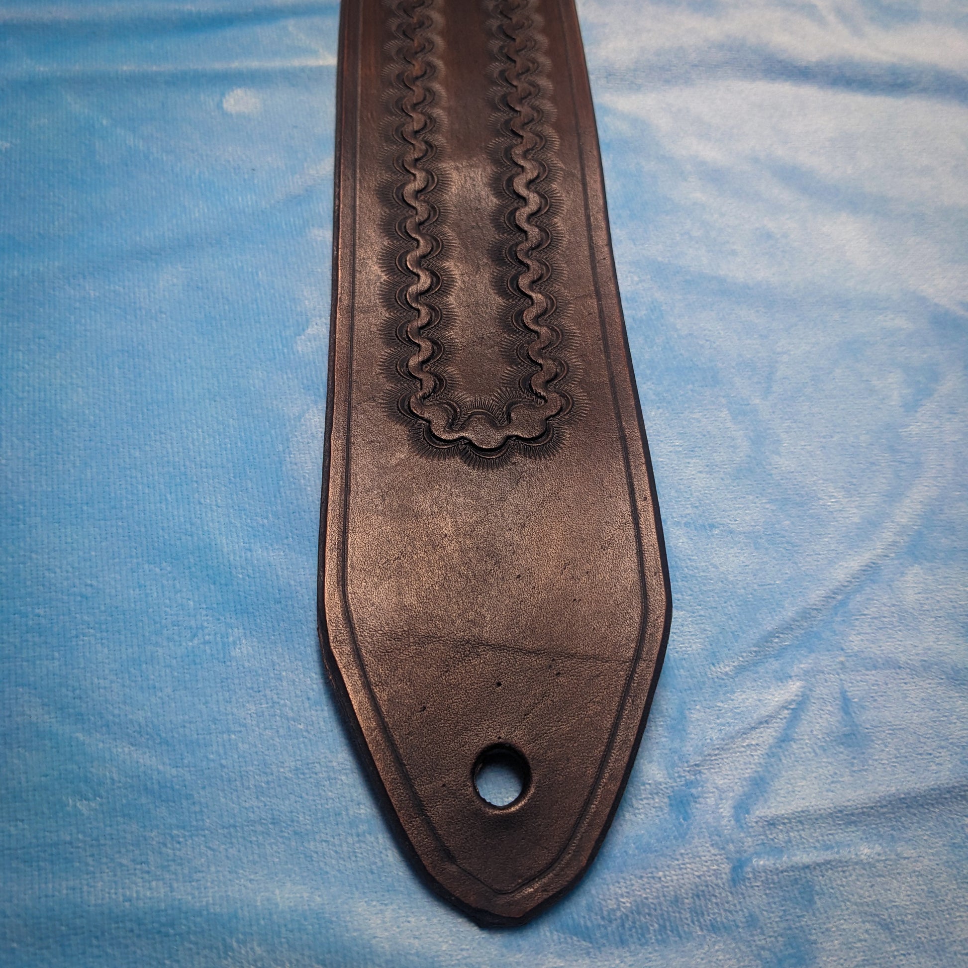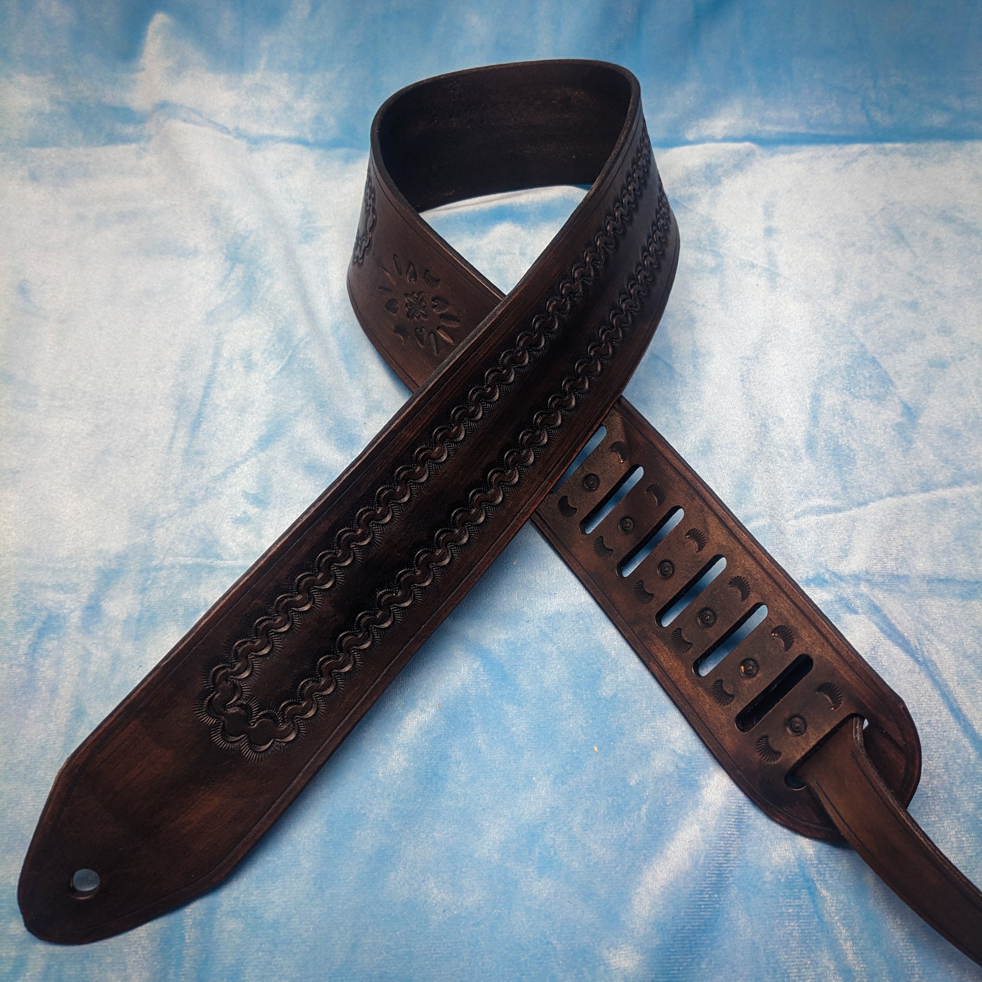 Hand made, one of a kind leather guitar strap. This high quality guitar strap features a sunrise pattern on soft, sturdy, veg tan leather and is finished with natural oil. This strap is perfect for both electric and acoustic guitars.