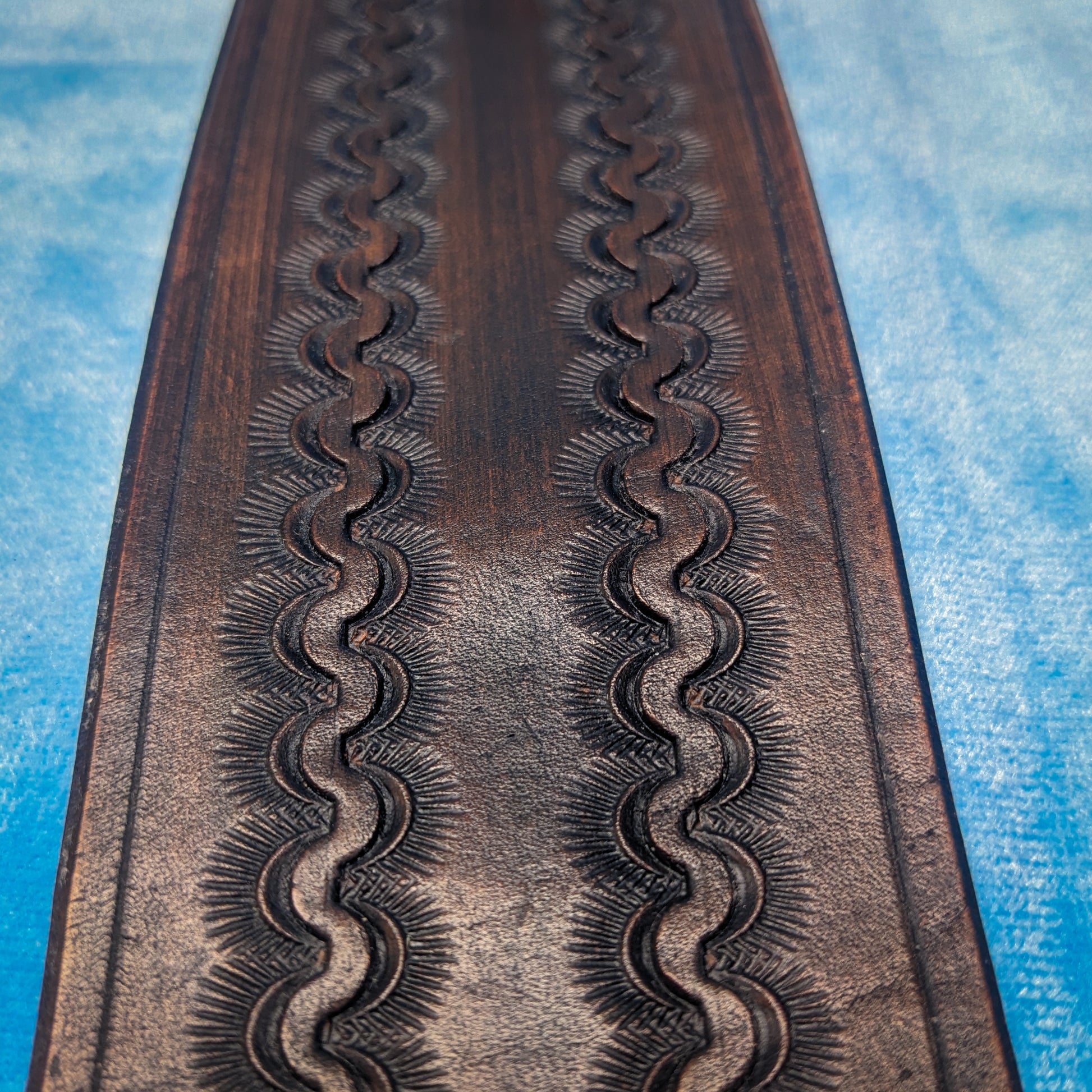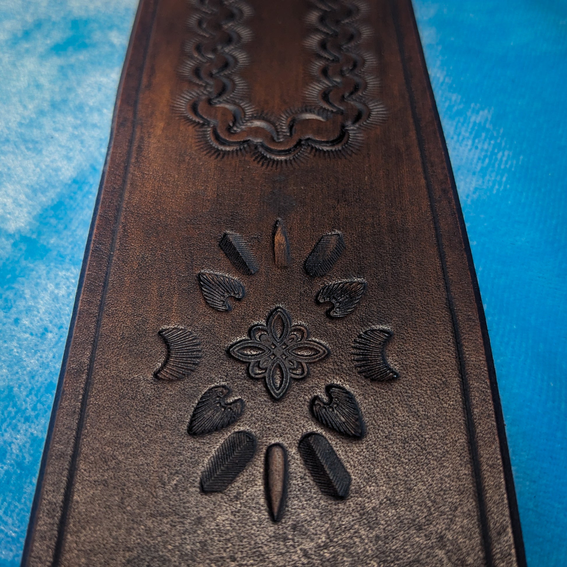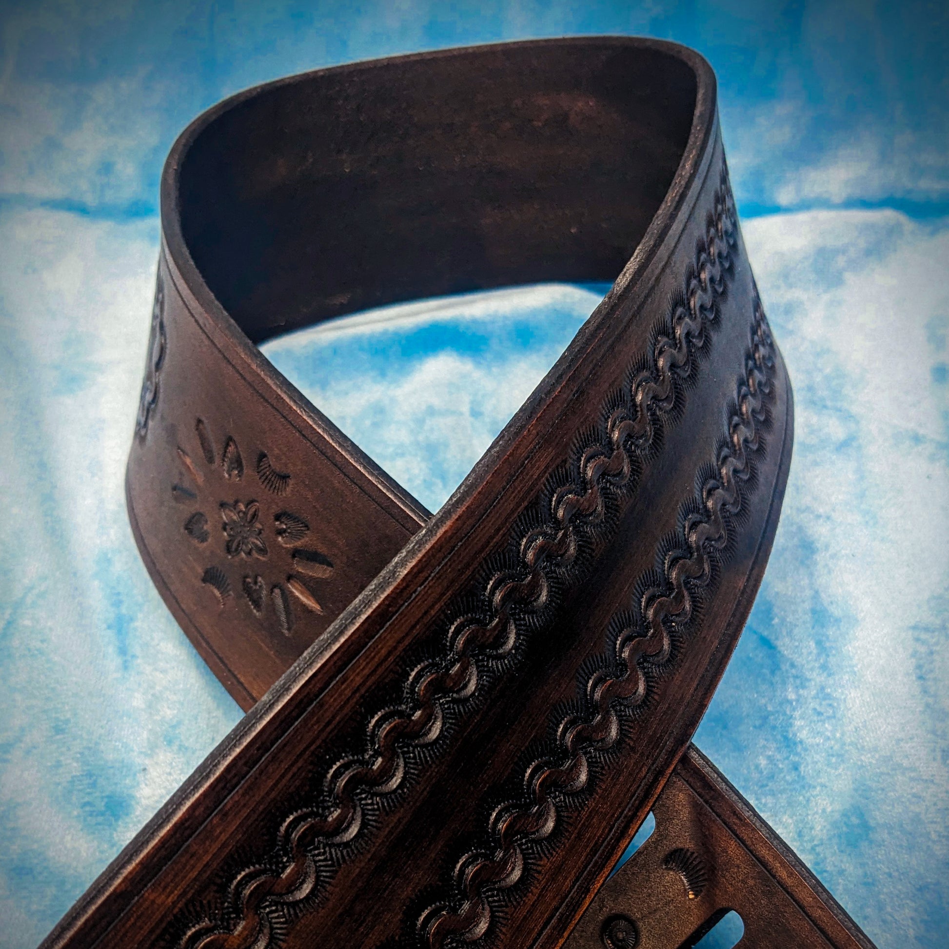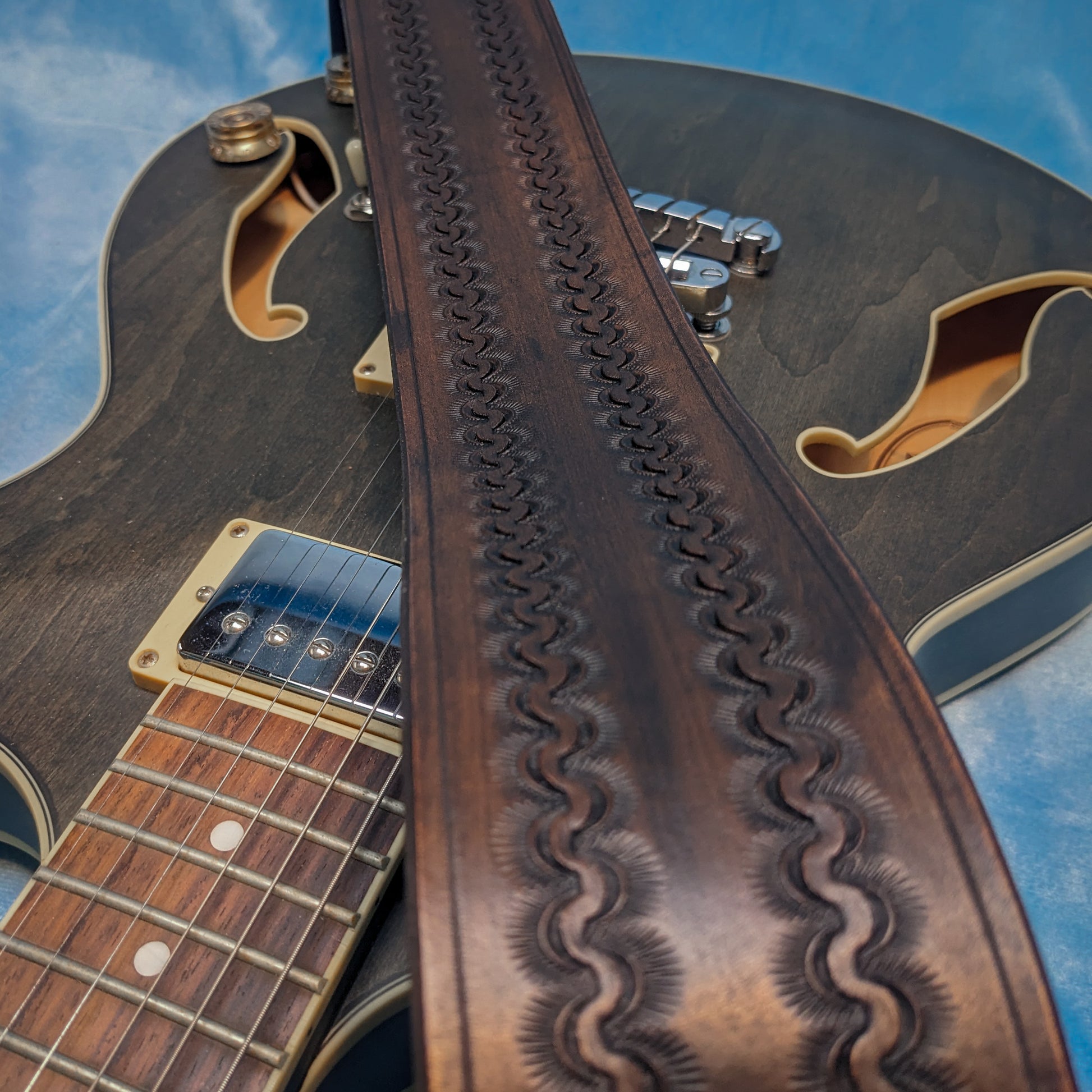 Hand made, one of a kind leather guitar strap. This high quality guitar strap features a sunrise pattern on soft, sturdy, veg tan leather and is finished with natural oil. This strap is perfect for both electric and acoustic guitars.