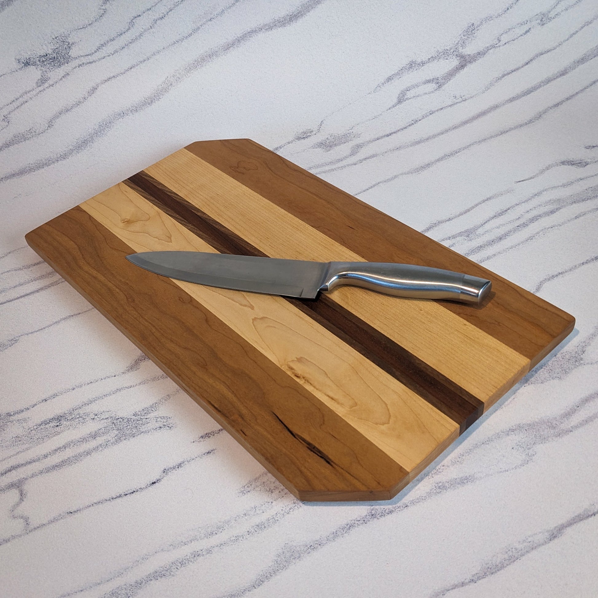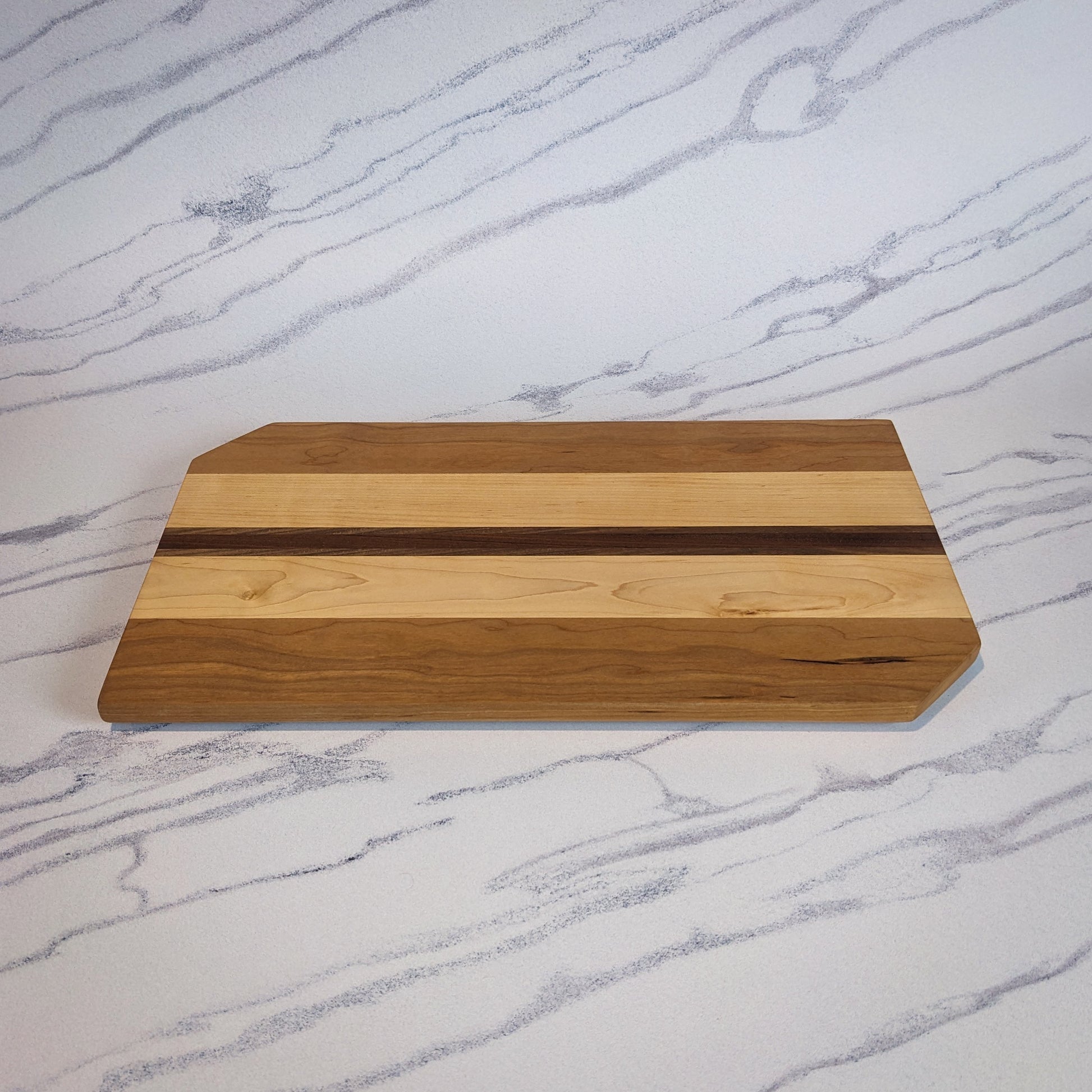This cutting board is a fantastic piece for your kitchen. It is made by hand out of strips of cherry, maple, black walnut and sapele. Excellent for cutting, prepping or serving any food in the kitchen or on the table! This board will last generations and look fantastic the whole time.