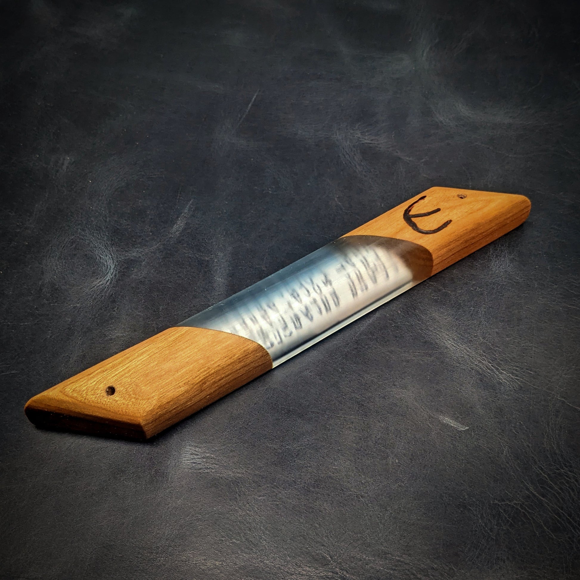 My signature hardwood and resin "window" mezuzah case is a perfect addition to any Jewish household. This one-of-a-kind mezuzah is made from cherry and light blue resin. The clear resin allows you to see the scroll inside! A perfect gift for Bar/Bat Mitzvah's, holidays, weddings or any other occasion. My mezuzot are all finished with natural beeswax and citrus oil.