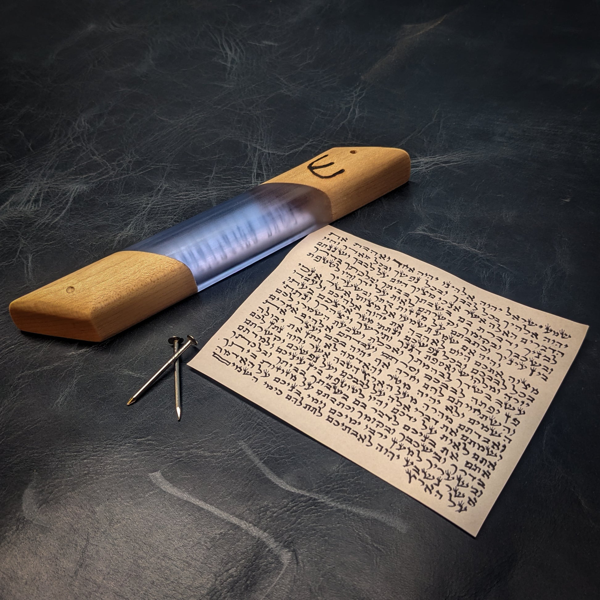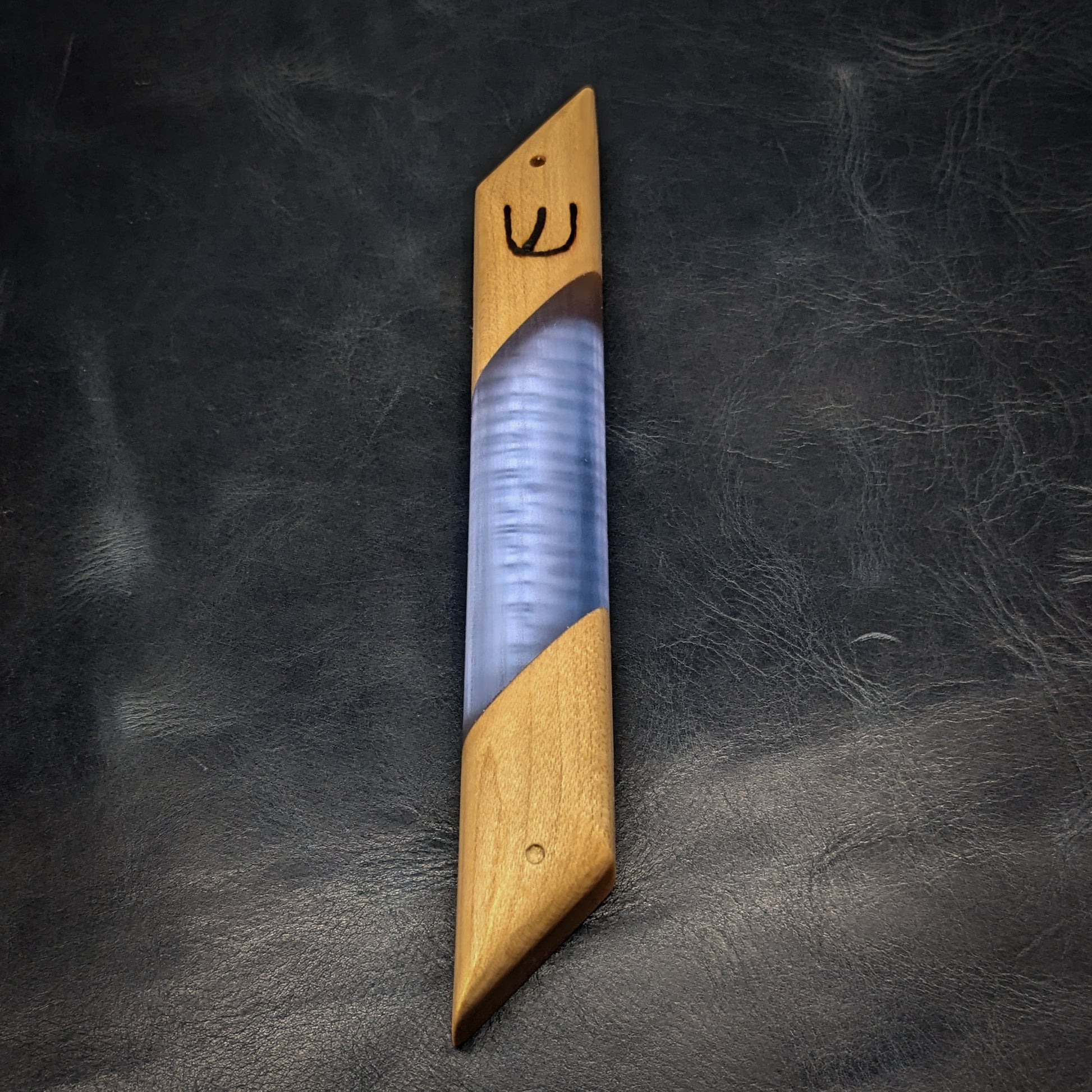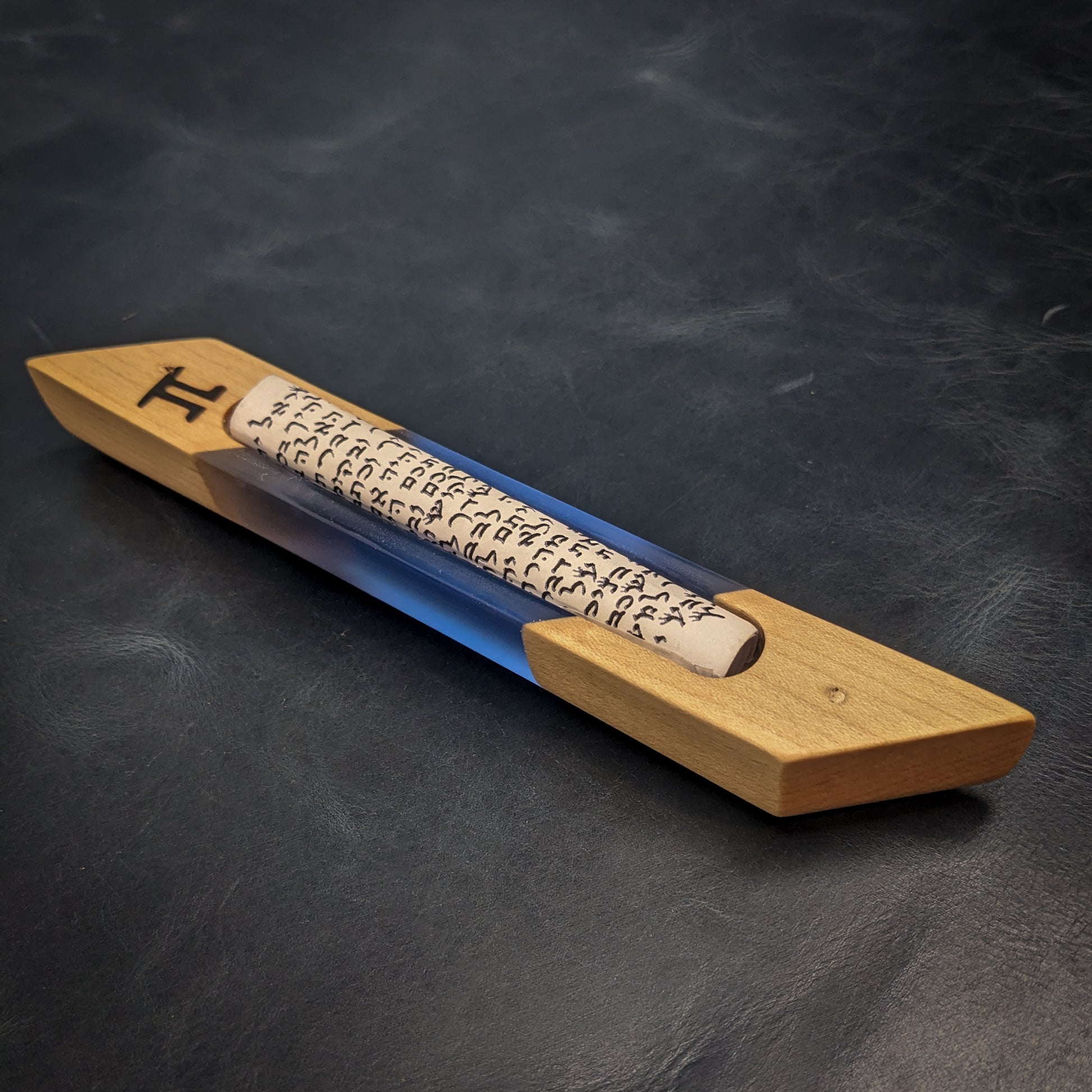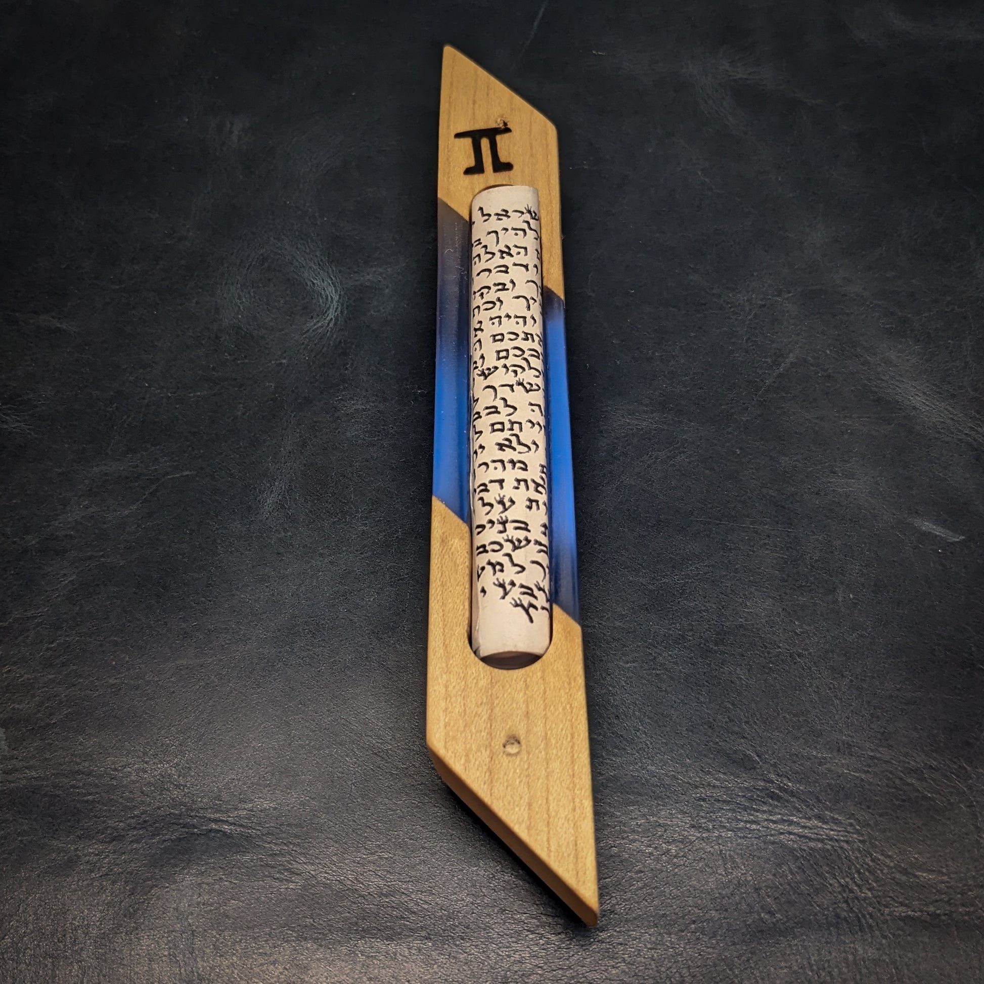 My signature hardwood and resin "window" mezuzah case is a perfect addition to any Jewish household. This one-of-a-kind mezuzah is made from hard maple and and blue resin. The clear resin allows you to see the scroll inside! A perfect gift for Bar/Bat Mitzvah's, holidays, weddings or any other occasion. My mezuzot are all finished with natural beeswax and citrus oil.