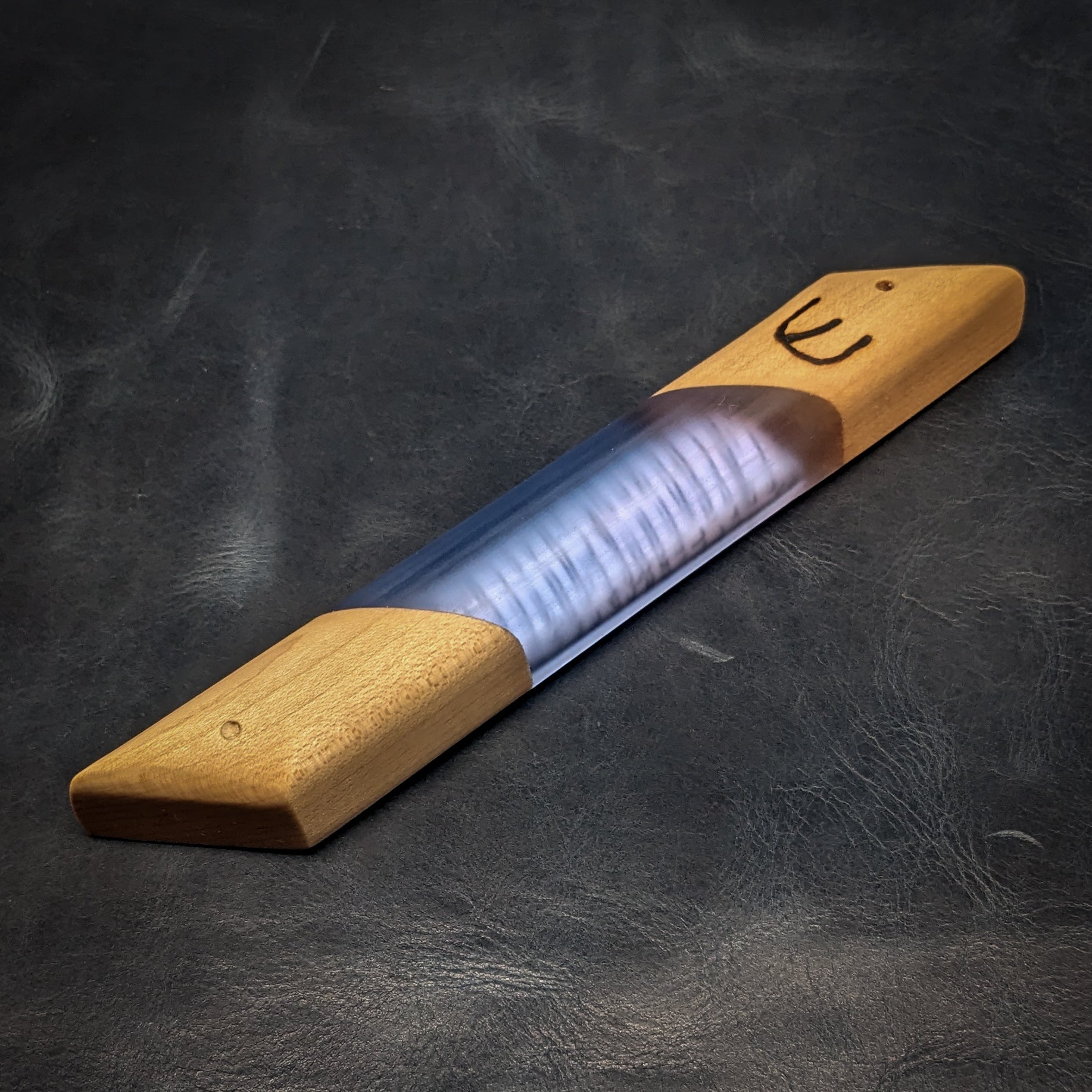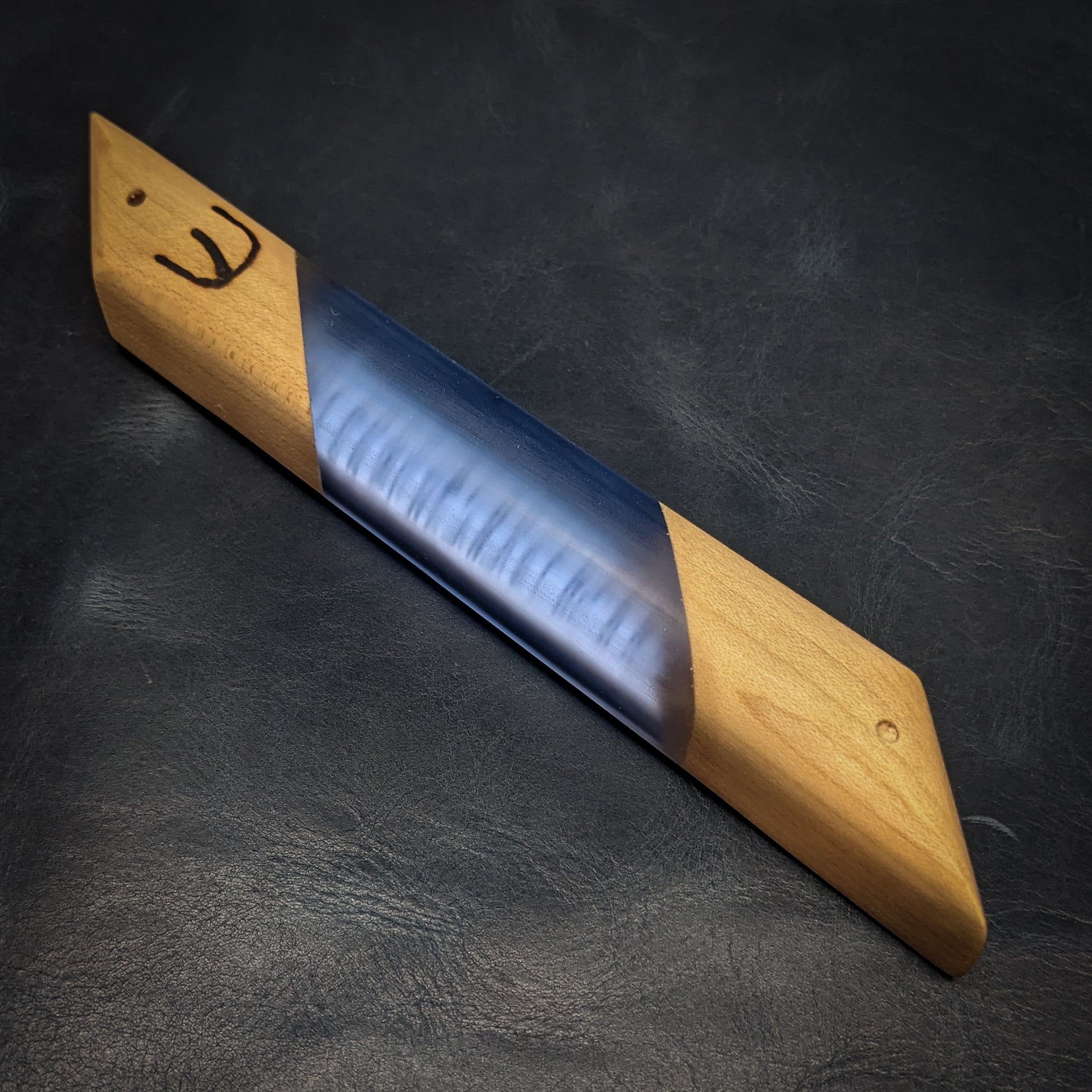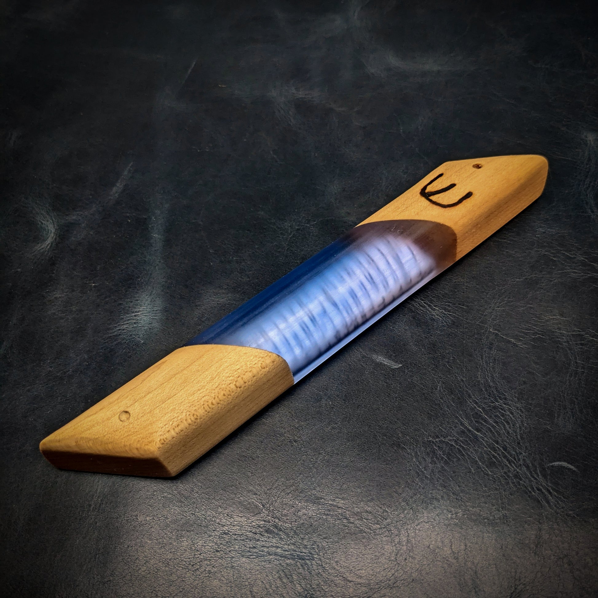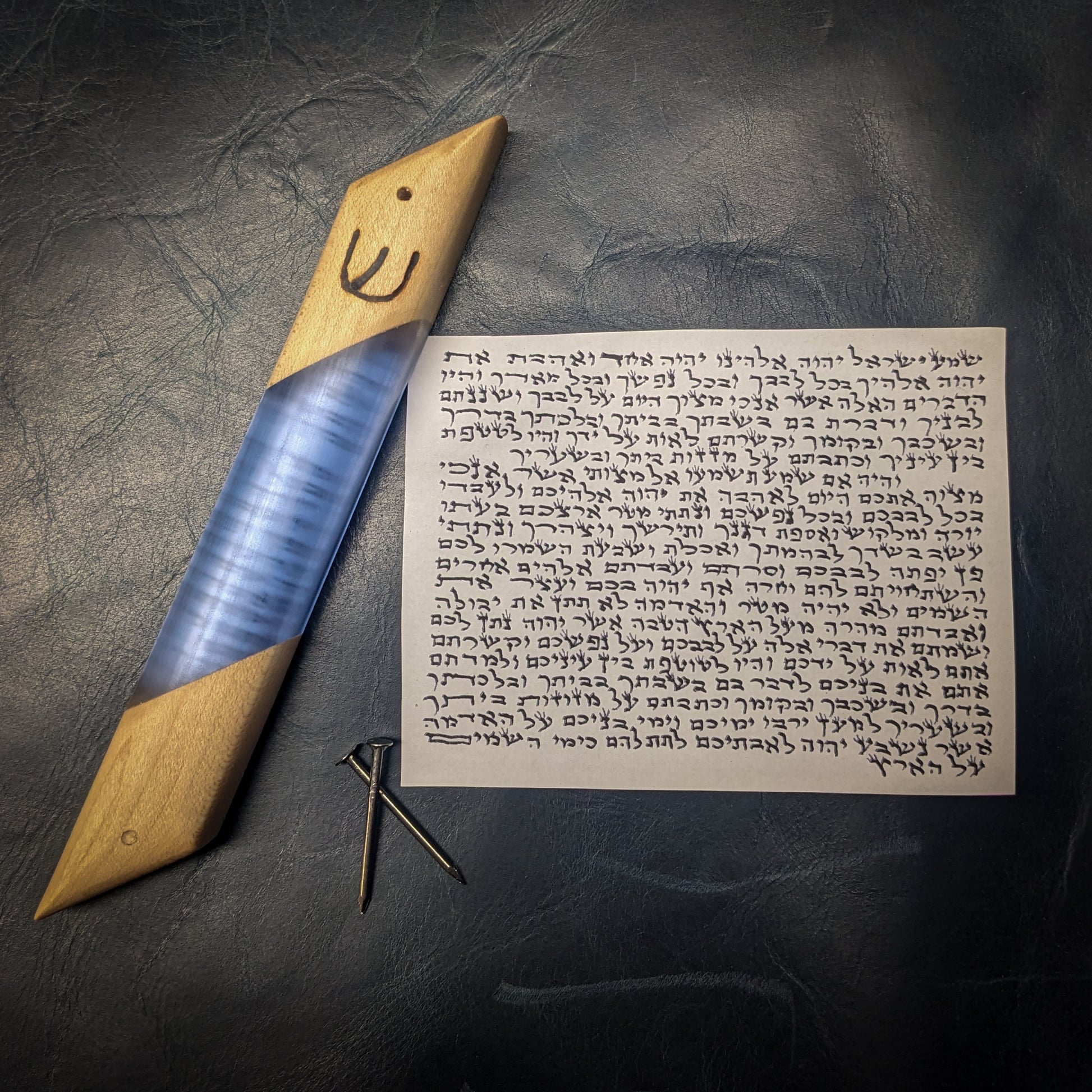 My signature hardwood and resin "window" mezuzah case is a perfect addition to any Jewish household. This one-of-a-kind mezuzah is made from hard maple and and blue resin. The clear resin allows you to see the scroll inside! A perfect gift for Bar/Bat Mitzvah's, holidays, weddings or any other occasion. My mezuzot are all finished with natural beeswax and citrus oil.