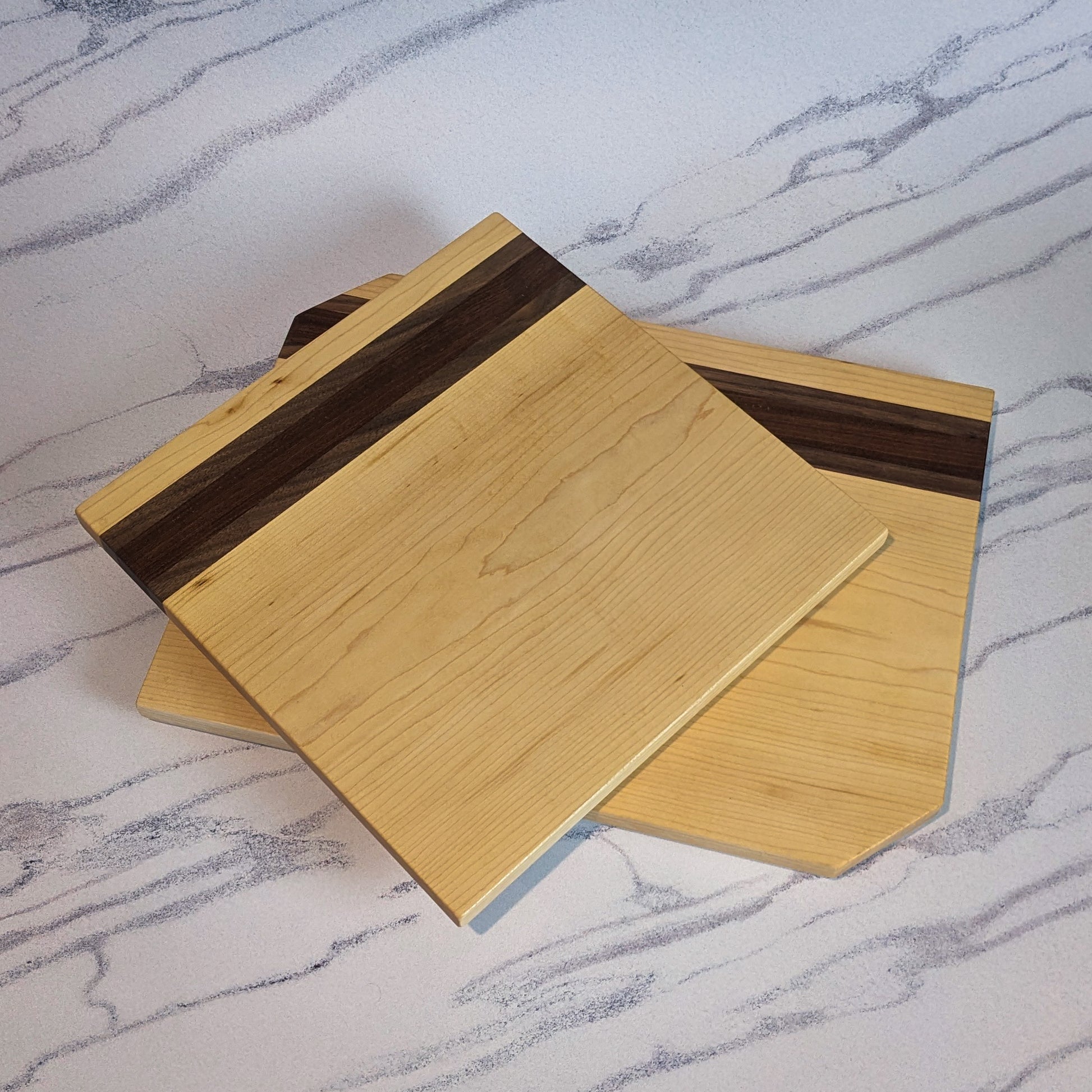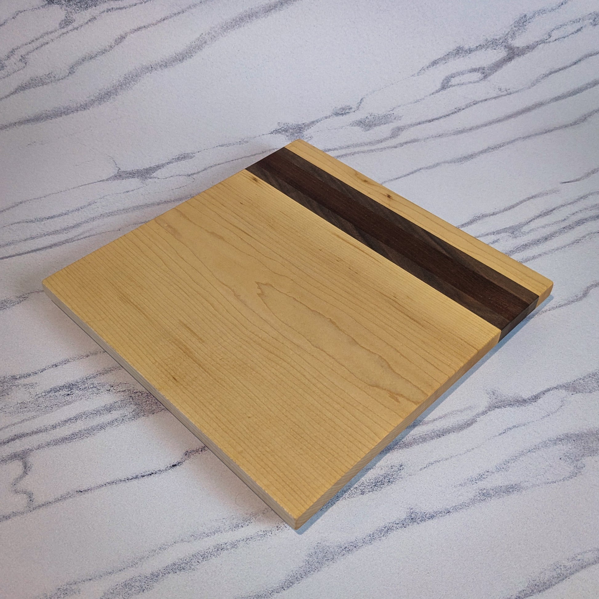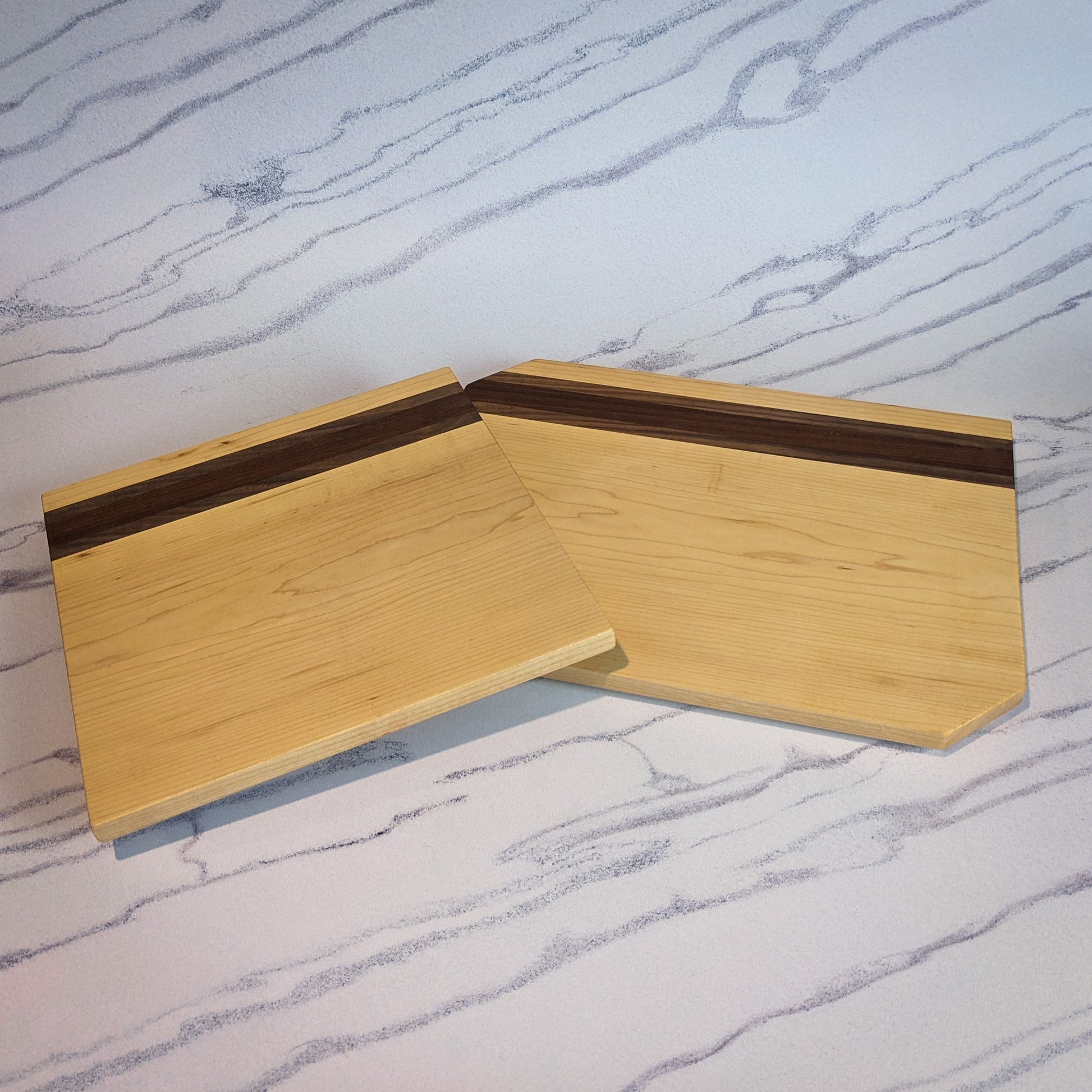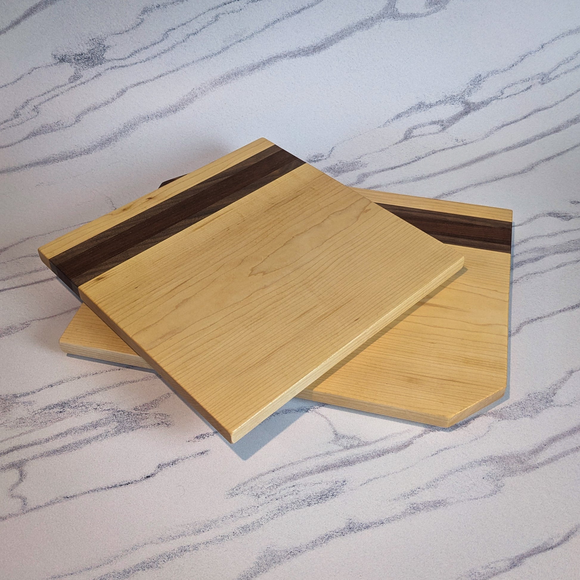 This cutting board set is a fantastic piece for your kitchen. It is made by hand out of strips of hard maple, black walnut and sapele. Excellent for cutting, prepping or serving any food in the kitchen or on the table! These boards will last generations and look fantastic the whole time.