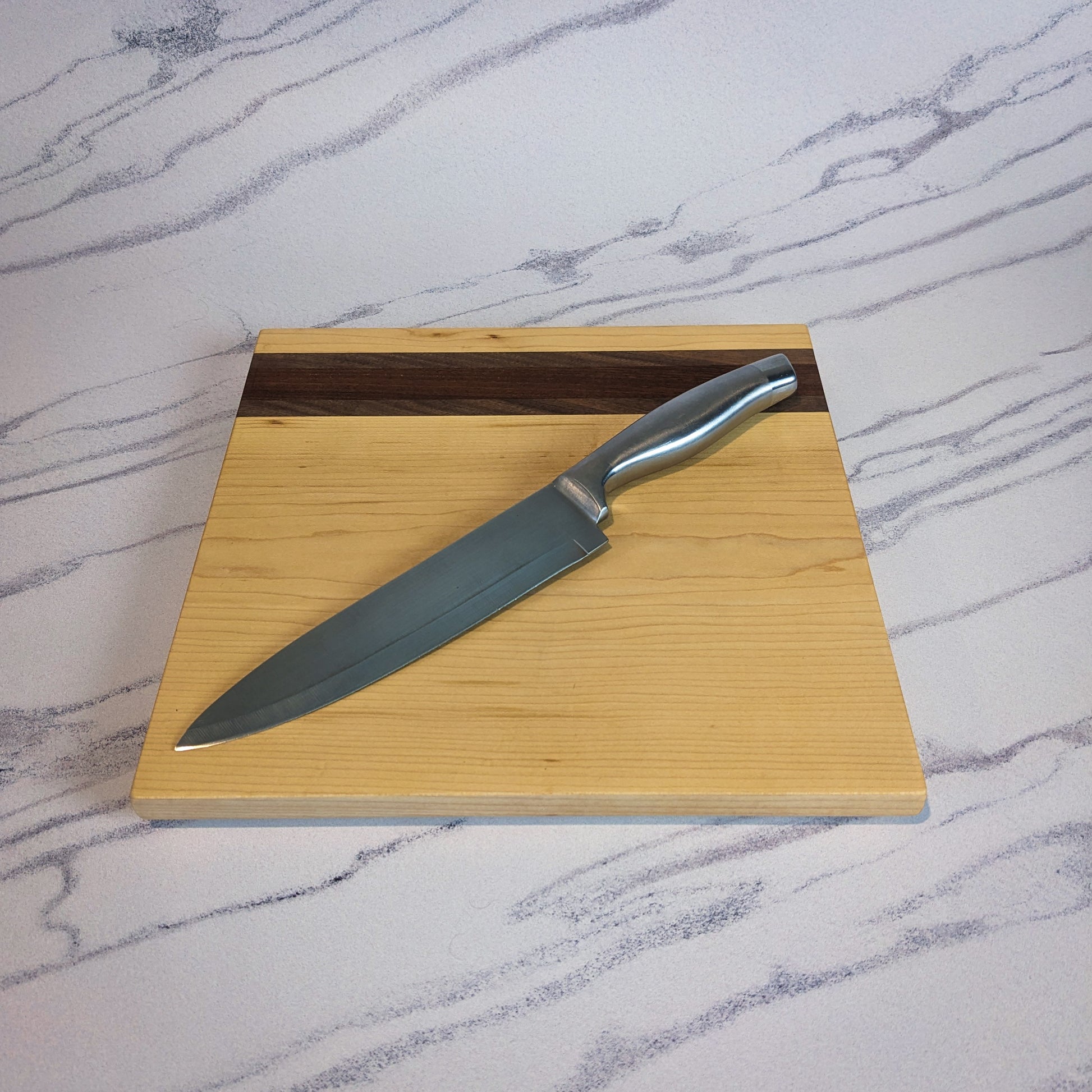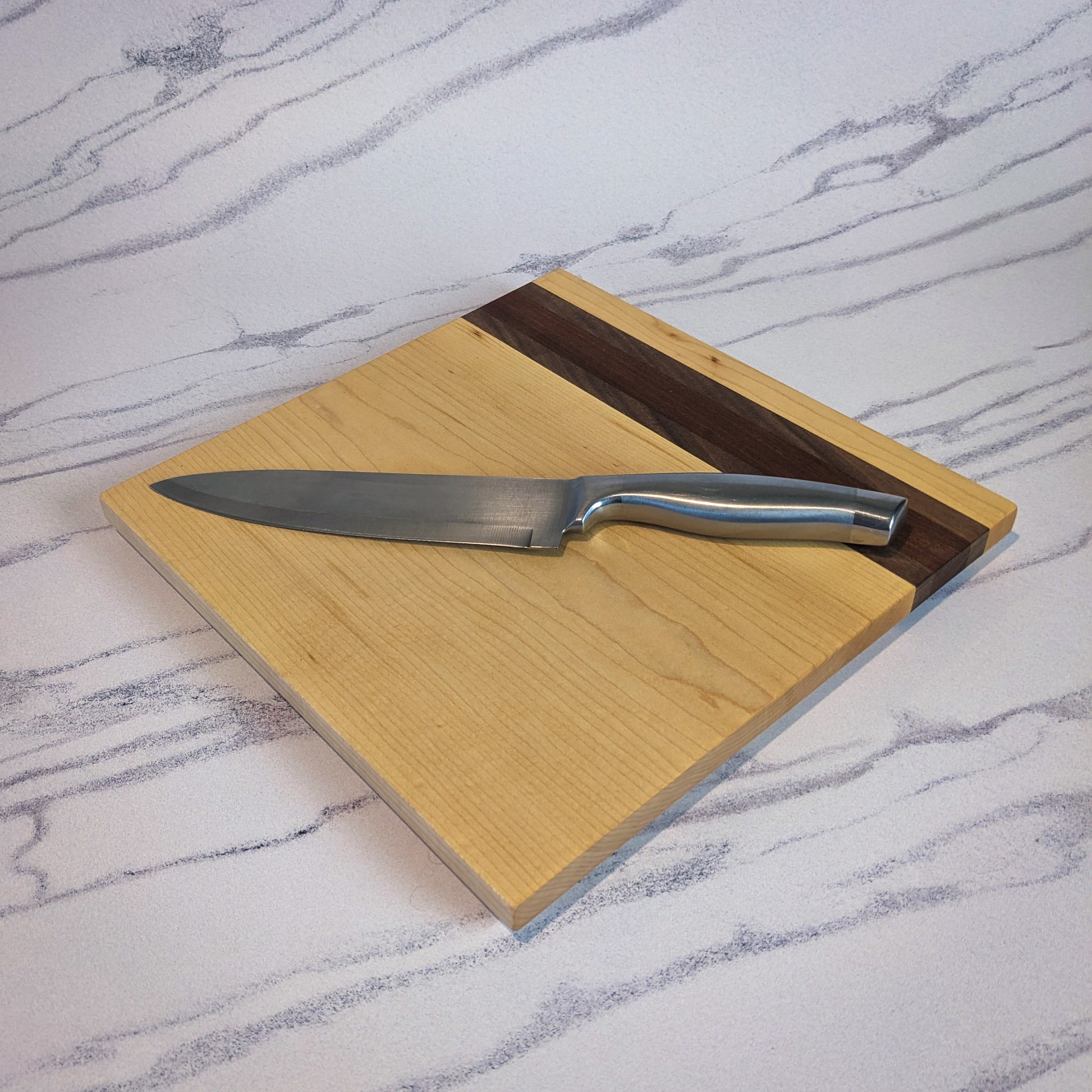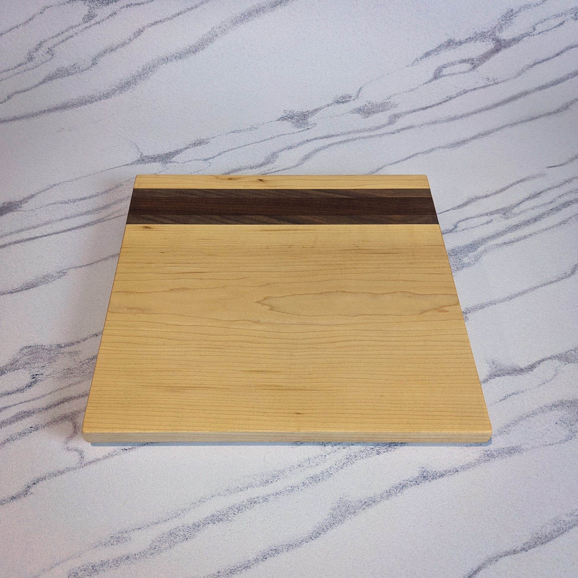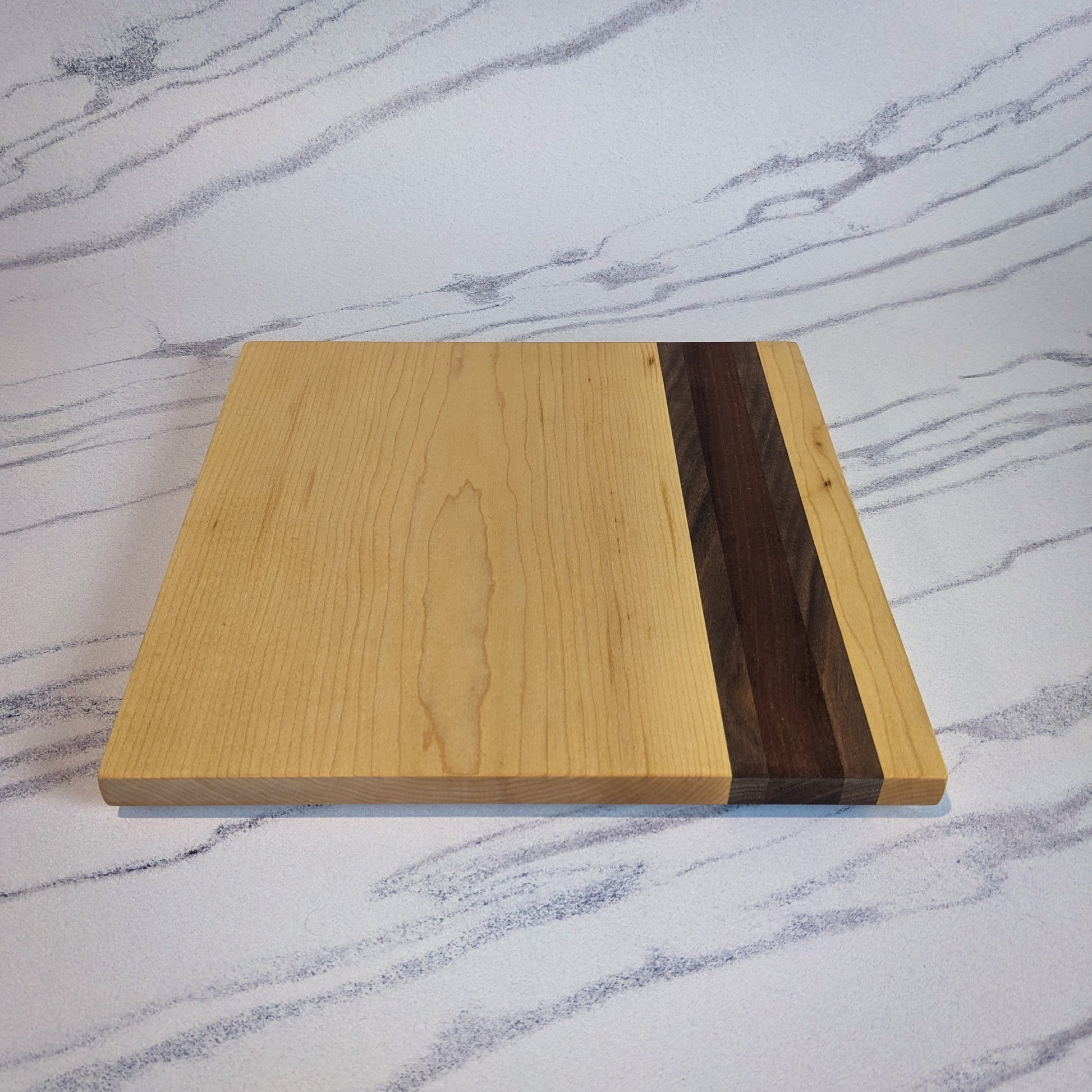 This cutting board set is a fantastic piece for your kitchen. It is made by hand out of strips of hard maple, black walnut and sapele. Excellent for cutting, prepping or serving any food in the kitchen or on the table! These boards will last generations and look fantastic the whole time.