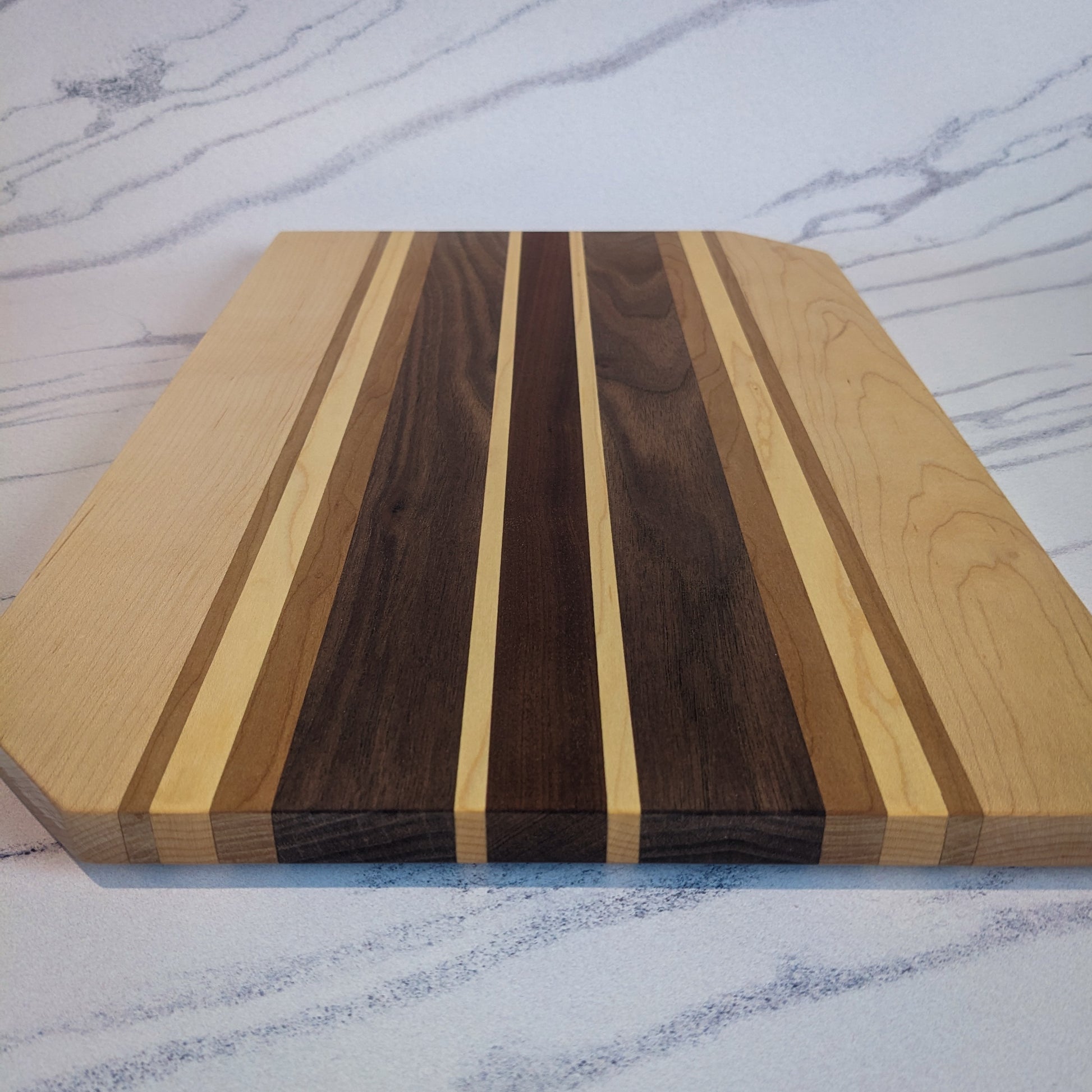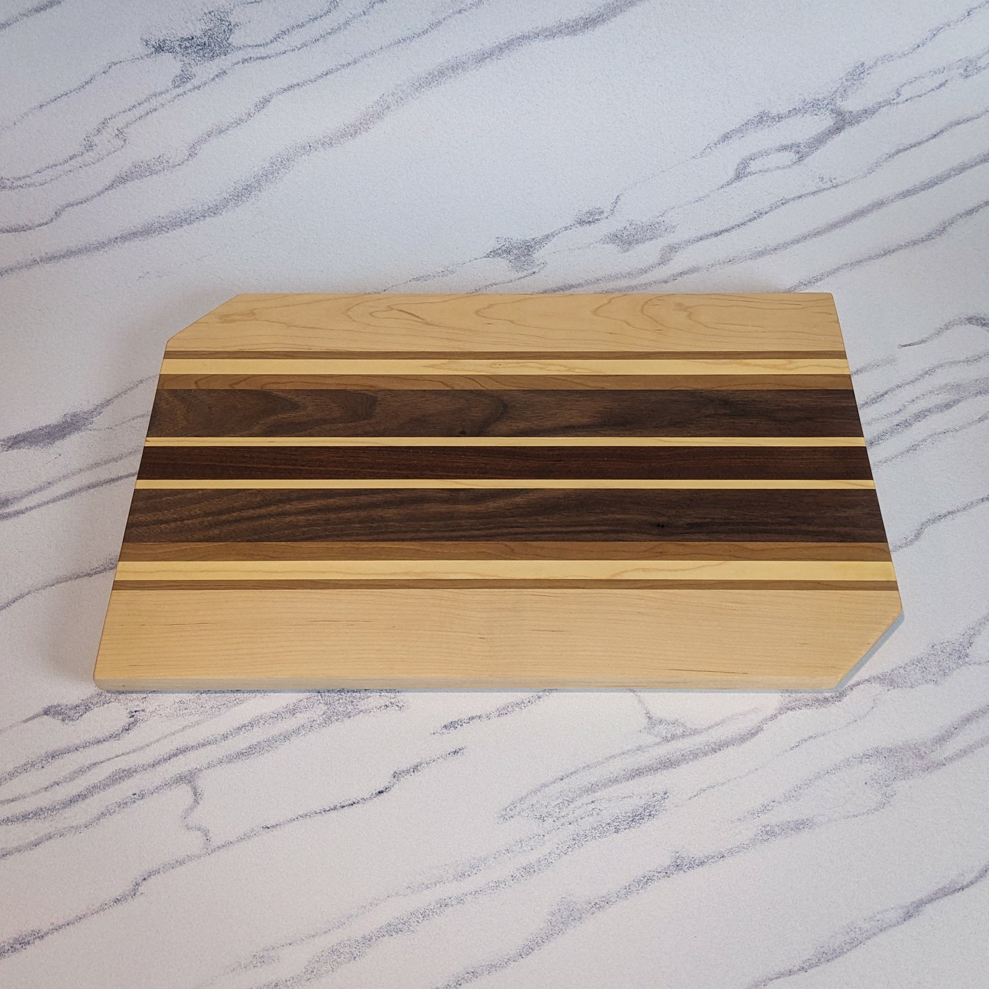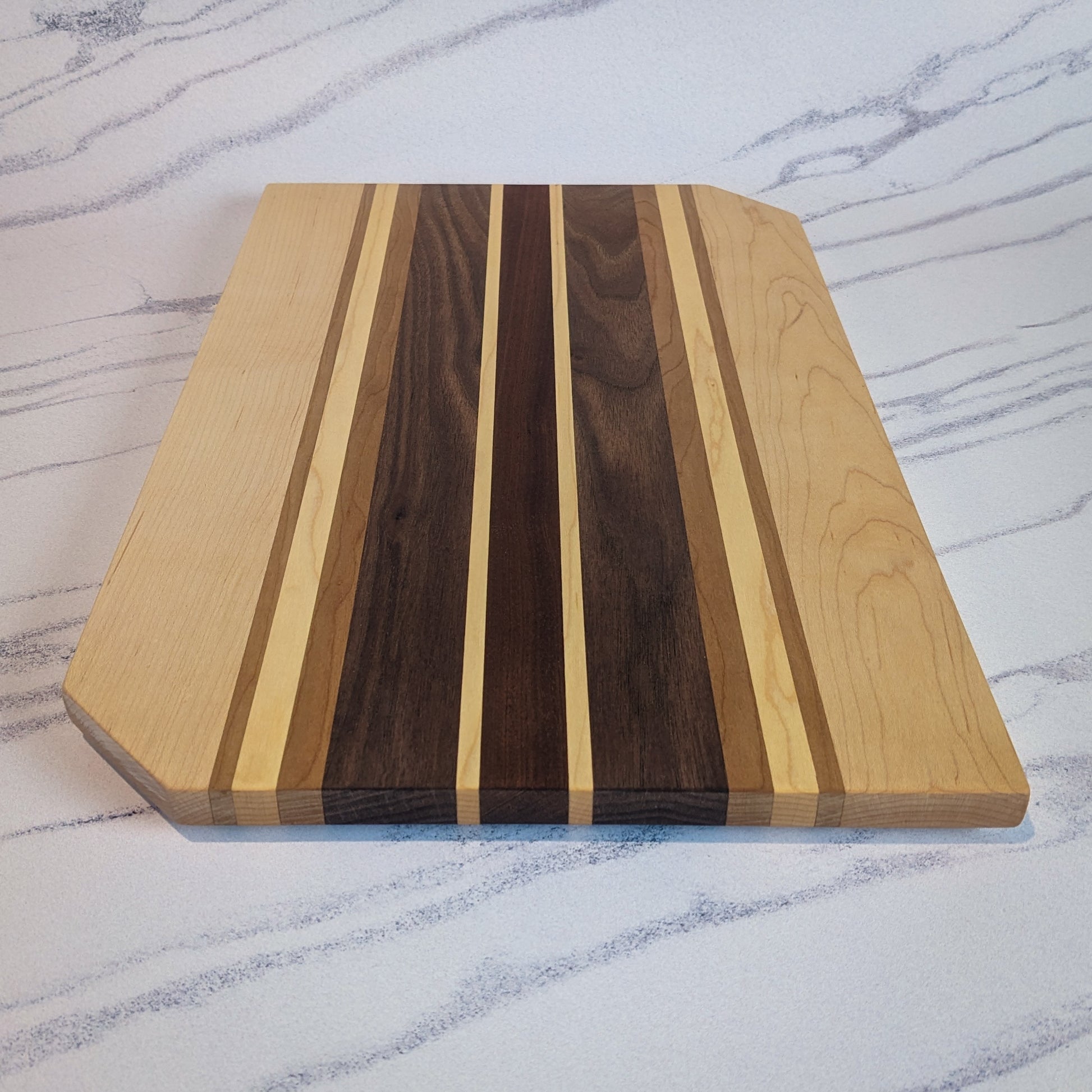 This cutting board is a fantastic piece for your kitchen. It is made by hand out of strips of maple, cherry, black walnut and sapele. Excellent for cutting, prepping or serving any food in the kitchen or on the table! This board will last generations and look fantastic the whole time.