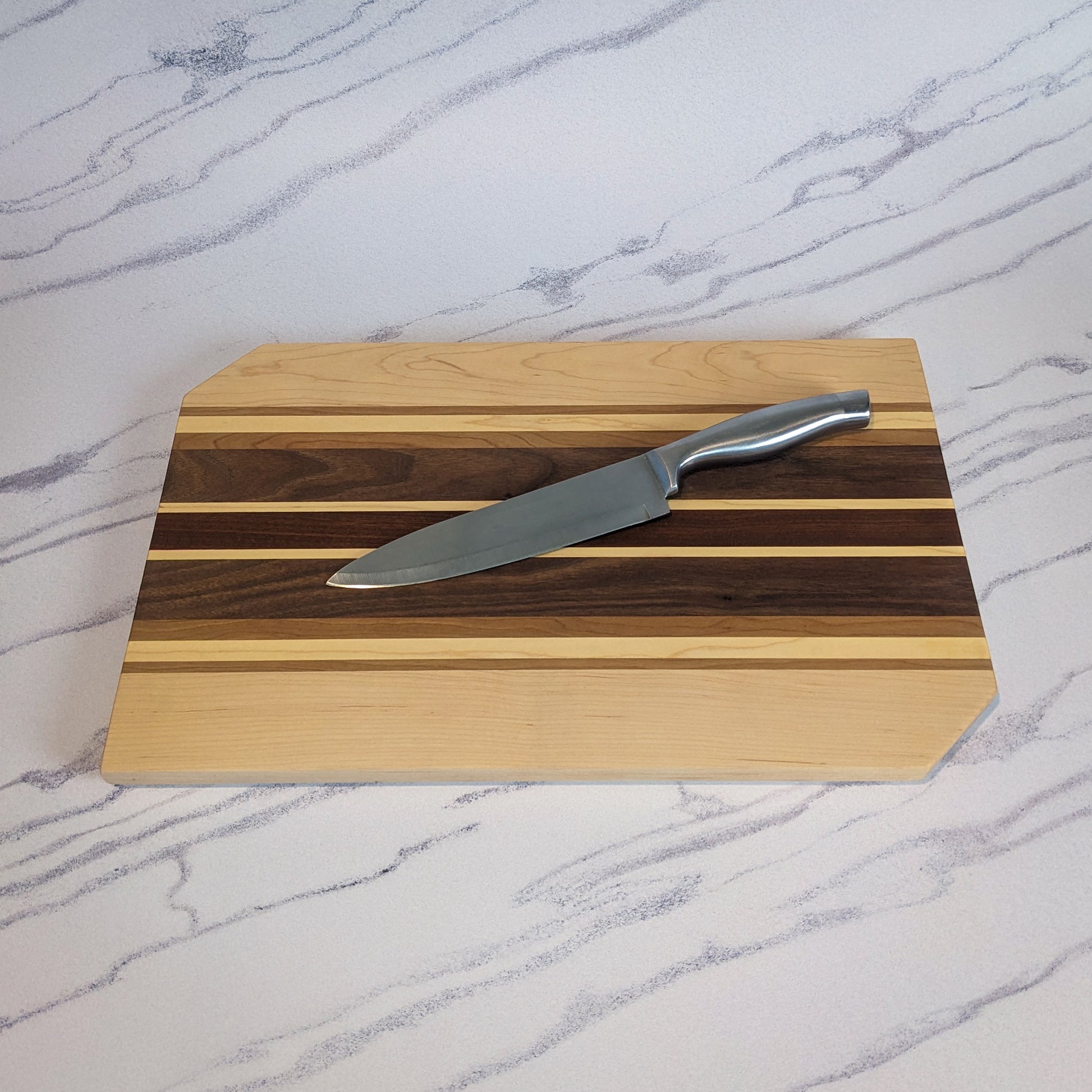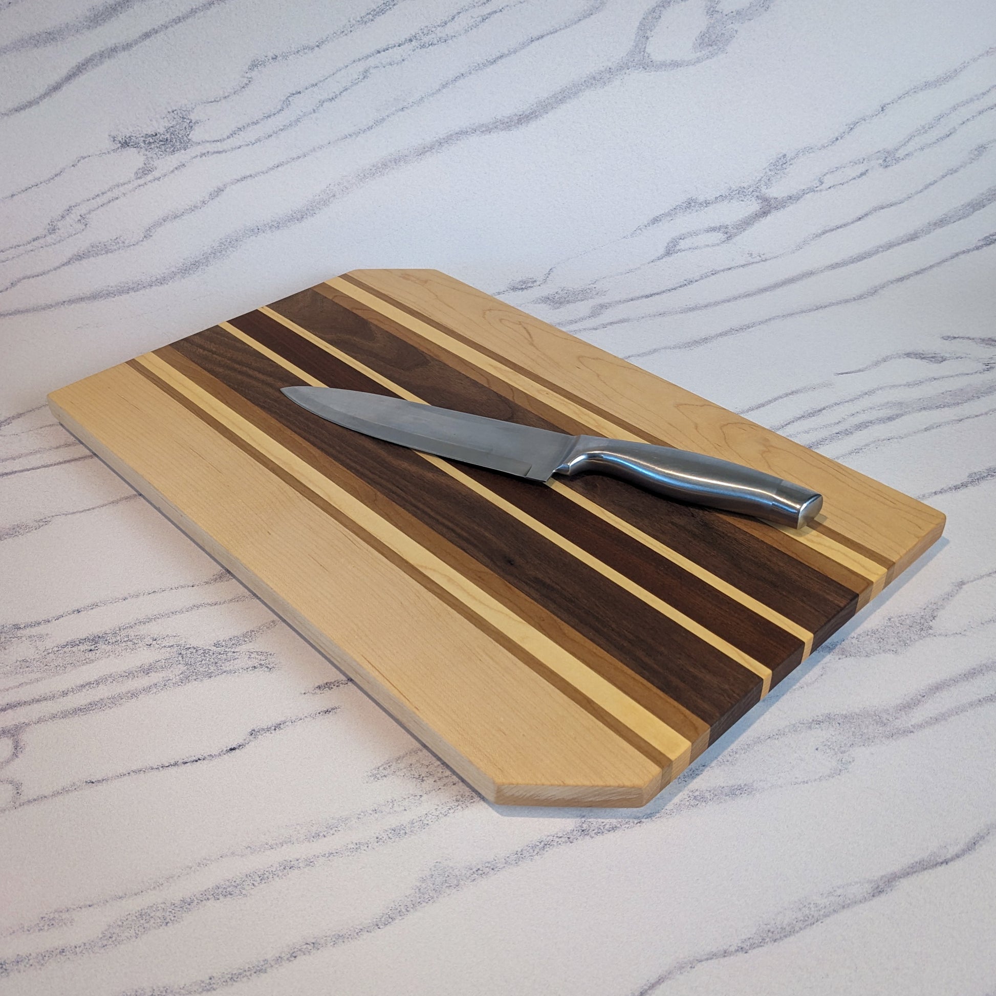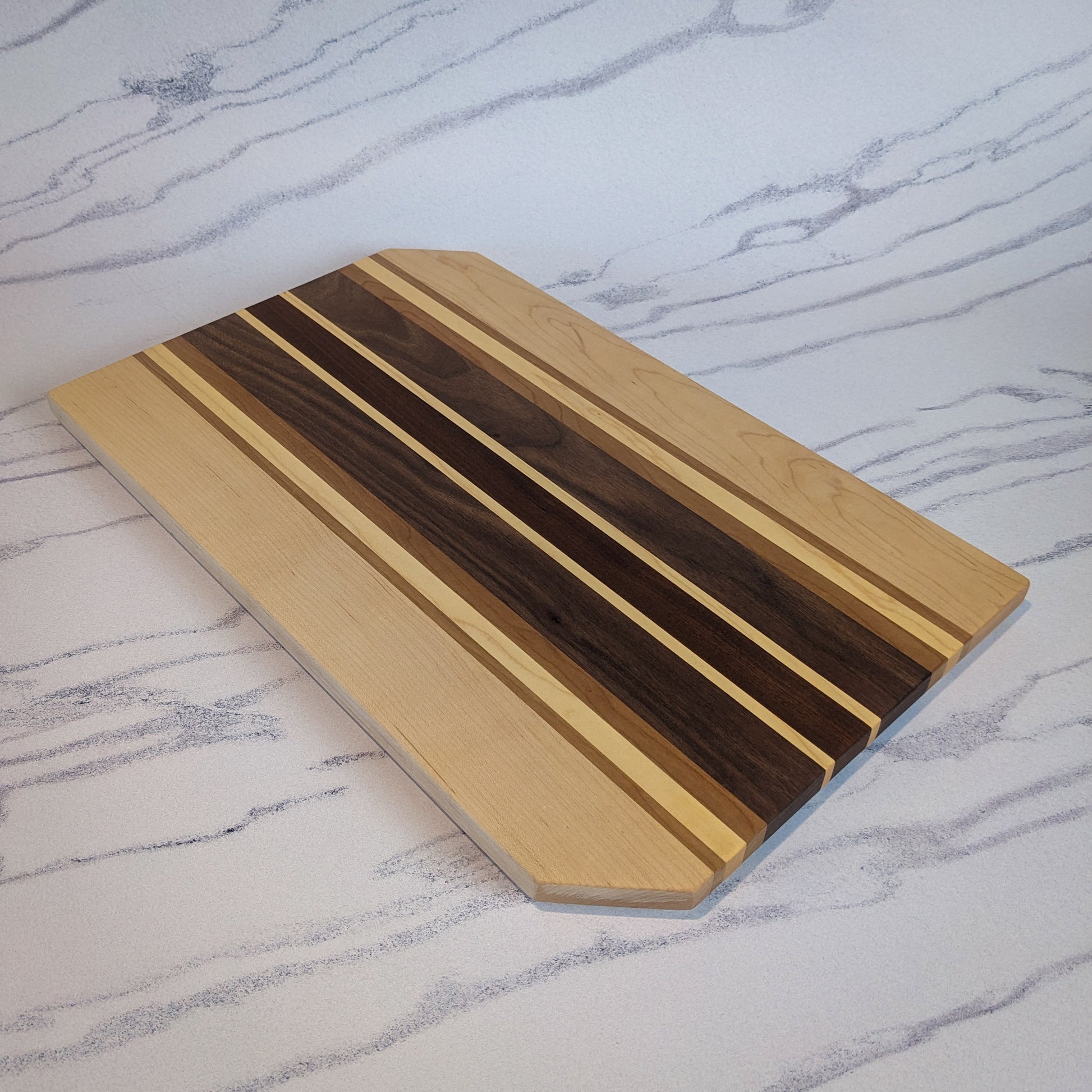 This cutting board is a fantastic piece for your kitchen. It is made by hand out of strips of maple, cherry, black walnut and sapele. Excellent for cutting, prepping or serving any food in the kitchen or on the table! This board will last generations and look fantastic the whole time.
