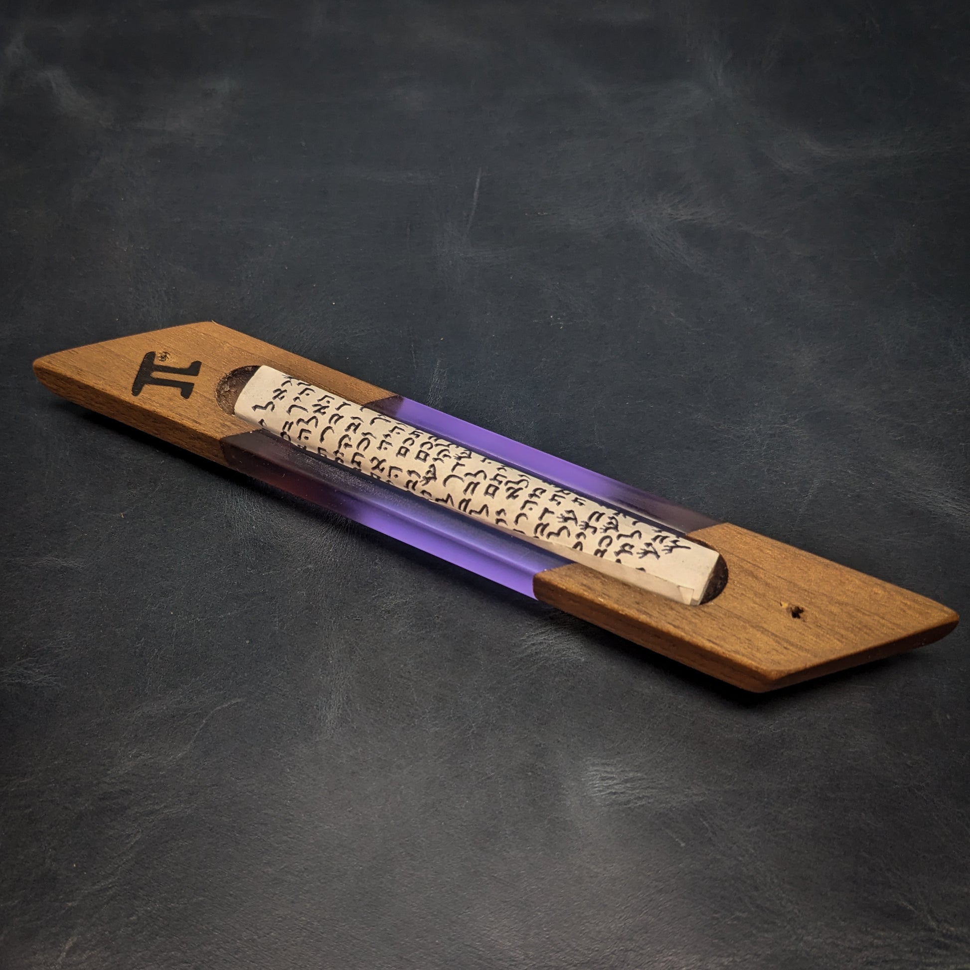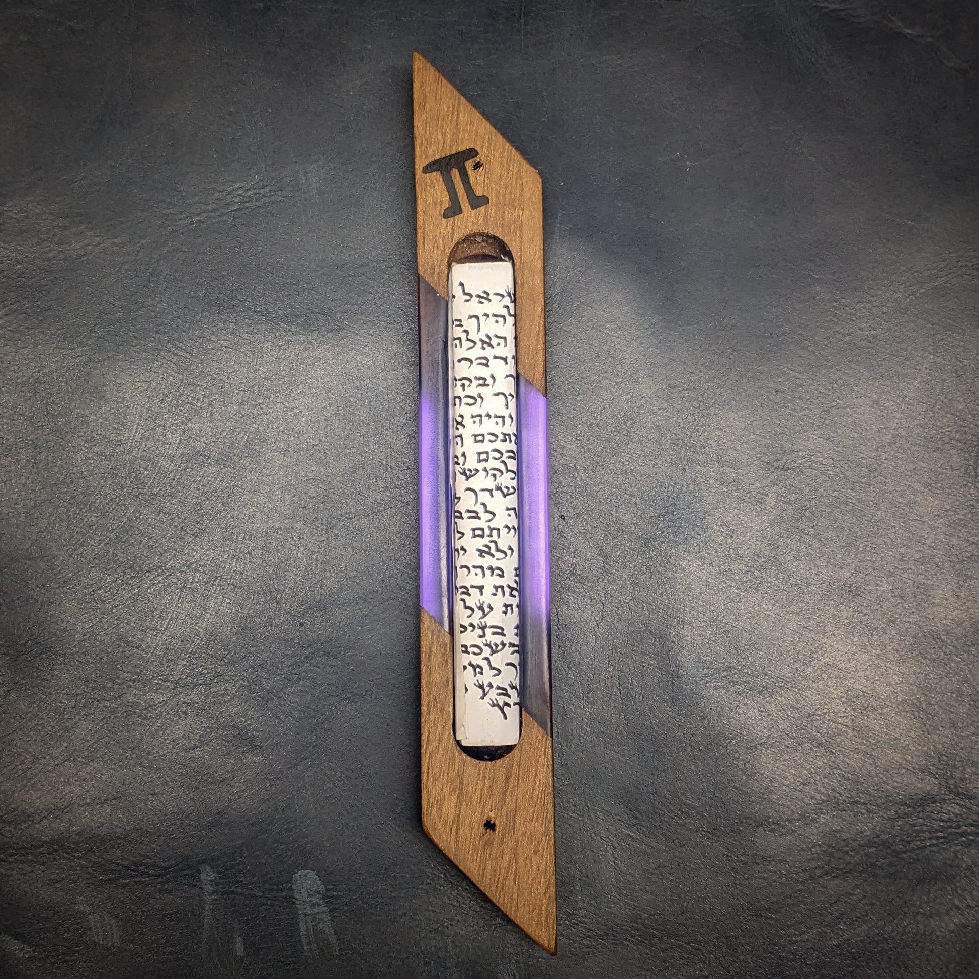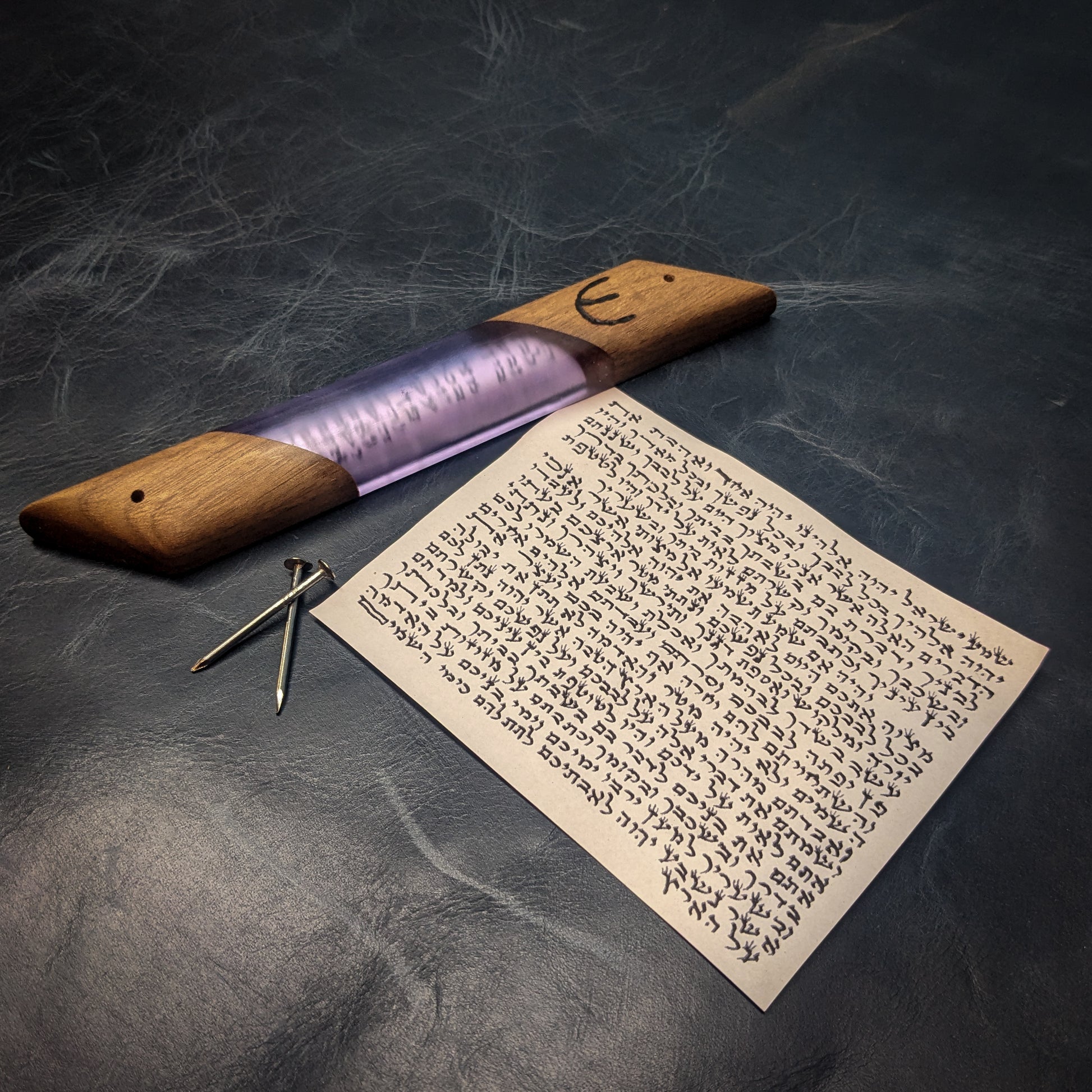 My signature hardwood and resin "window" mezuzah case is a perfect addition to any Jewish household. This one-of-a-kind mezuzah is made from black walnut and and purple resin. The clear resin allows you to see the scroll inside! A perfect gift for Bar/Bat Mitzvah's, holidays, weddings or any other occasion. My mezuzot are all finished with natural beeswax and citrus oil.