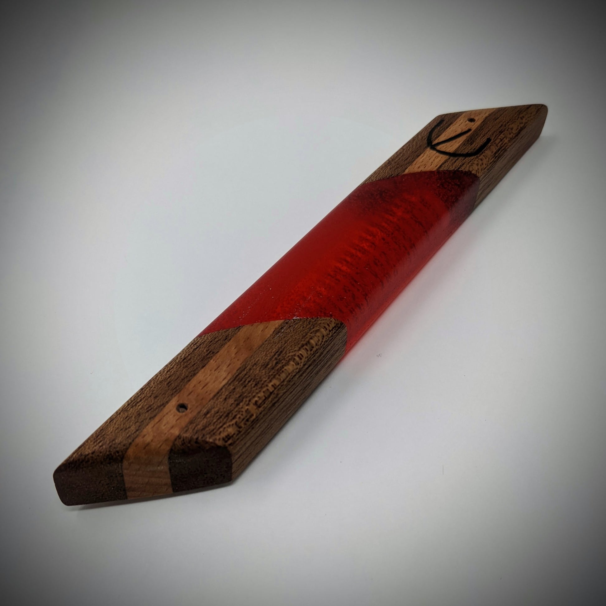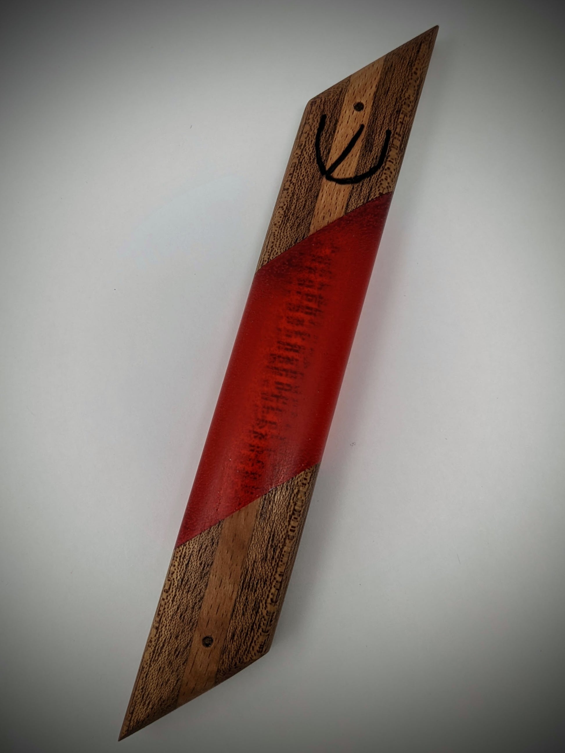 My signature hardwood and resin "window" mezuzah case is a perfect addition to any Jewish household. This one-of-a-kind mezuzah is made from mahogany with a beautiful stripe of beach wood and bright red resin. The clear resin allows you to see the scroll inside! A perfect gift for Bar/ Bat Mitzvah's, holidays, weddings or any other occasion. My mezuzot are all finished with natural beeswax and citrus oil.