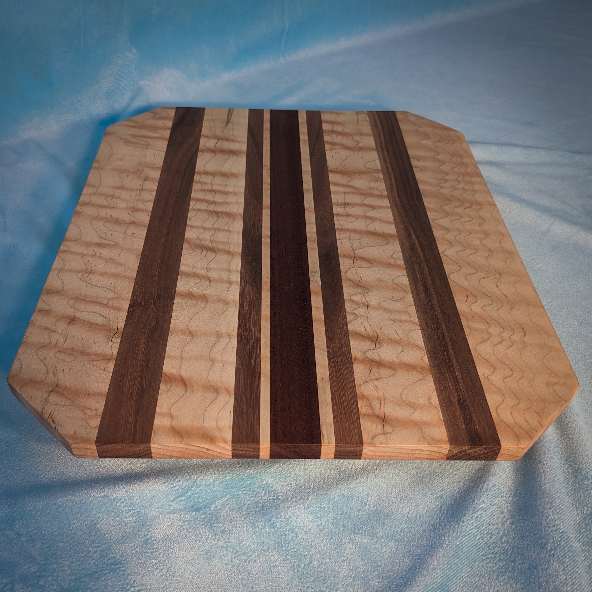 This smaller cutting board is a fantastic piece for your kitchen. It is made by hand with stripes of inch and a half thick curly maple, American walnut, and sapele. Excellent for cutting, prepping or serving any food in the kitchen or on the table! The small cracks in the surface of the curly maple have been filled with epoxy to ensure this board will last generations and look fantastic the whole time.