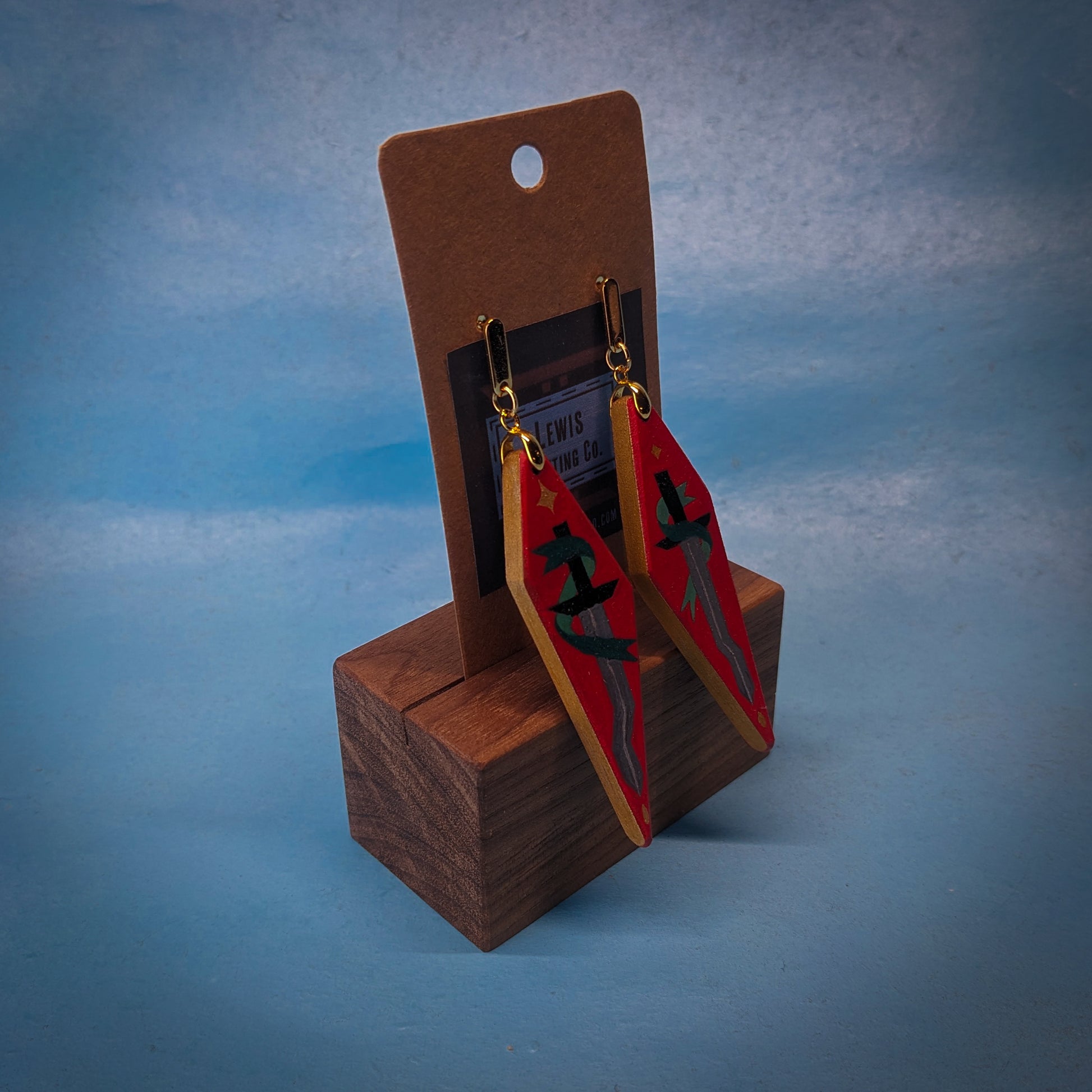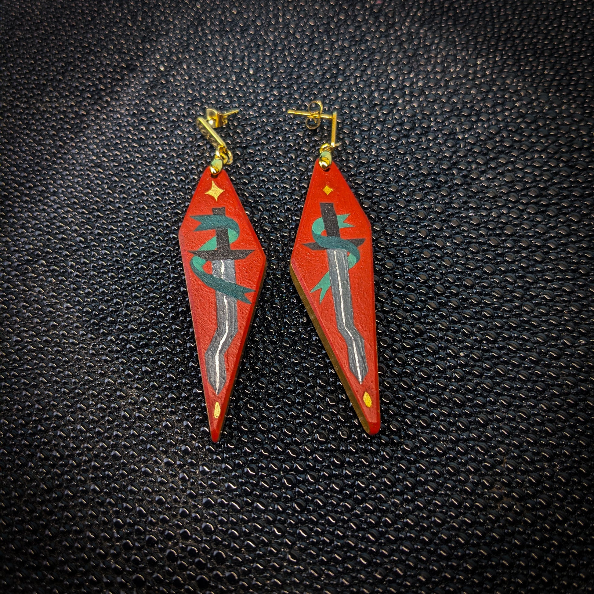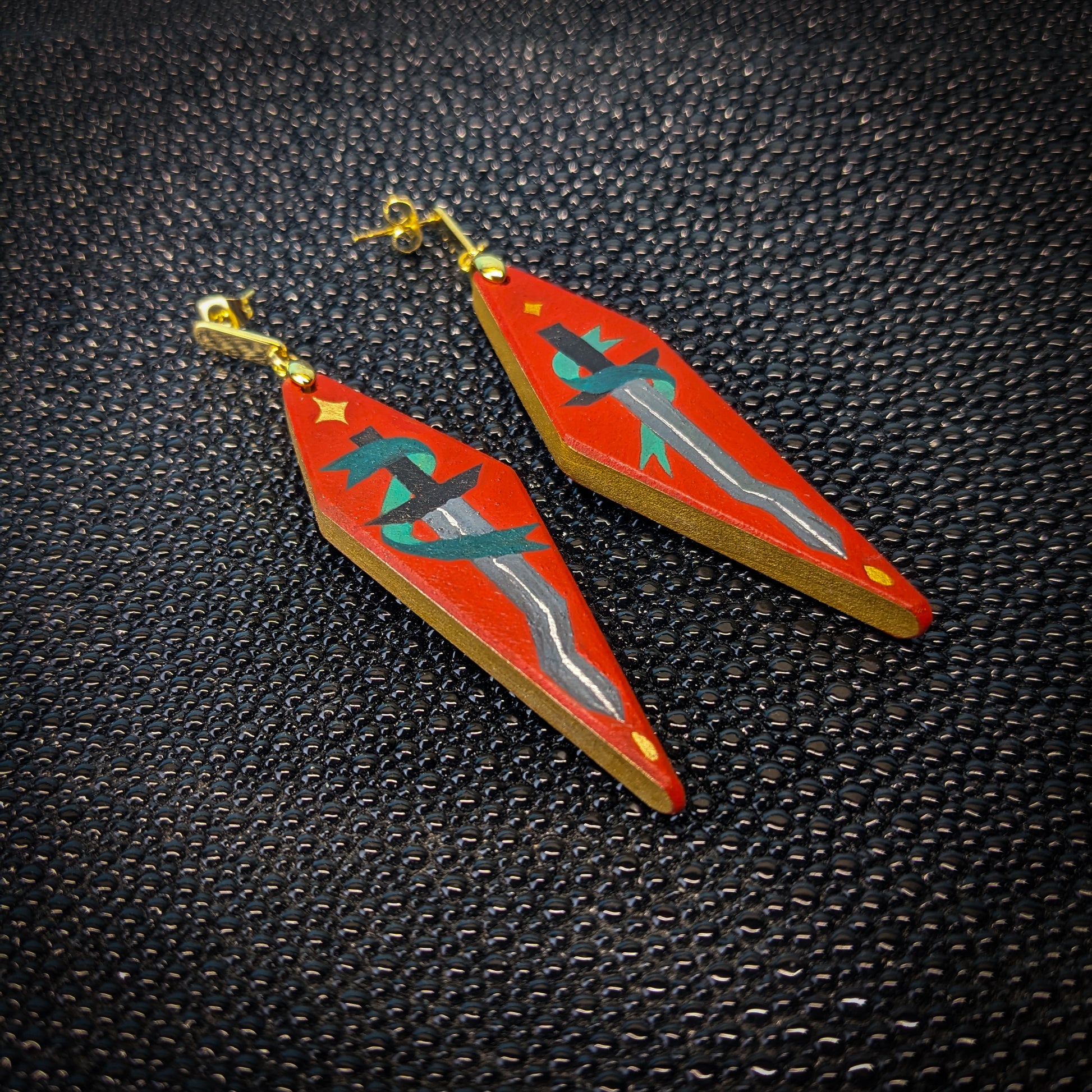 Handmade, lightweight, one of a kind, painted hardwood dangle earrings! I hand cut these earrings from poplar wood, sanded them and then handed them over to Kate (@fearsomebeast) who painted these beautiful swords.