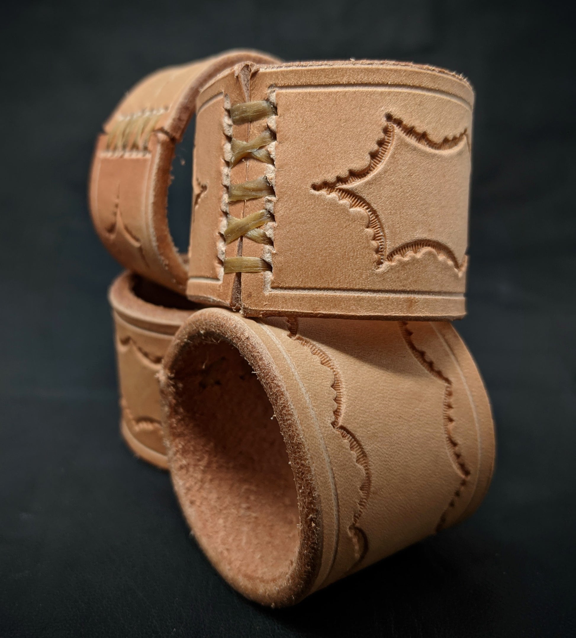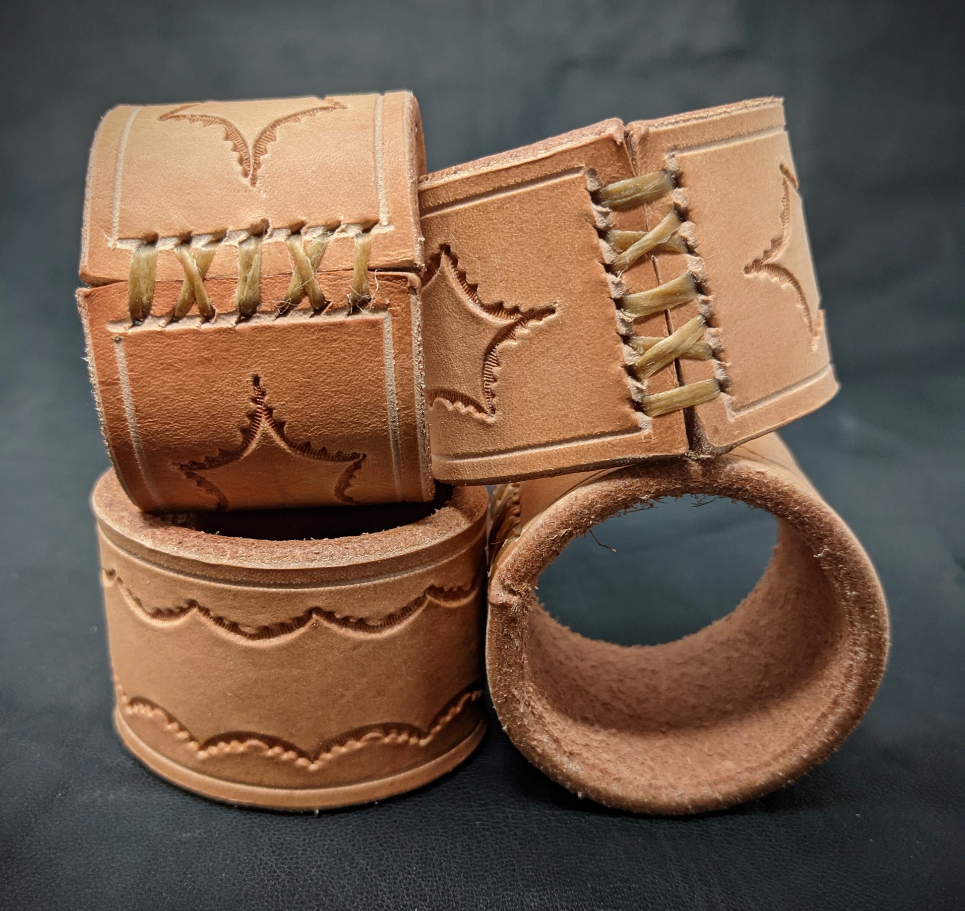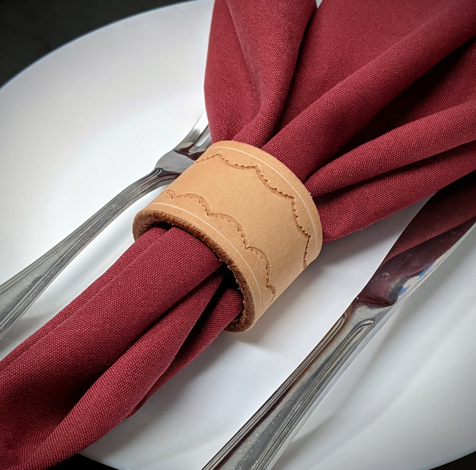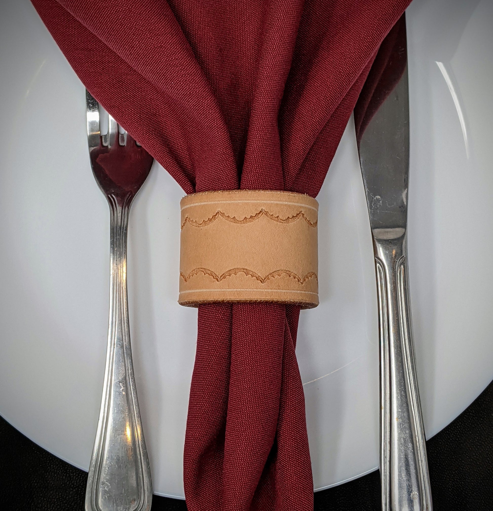 Impress your guests with these hand tooled leather napkin rings. These four napkin rings are made of sturdy, high quality leather and add a warm, rustic look to your table setting. The perfect addition to a table for weddings, parties or every night dinner.
