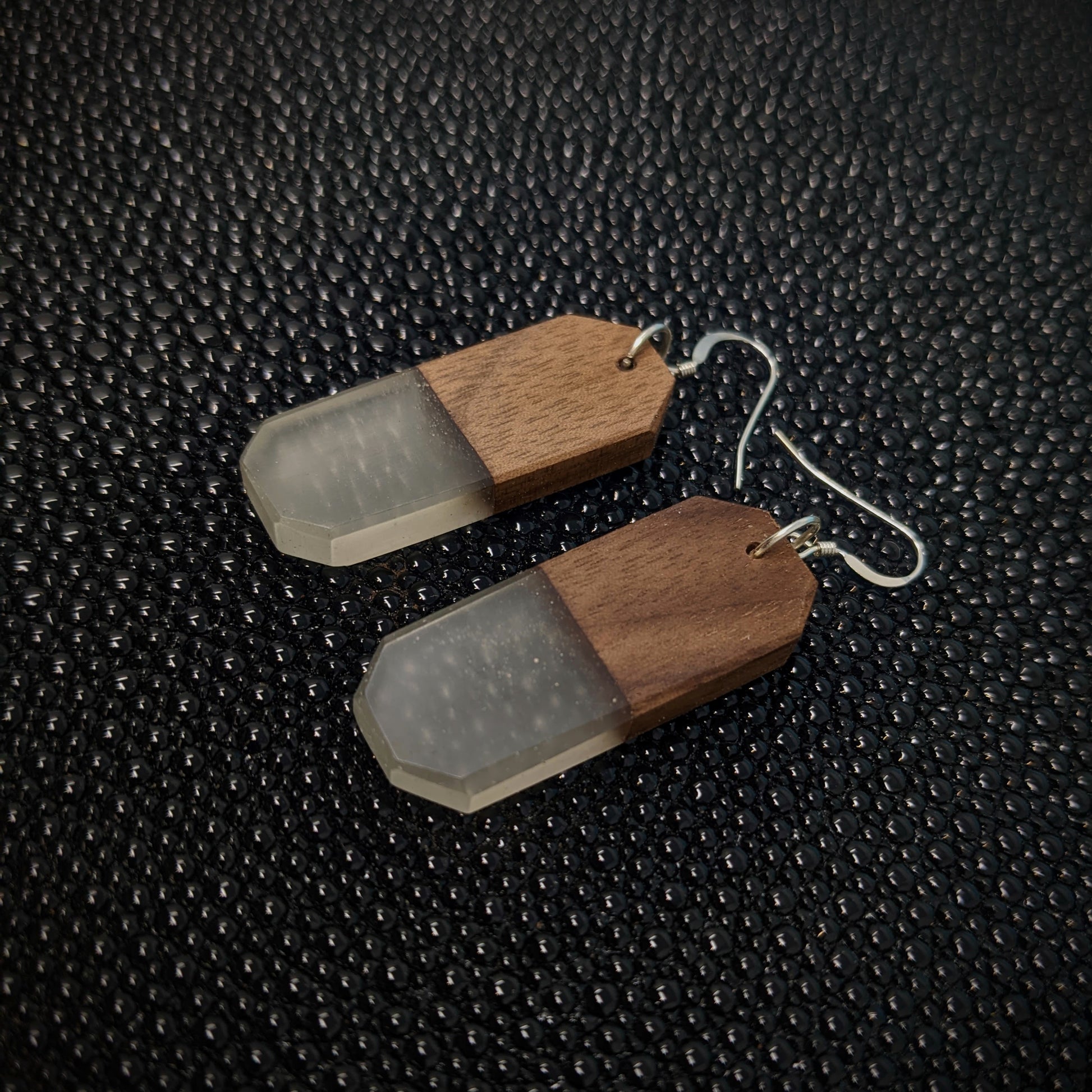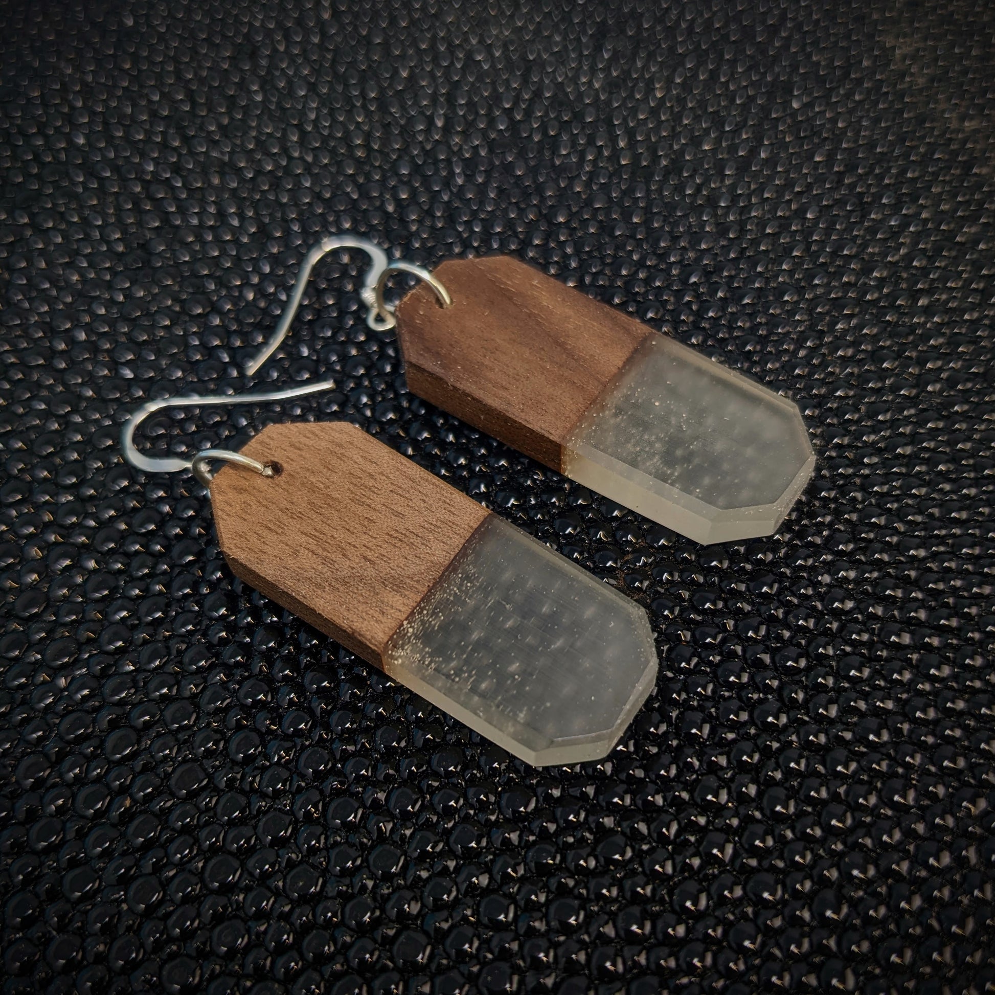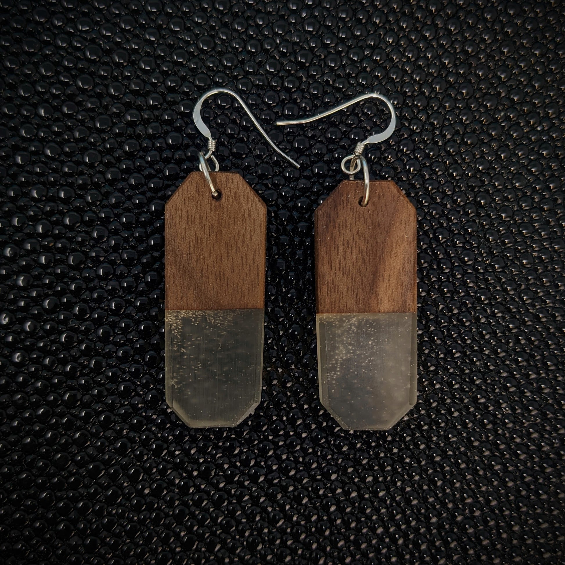 These earrings are made from walnut, and clear resin!