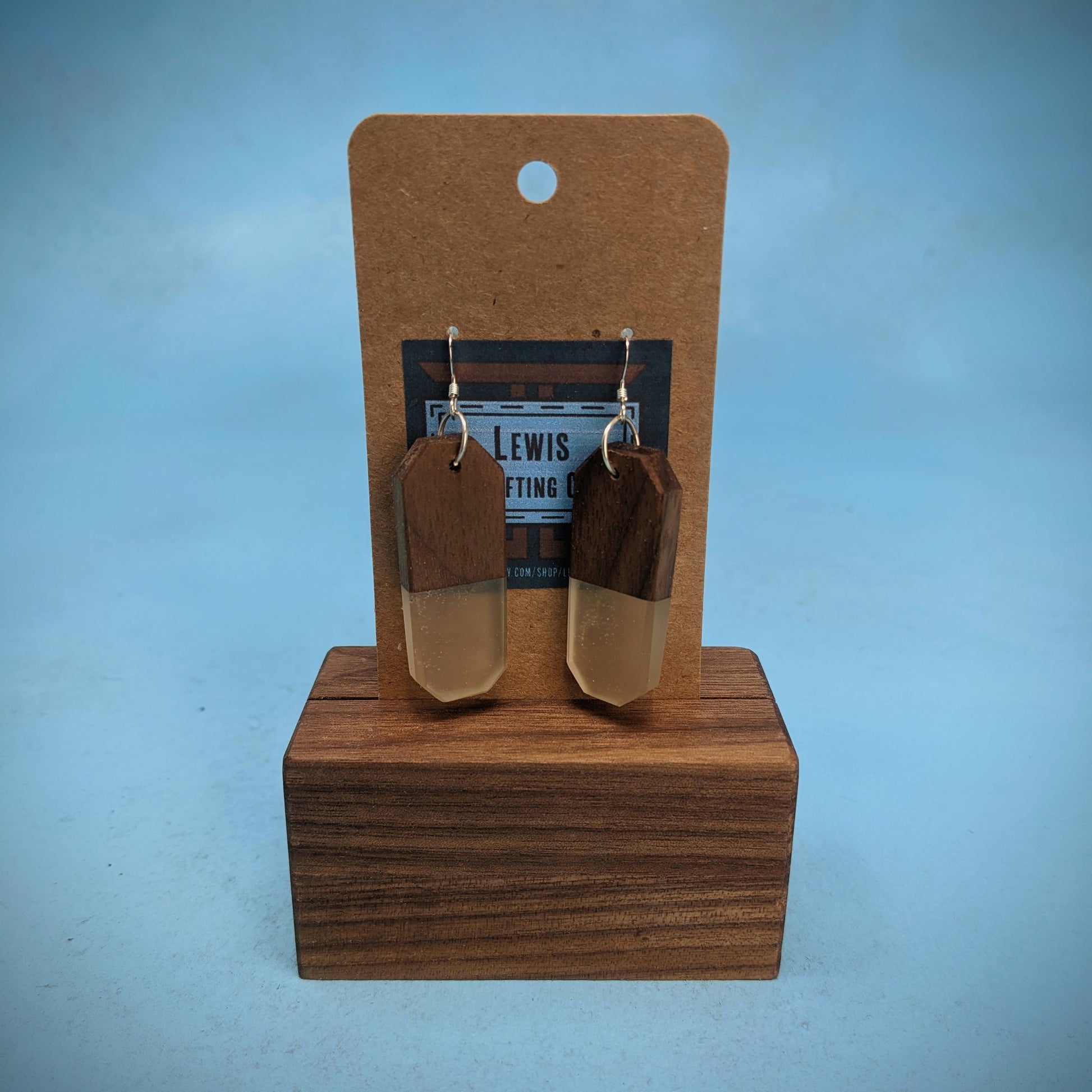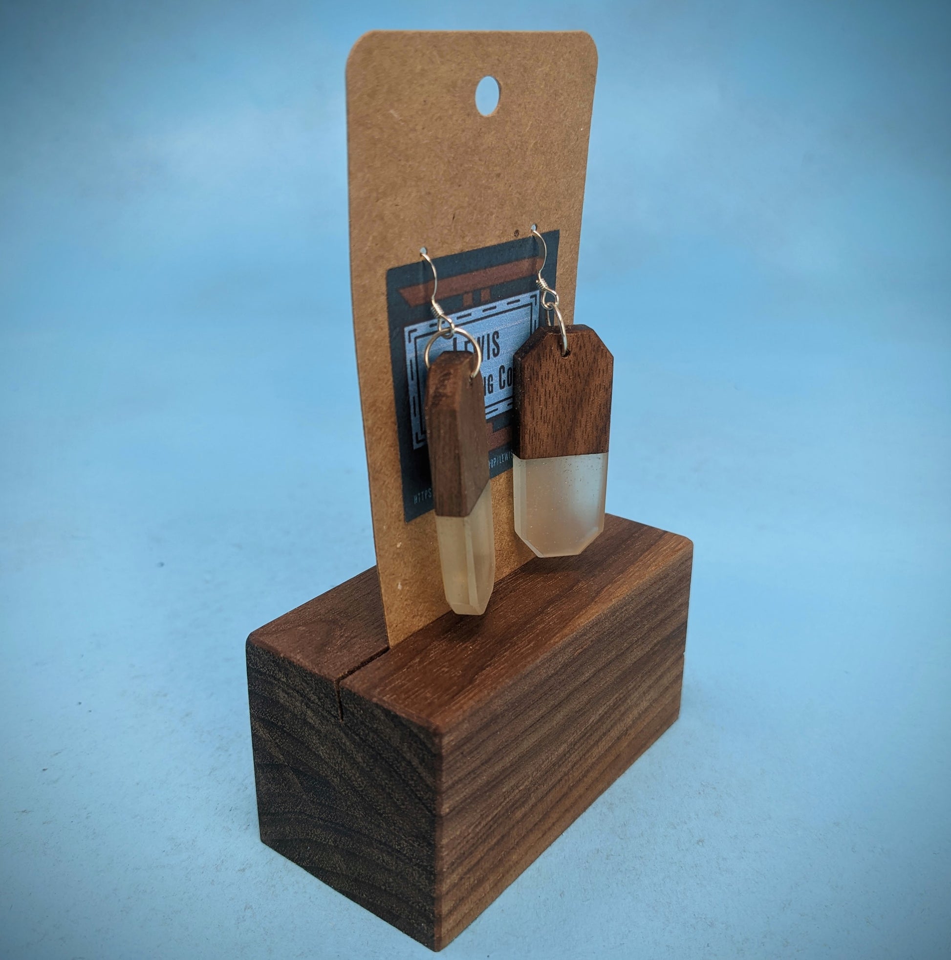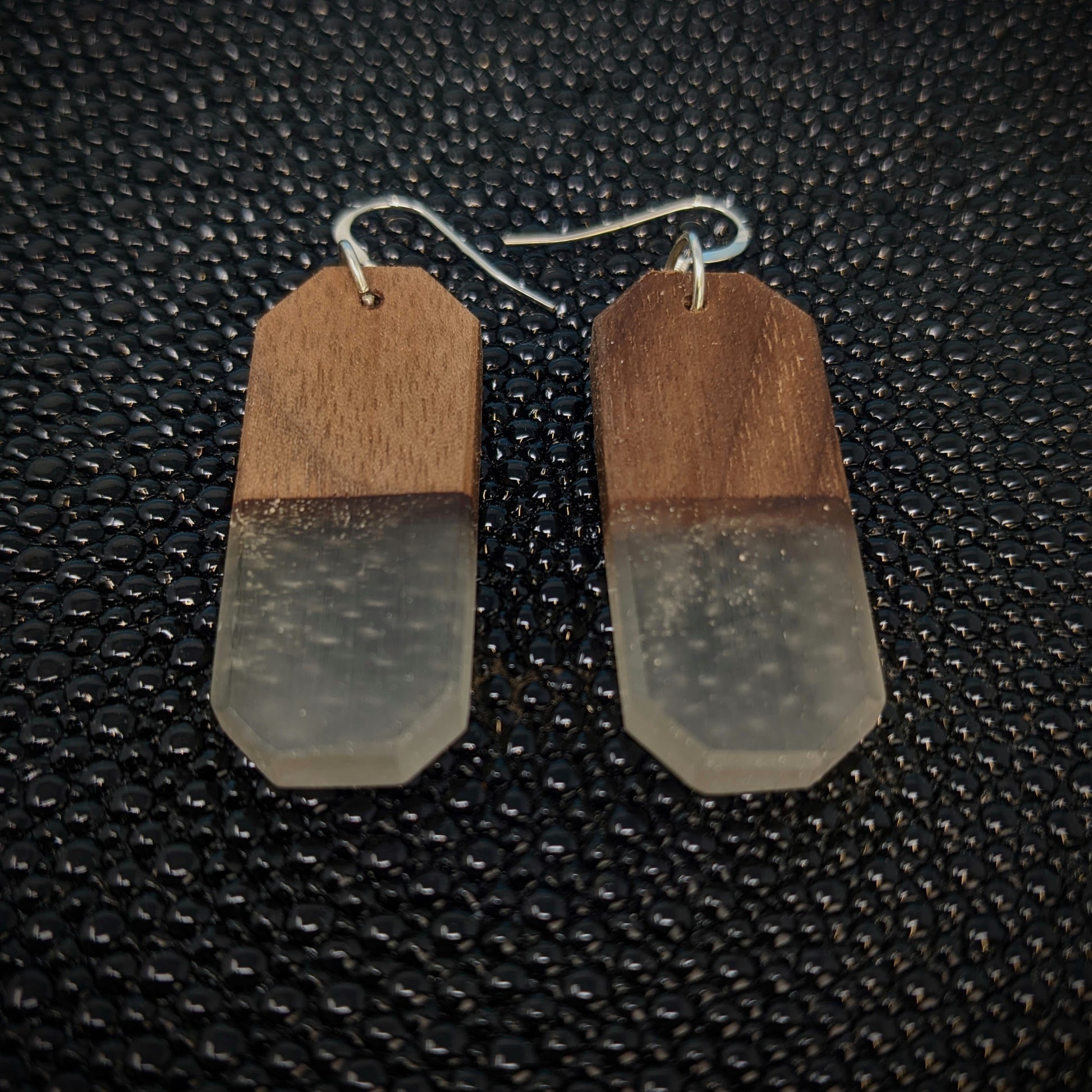 These earrings are made from walnut, and clear resin!