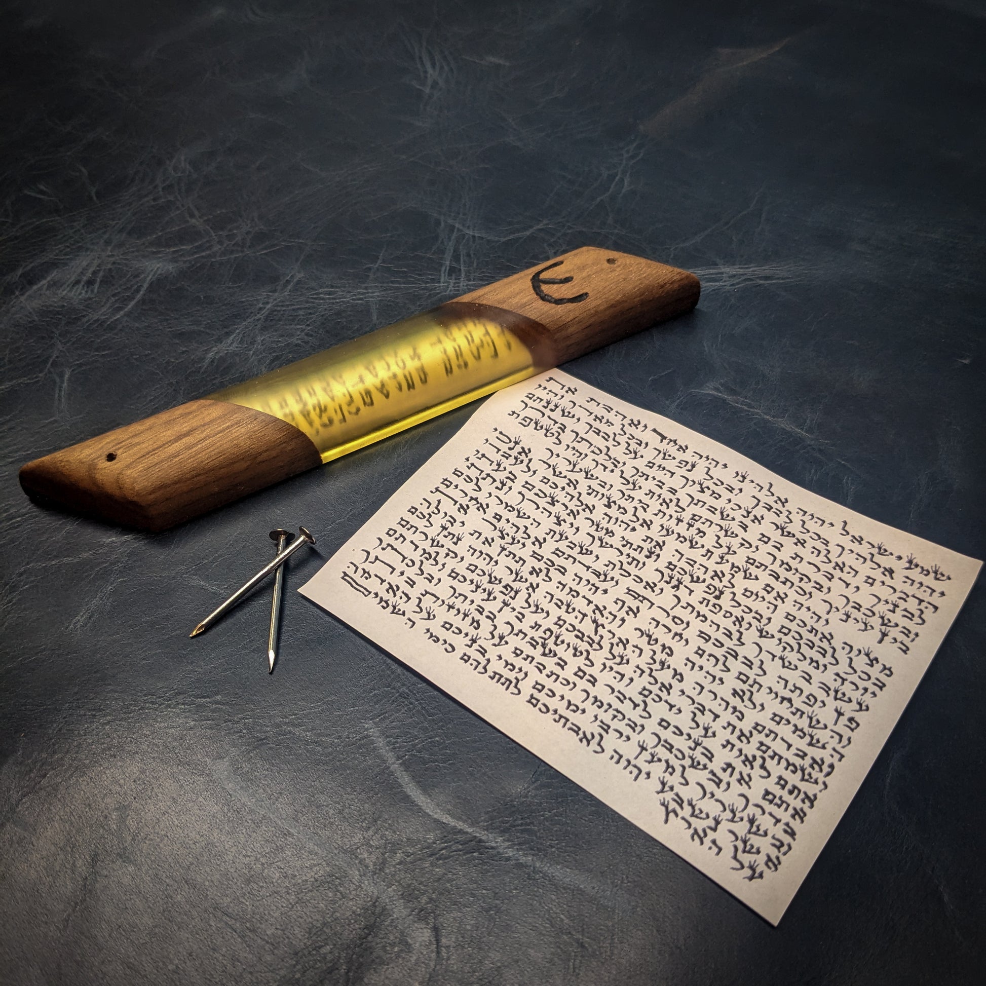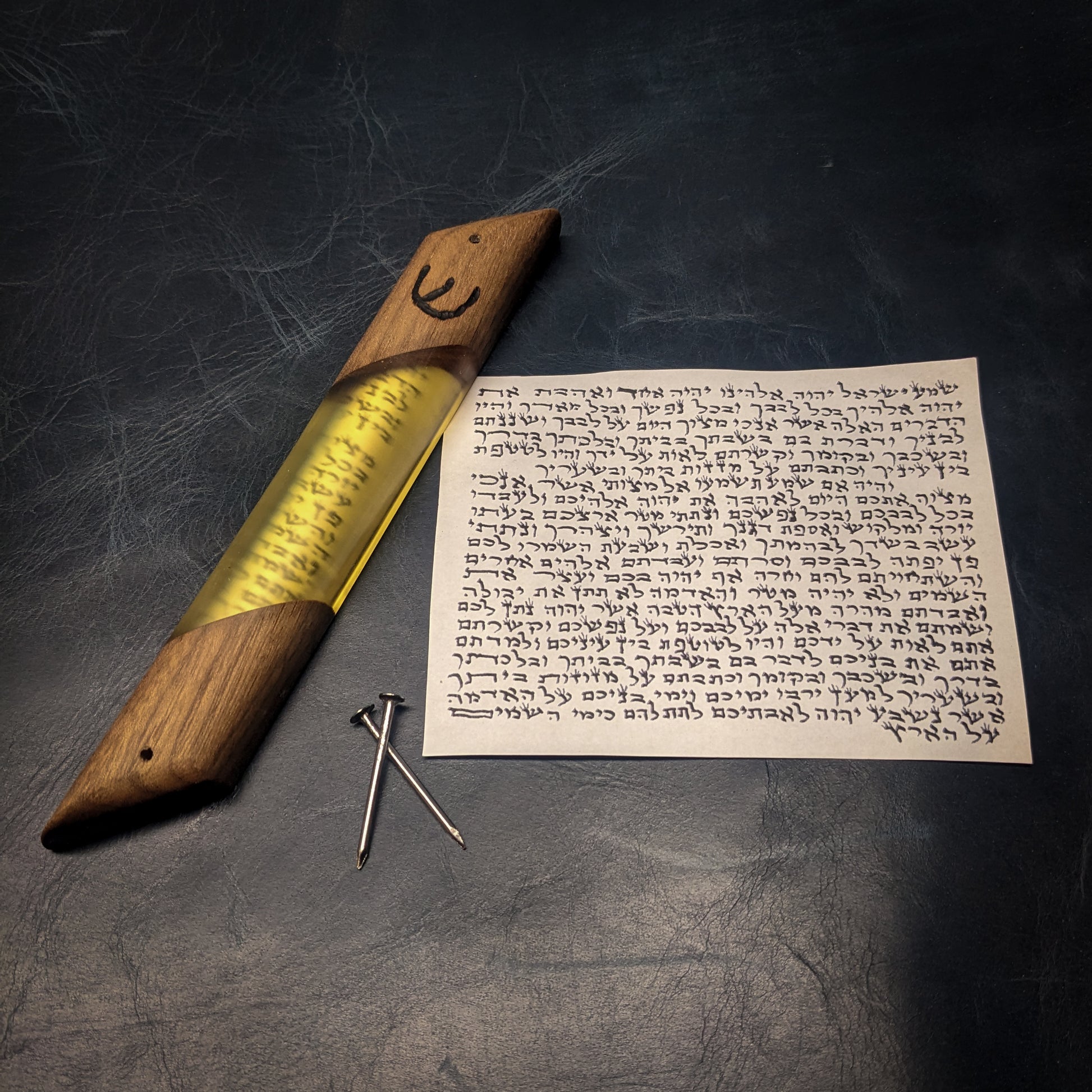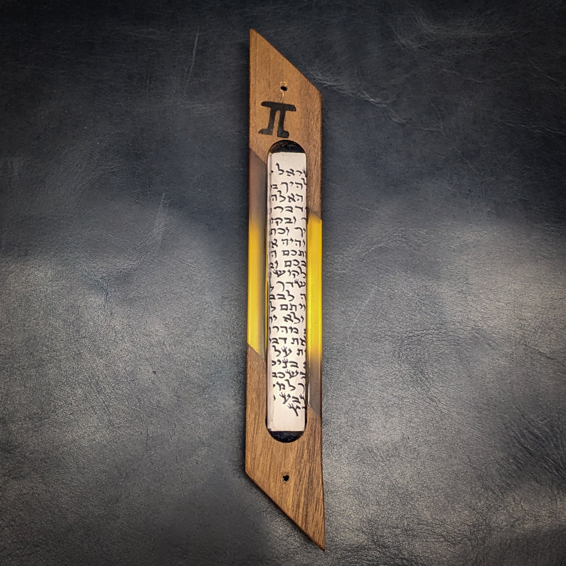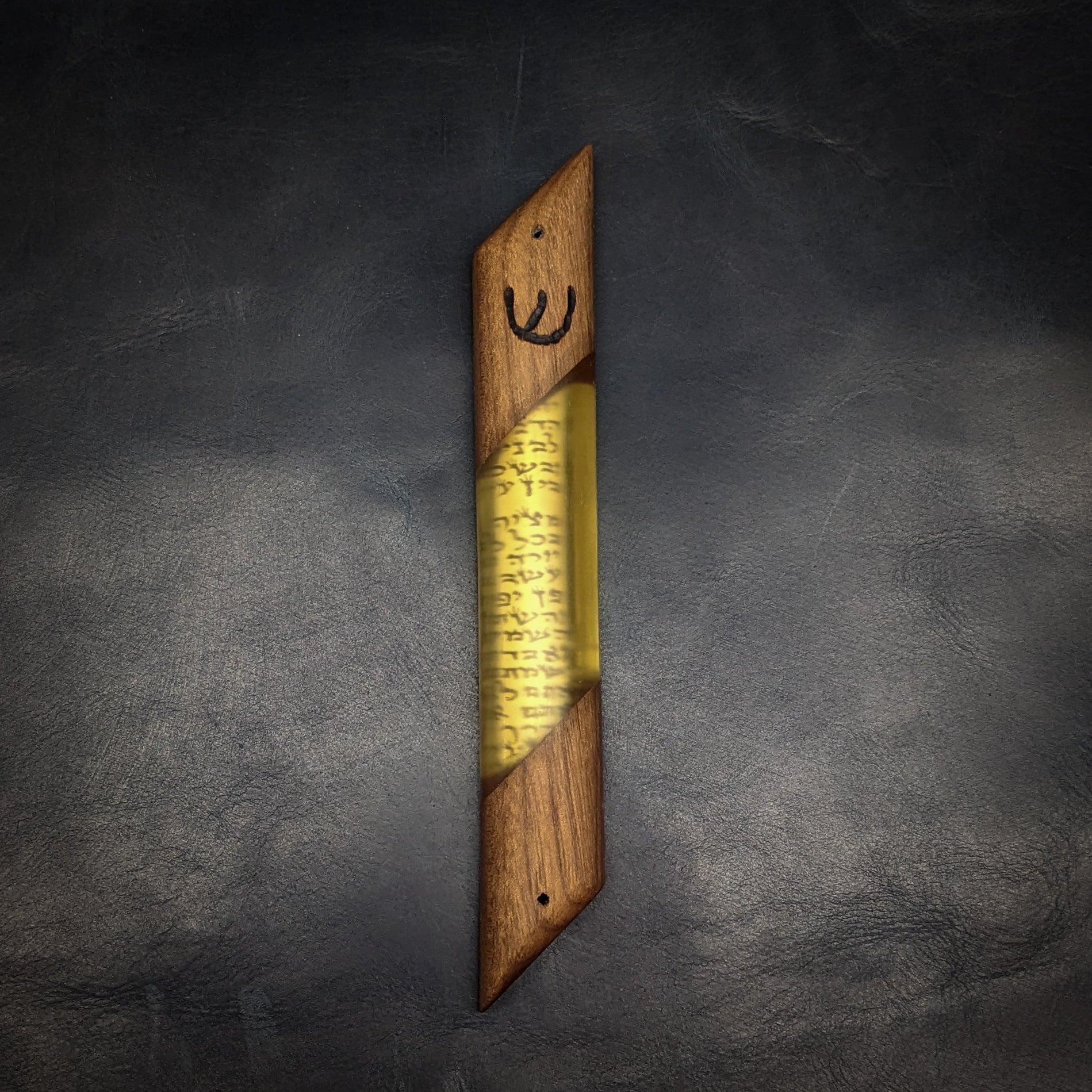 My signature hardwood and resin "window" mezuzah case is a perfect addition to any Jewish household. This one-of-a-kind mezuzah is made from black walnut and and yellow resin. The clear resin allows you to see the scroll inside! A perfect gift for Bar/Bat Mitzvah's, holidays, weddings or any other occasion. My mezuzot are all finished with natural beeswax and citrus oil.