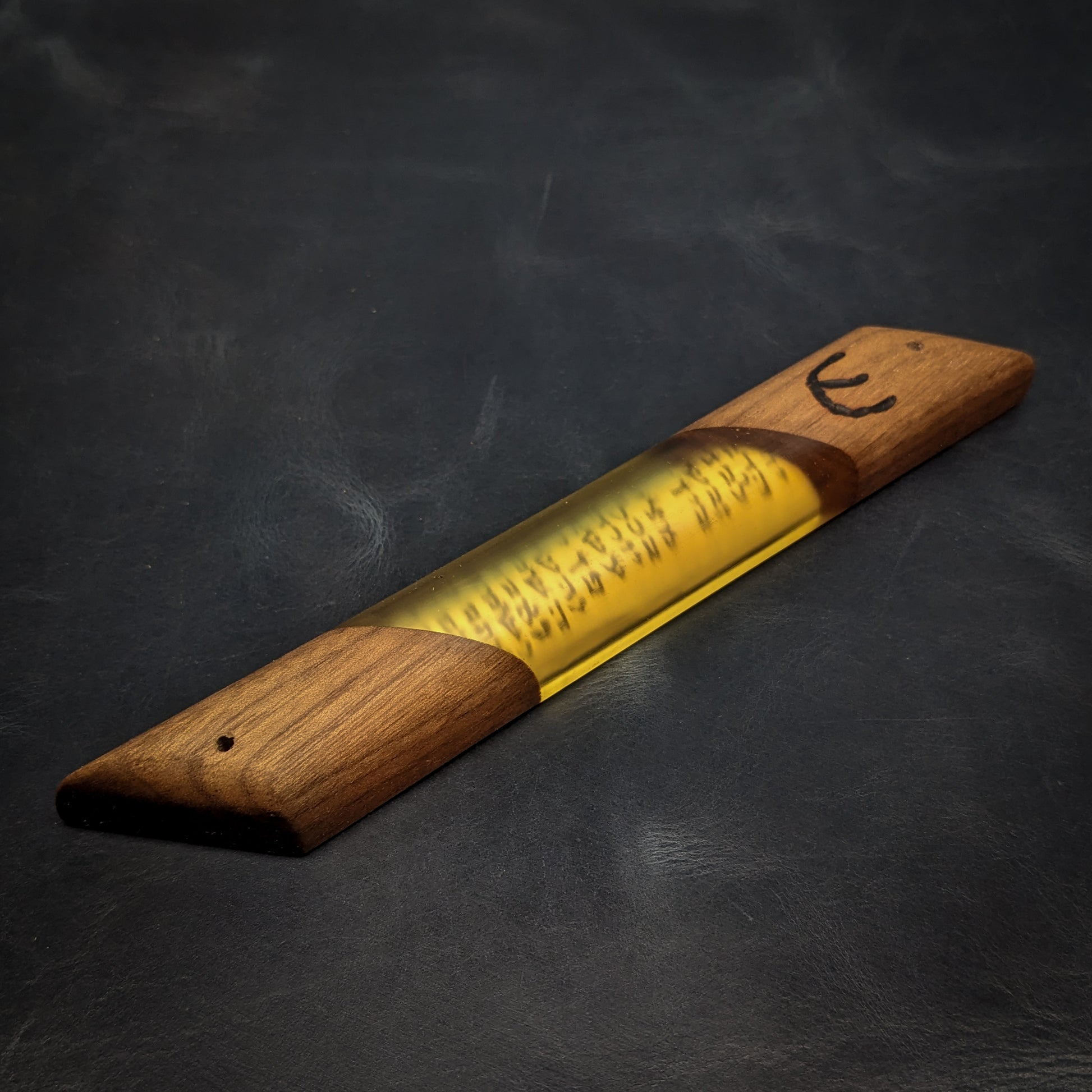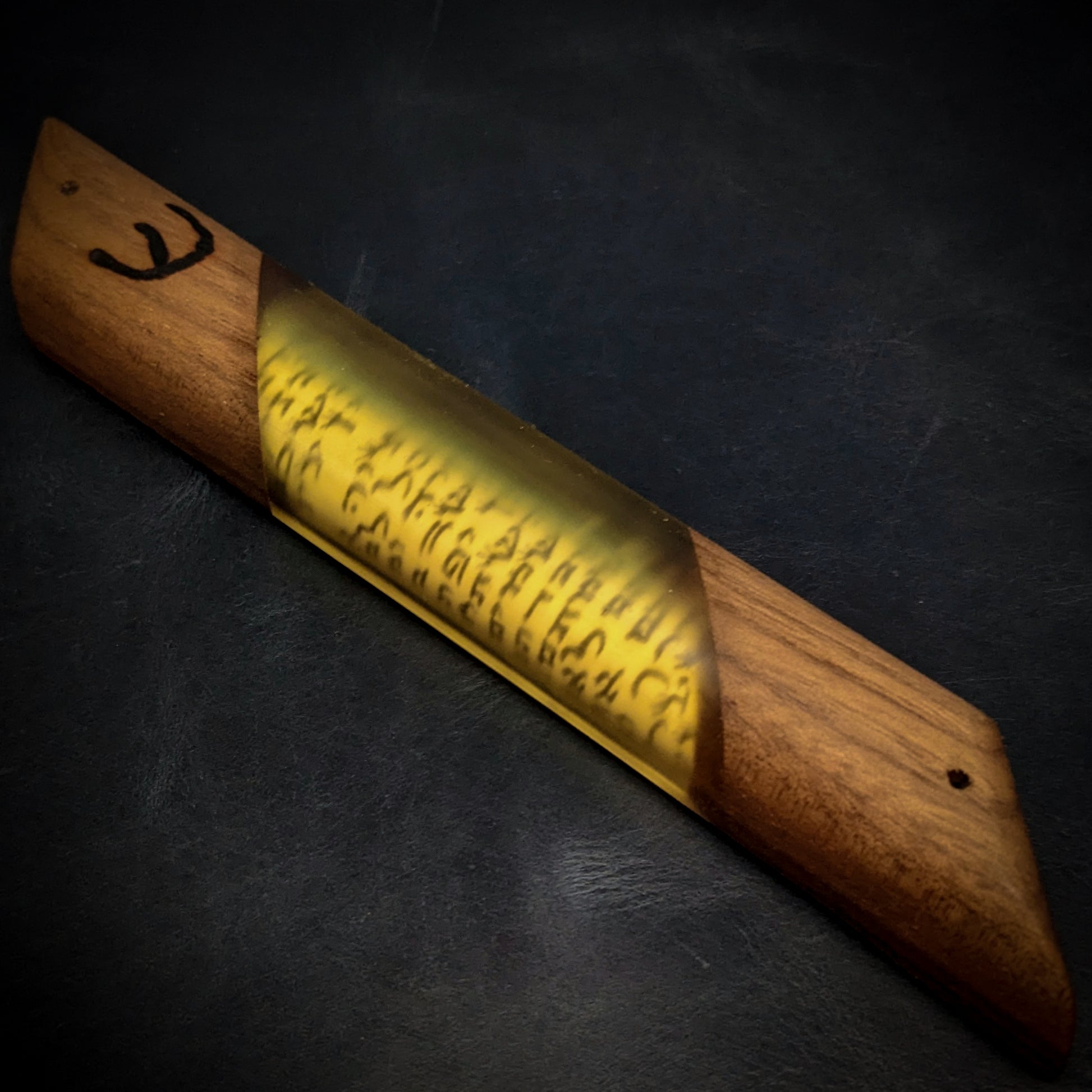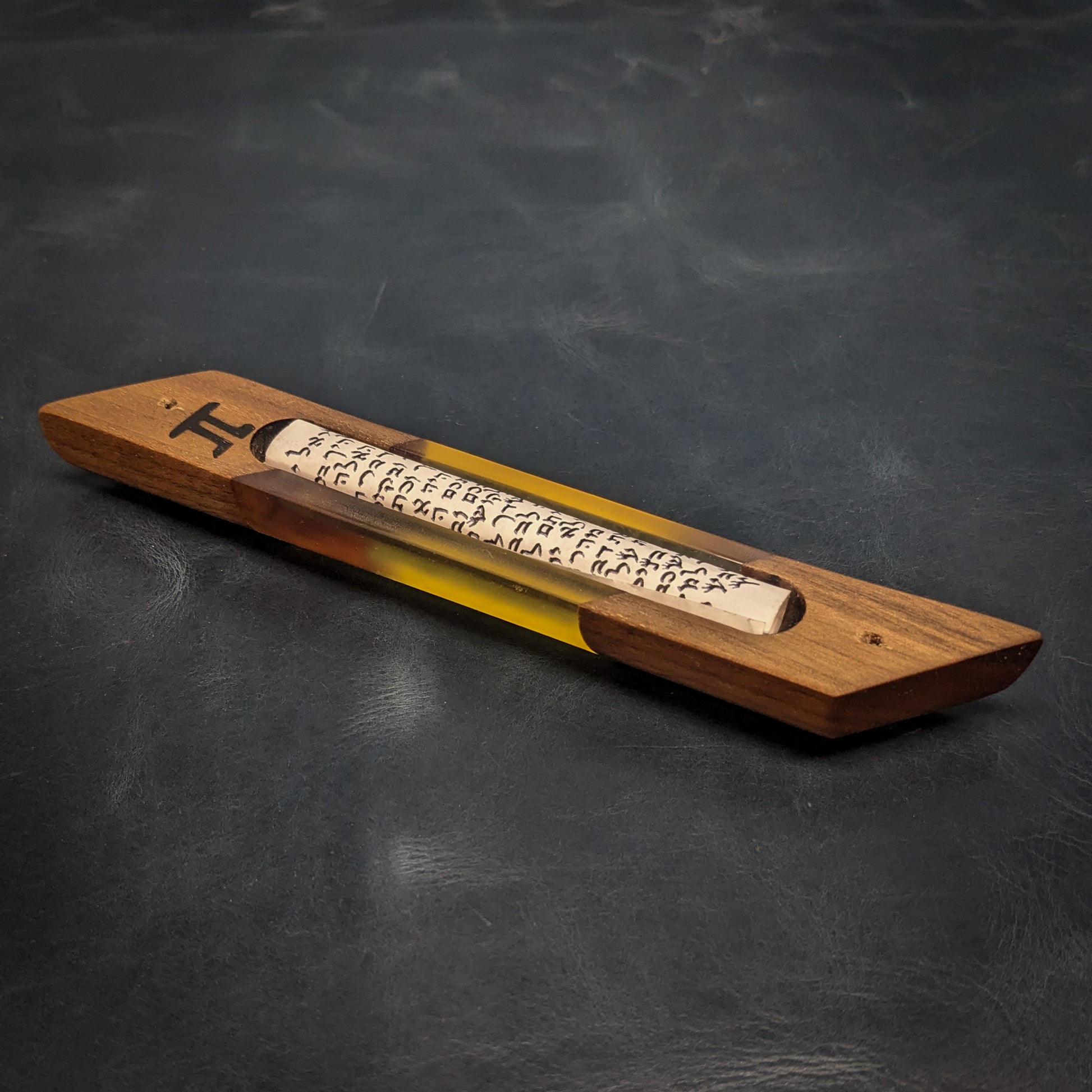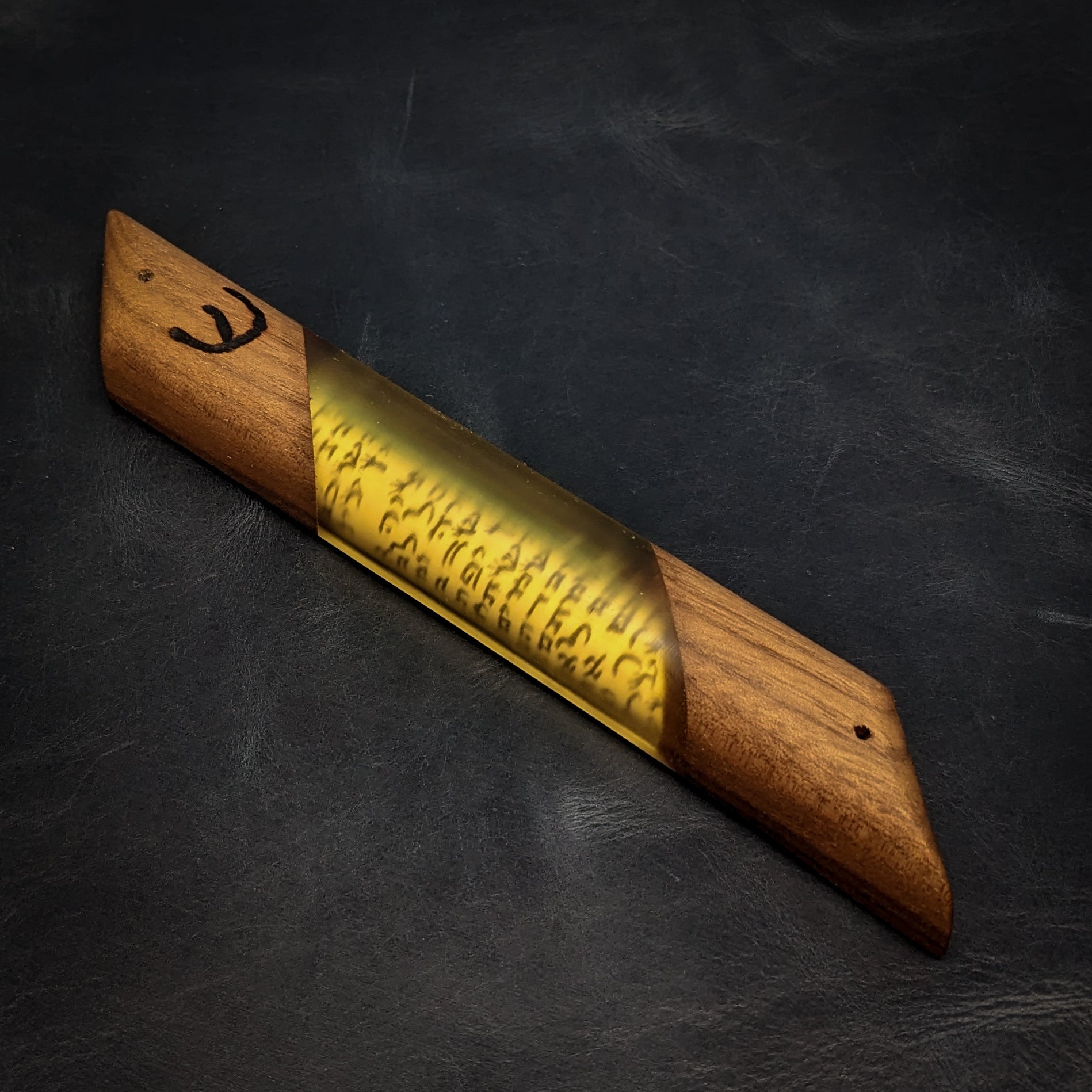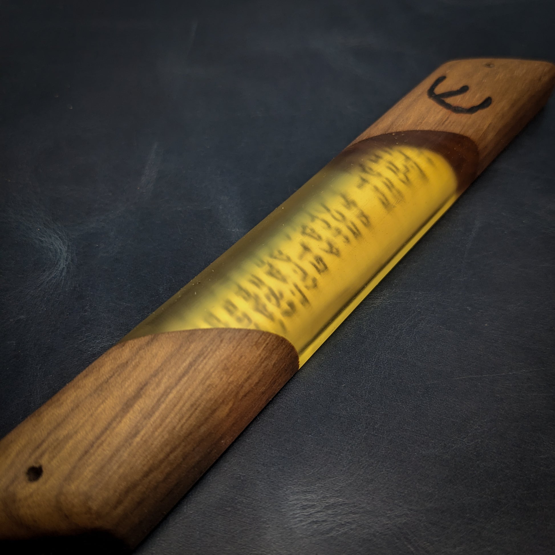 My signature hardwood and resin "window" mezuzah case is a perfect addition to any Jewish household. This one-of-a-kind mezuzah is made from black walnut and and yellow resin. The clear resin allows you to see the scroll inside! A perfect gift for Bar/Bat Mitzvah's, holidays, weddings or any other occasion. My mezuzot are all finished with natural beeswax and citrus oil.